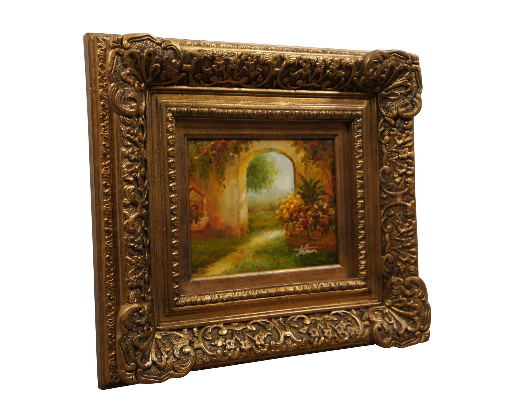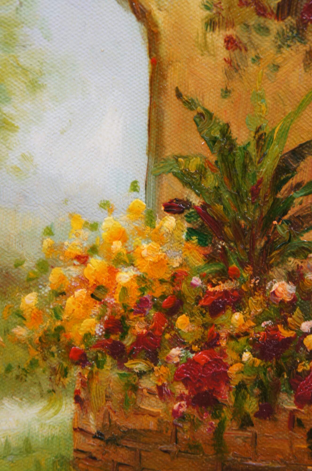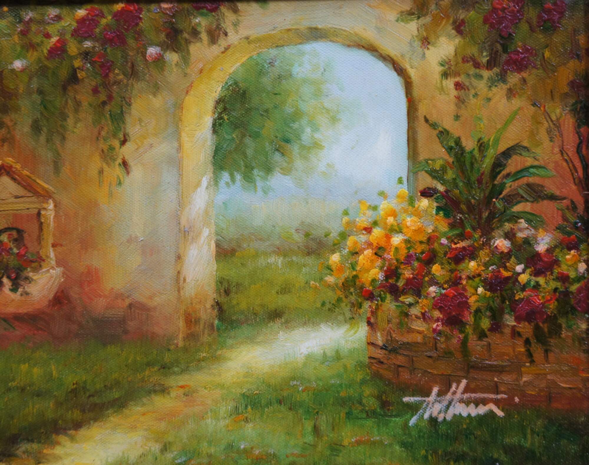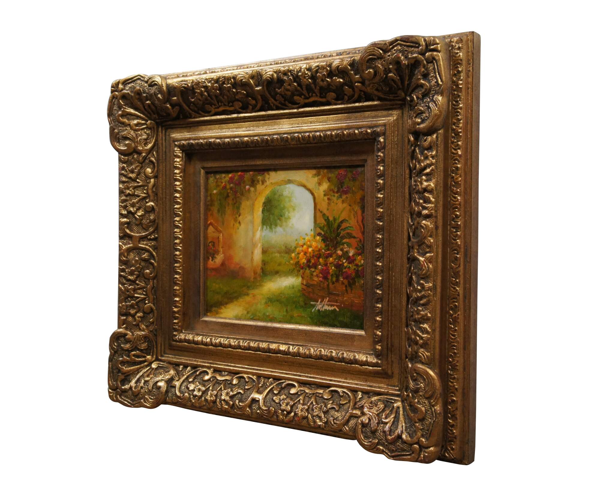Late 20th century landscape oil painting on canvas depicting a stone archway in a flowering European / French / Italian garden. Signed in lower right corner. Produced by Timeless Treasures. Certificate of Authenticity Number AFD130138. Molded scallop and floral frame with antiqued gold finish.