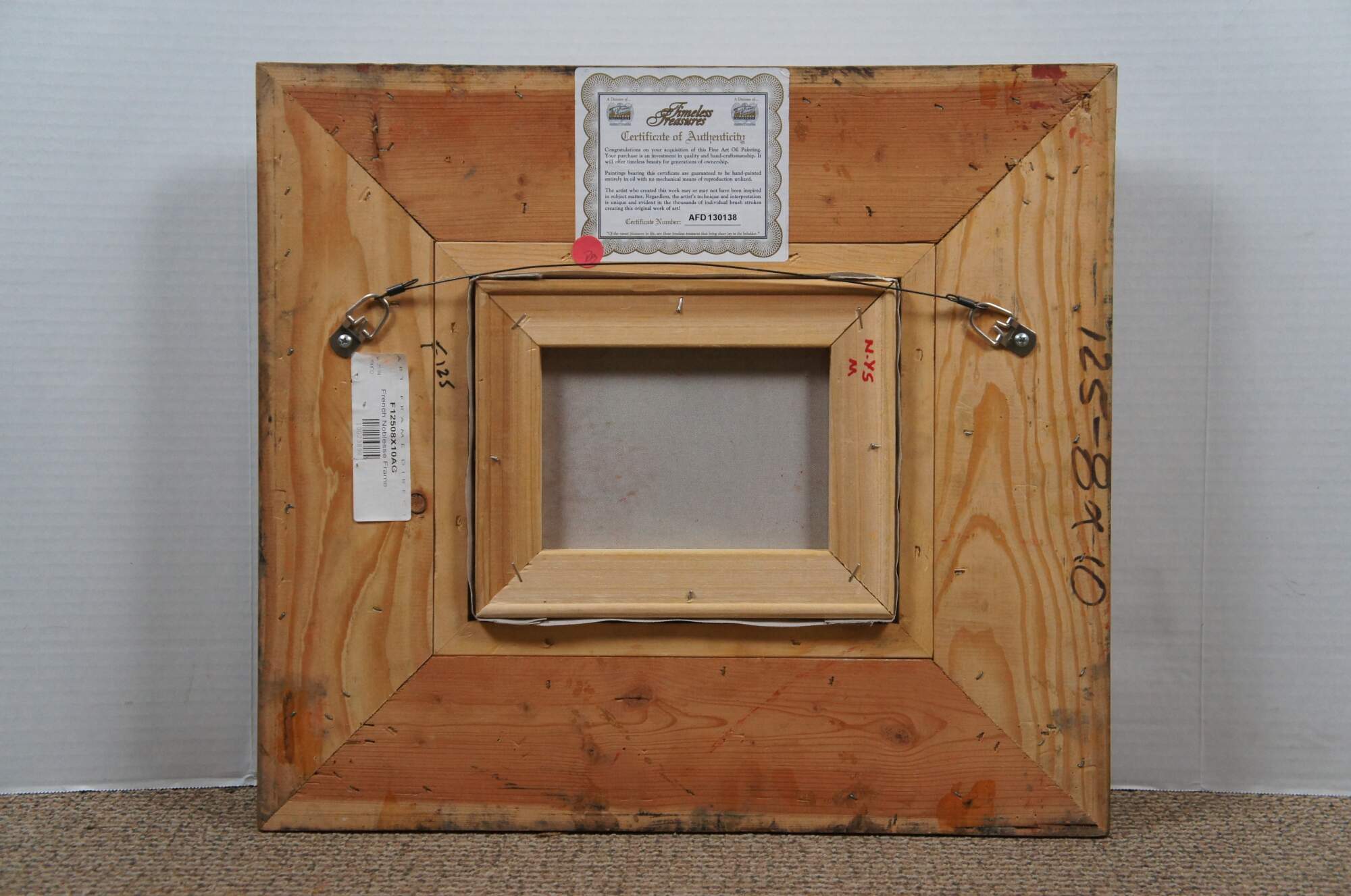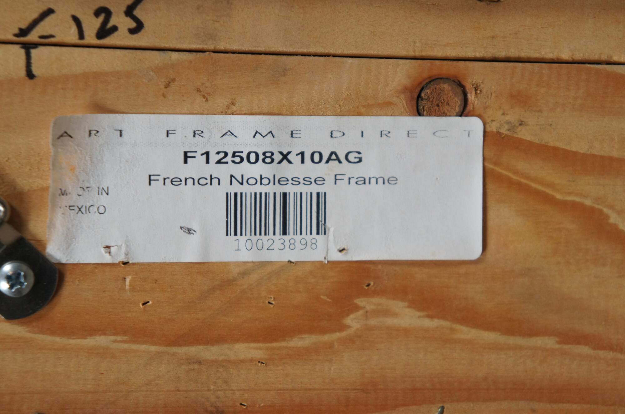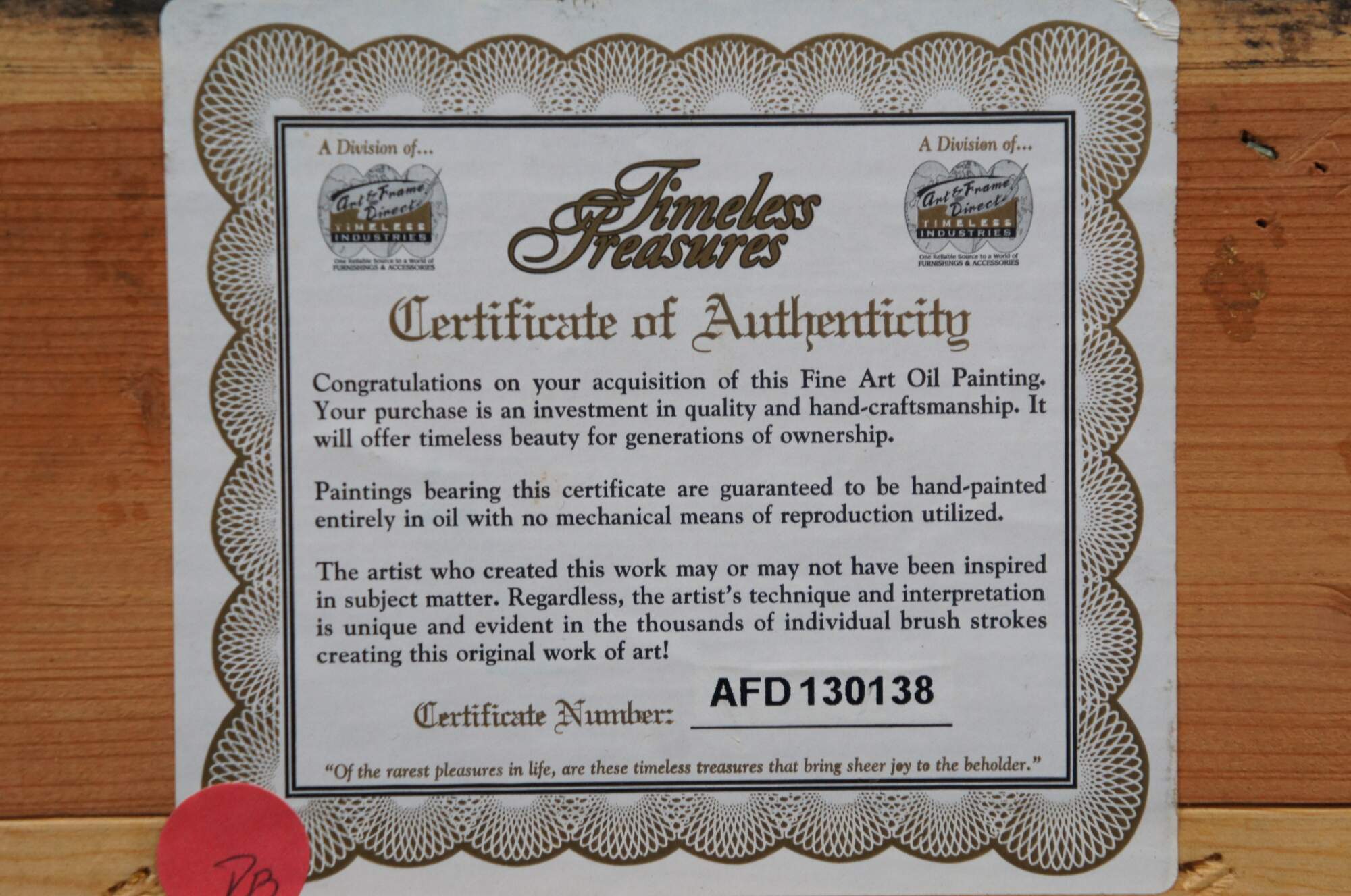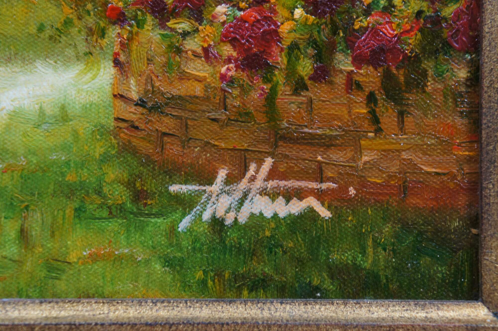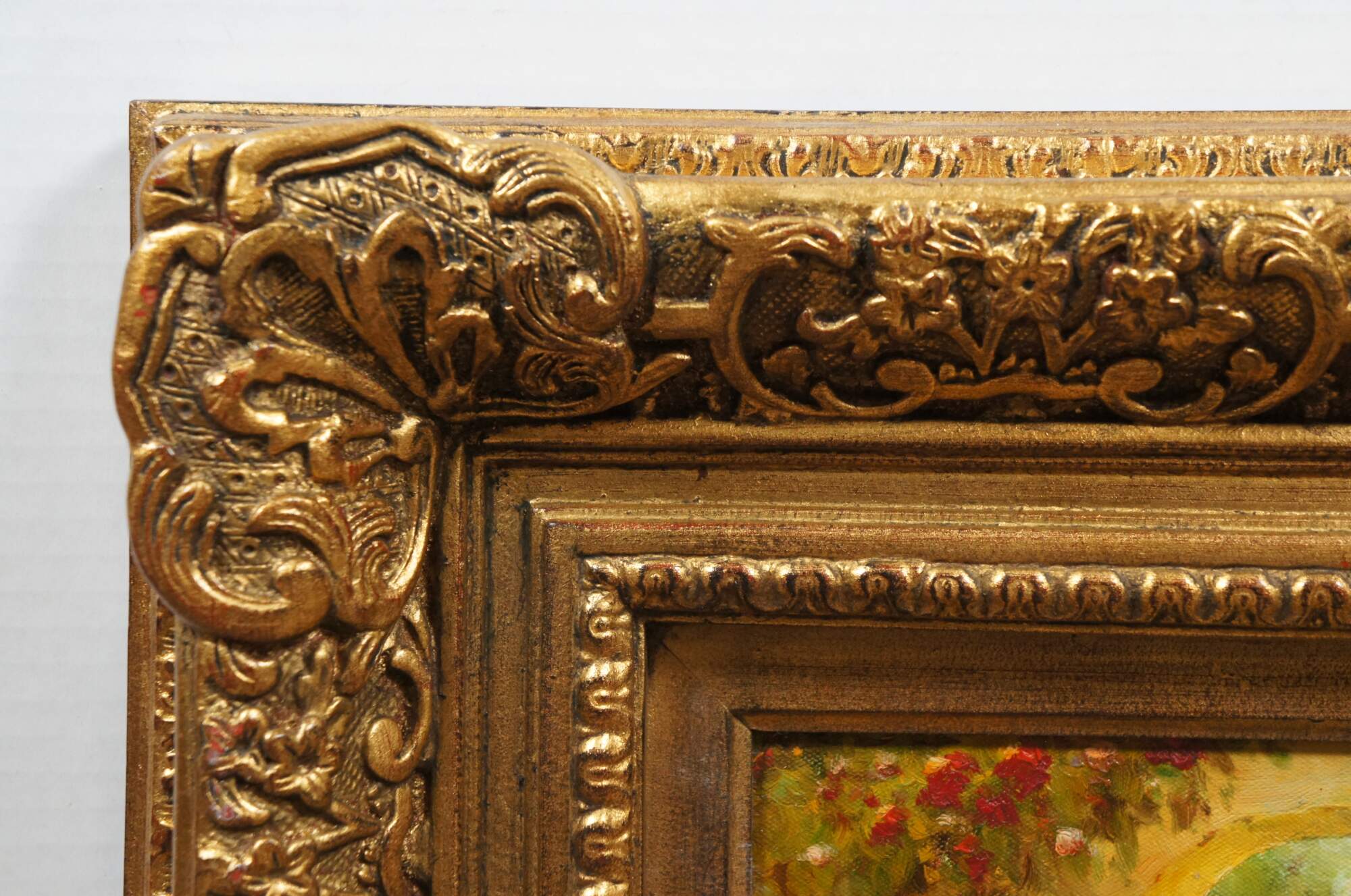 Late 20th century landscape oil painting on canvas depicting a stone archway in a flowering European / French / Italian garden. Signed in lower right corner. Produced by Timeless Treasures. Certificate of Authenticity Number AFD130138. Molded scallop and floral frame with antiqued gold finish.