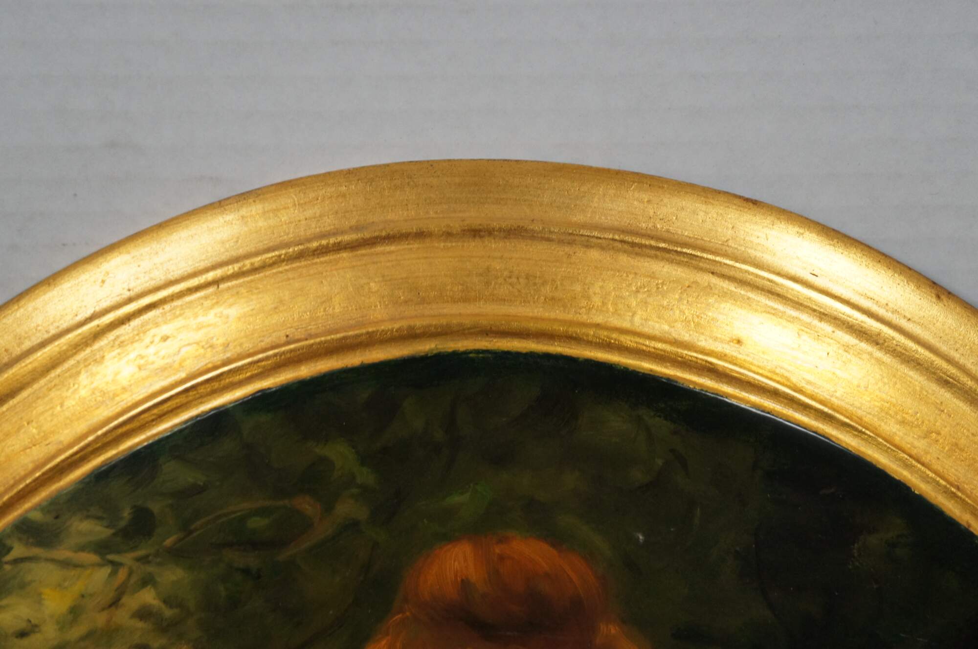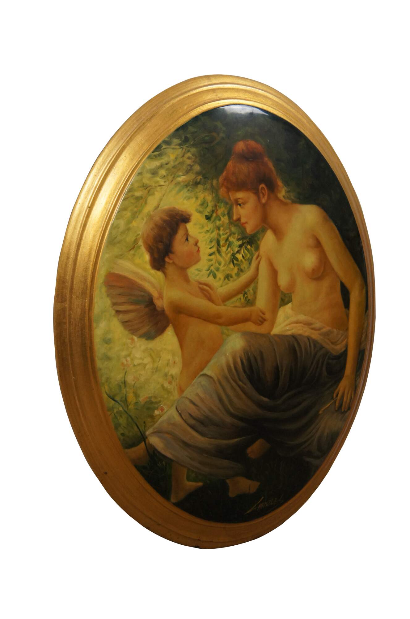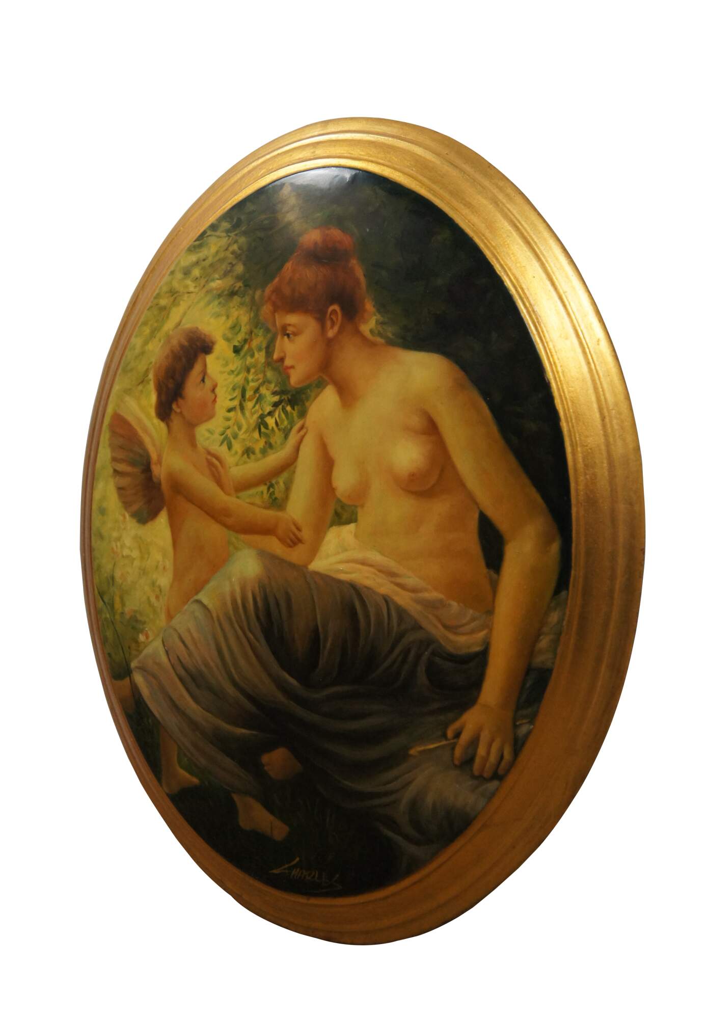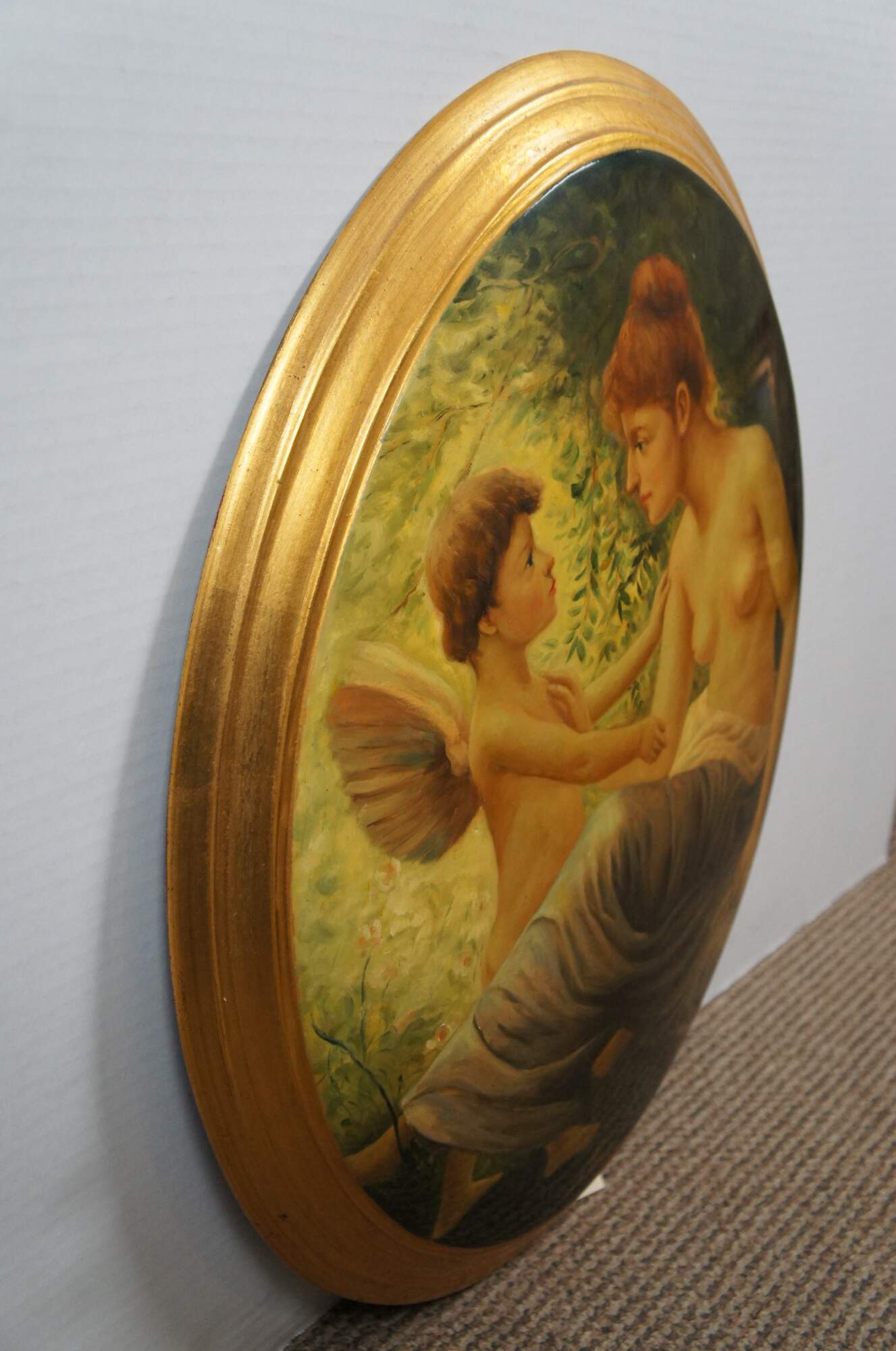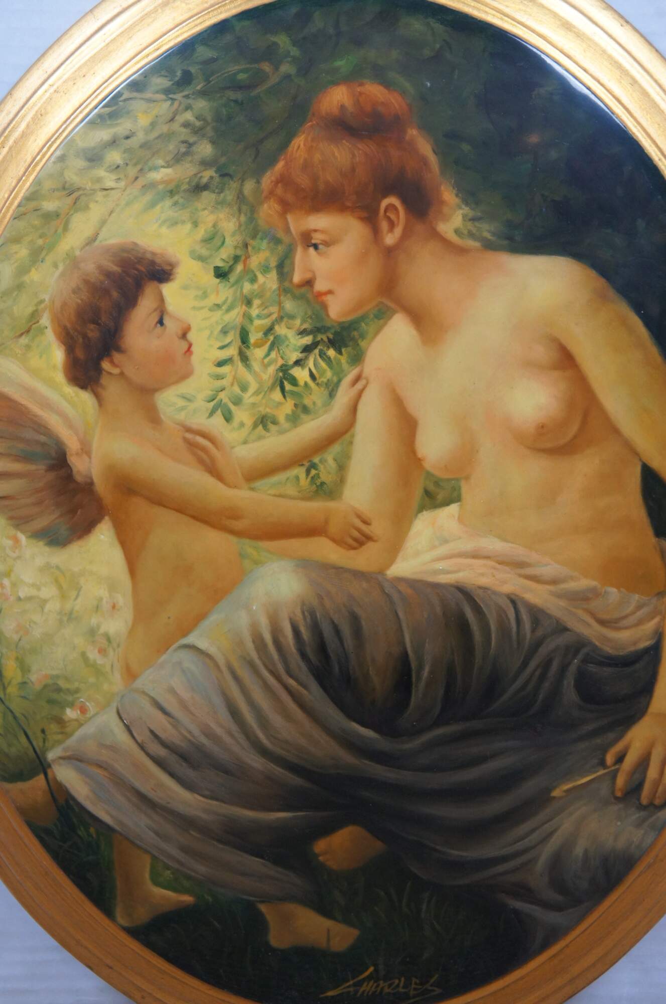 Mid to late 20th century oval portrait oil painting on wood titled Love Disarmed; depicting a young Cupid with his mother Aphrodite / Venus (Eros and Venus) in a simple leaf framed landscape. Signed Charles along lower edge. Painted on a wood panel with convex surface and ridged, gold painted border.