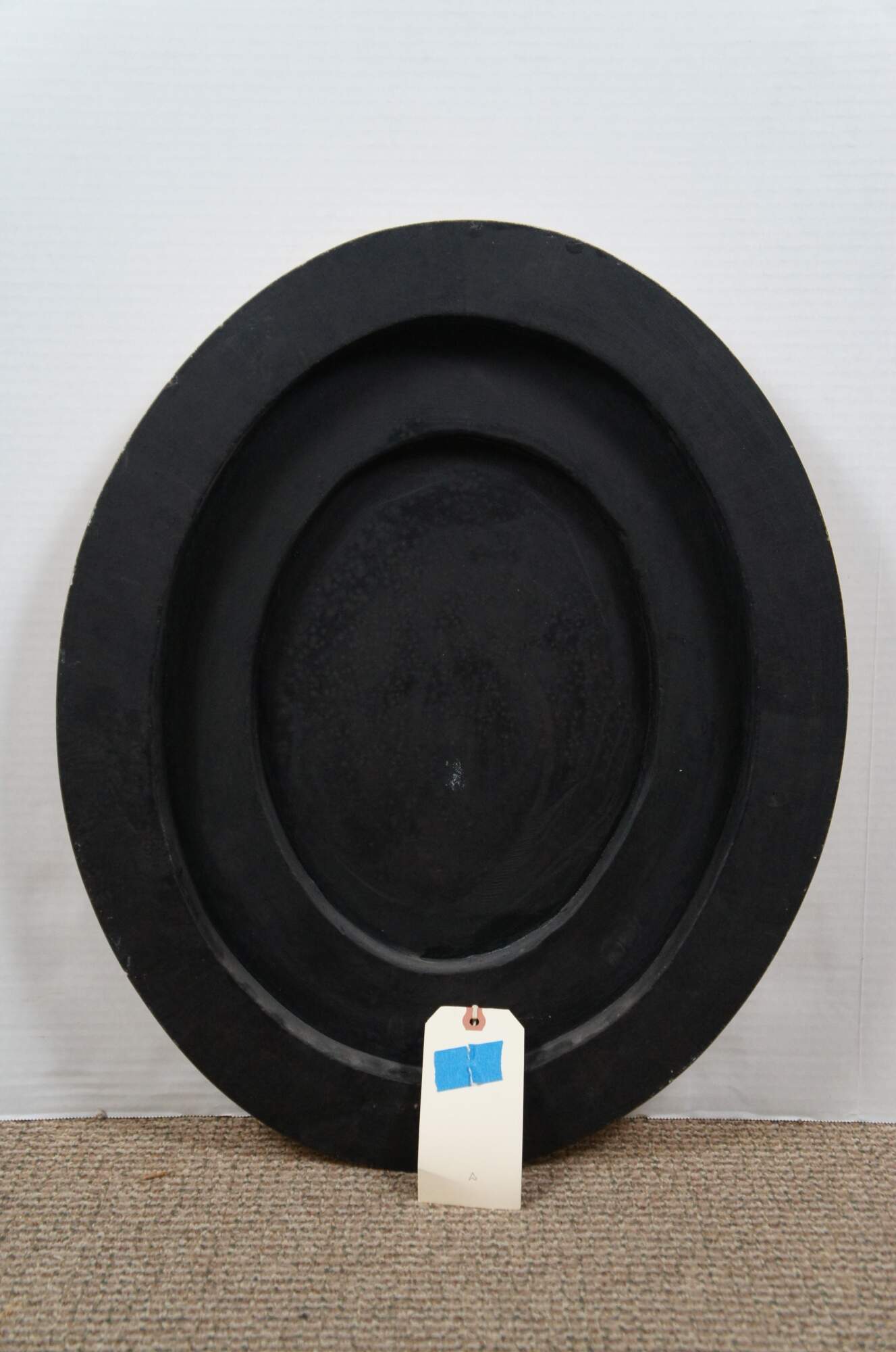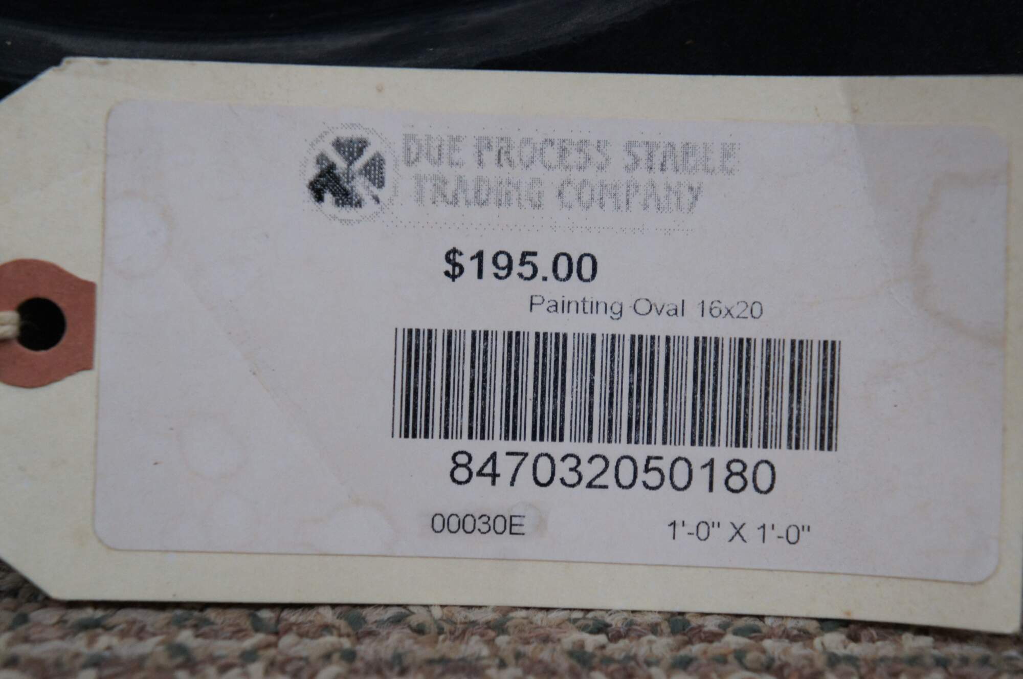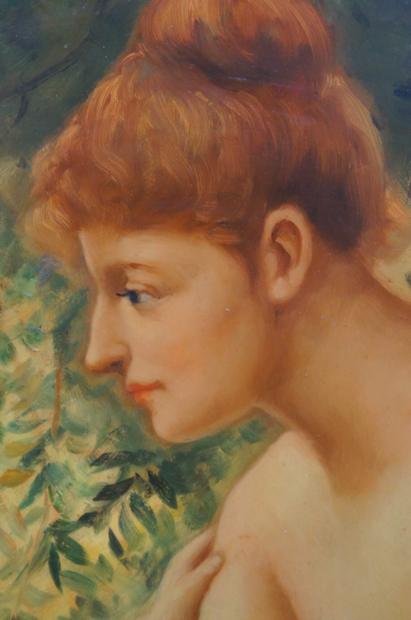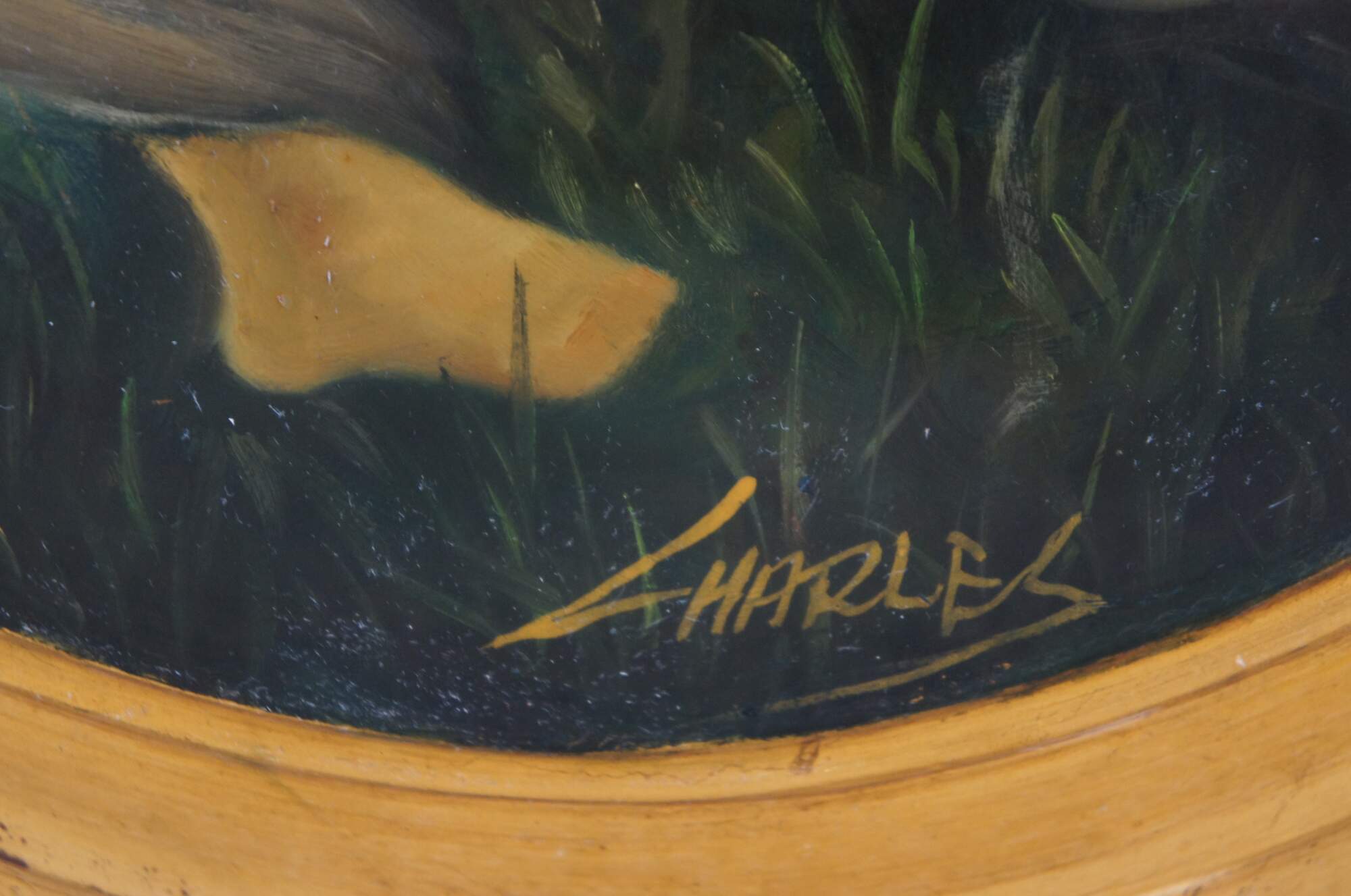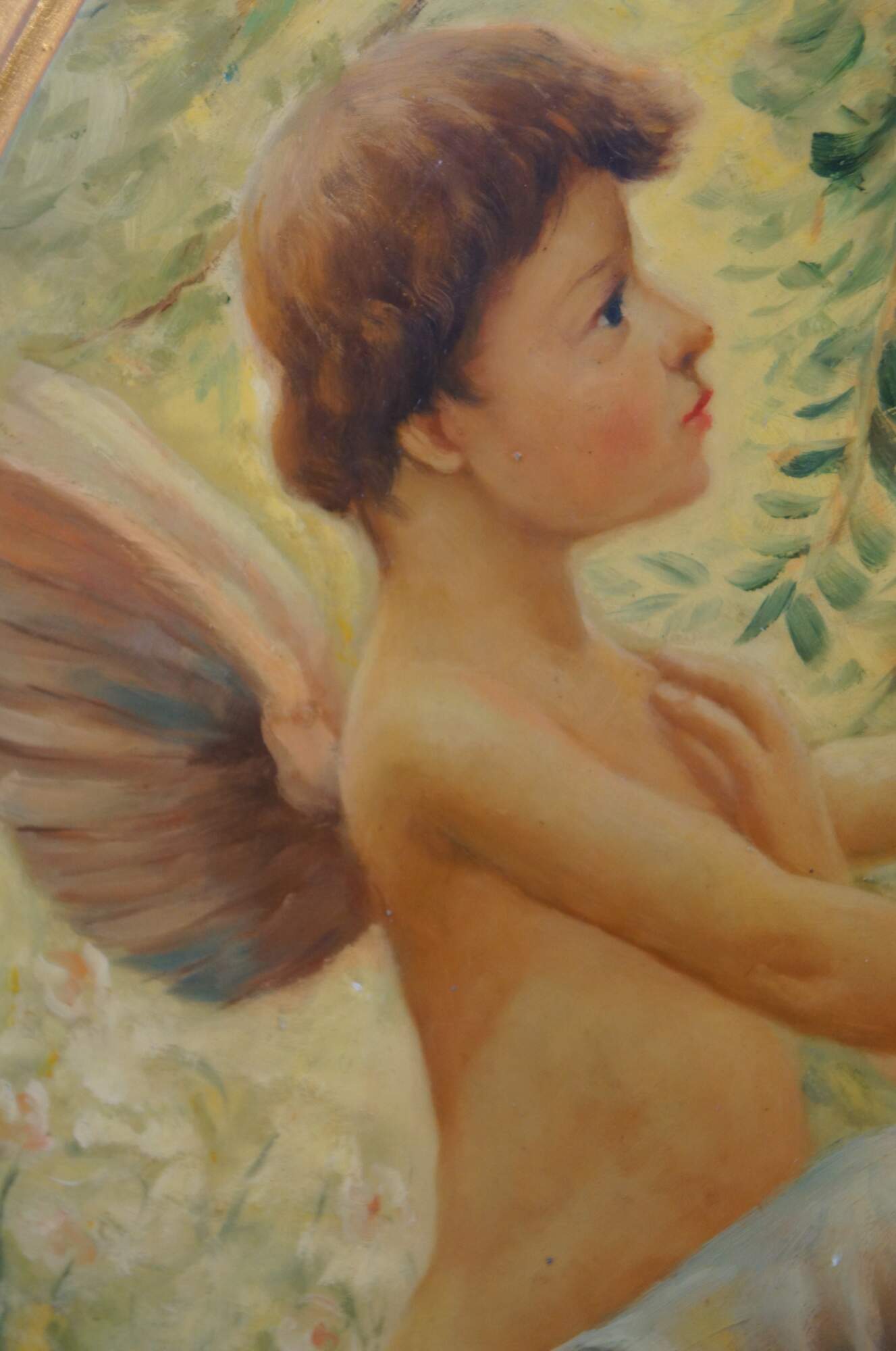 Mid to late 20th century oval portrait oil painting on wood titled Love Disarmed; depicting a young Cupid with his mother Aphrodite / Venus (Eros and Venus) in a simple leaf framed landscape. Signed Charles along lower edge. Painted on a wood panel with convex surface and ridged, gold painted border.
