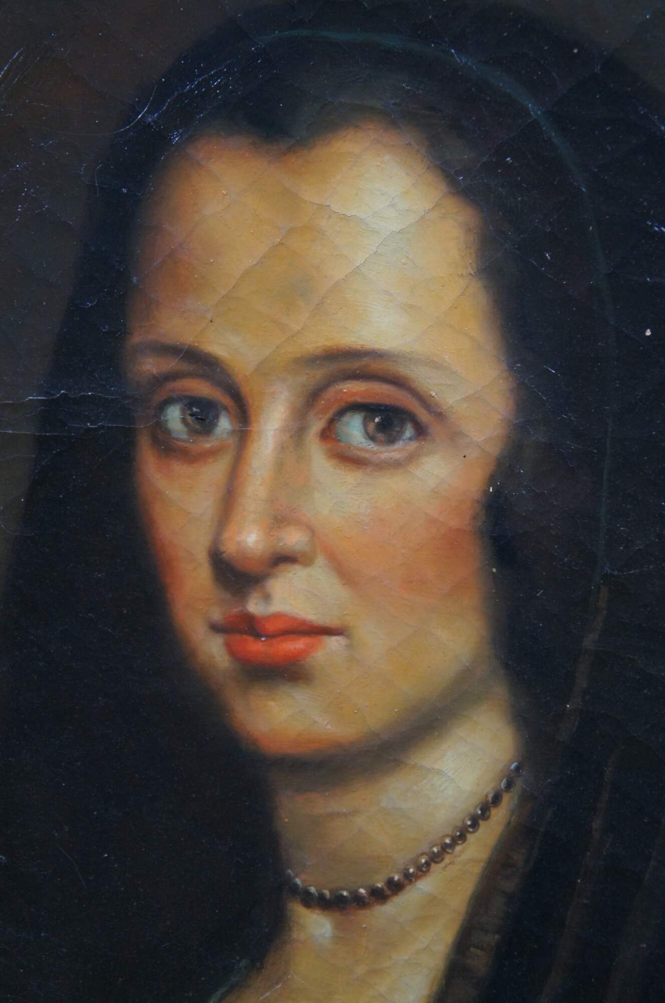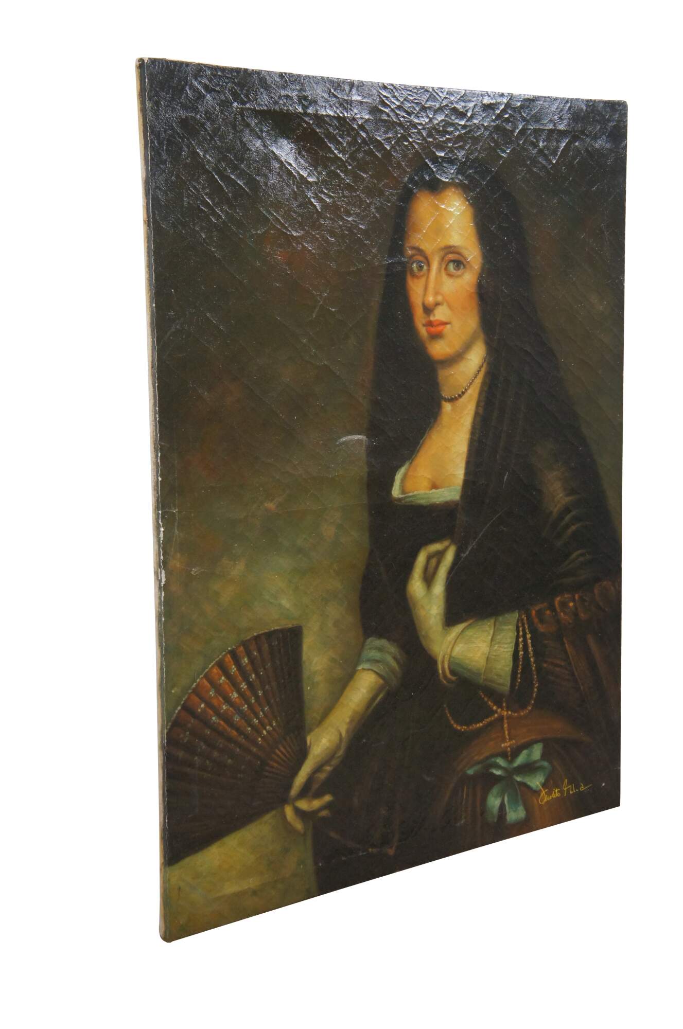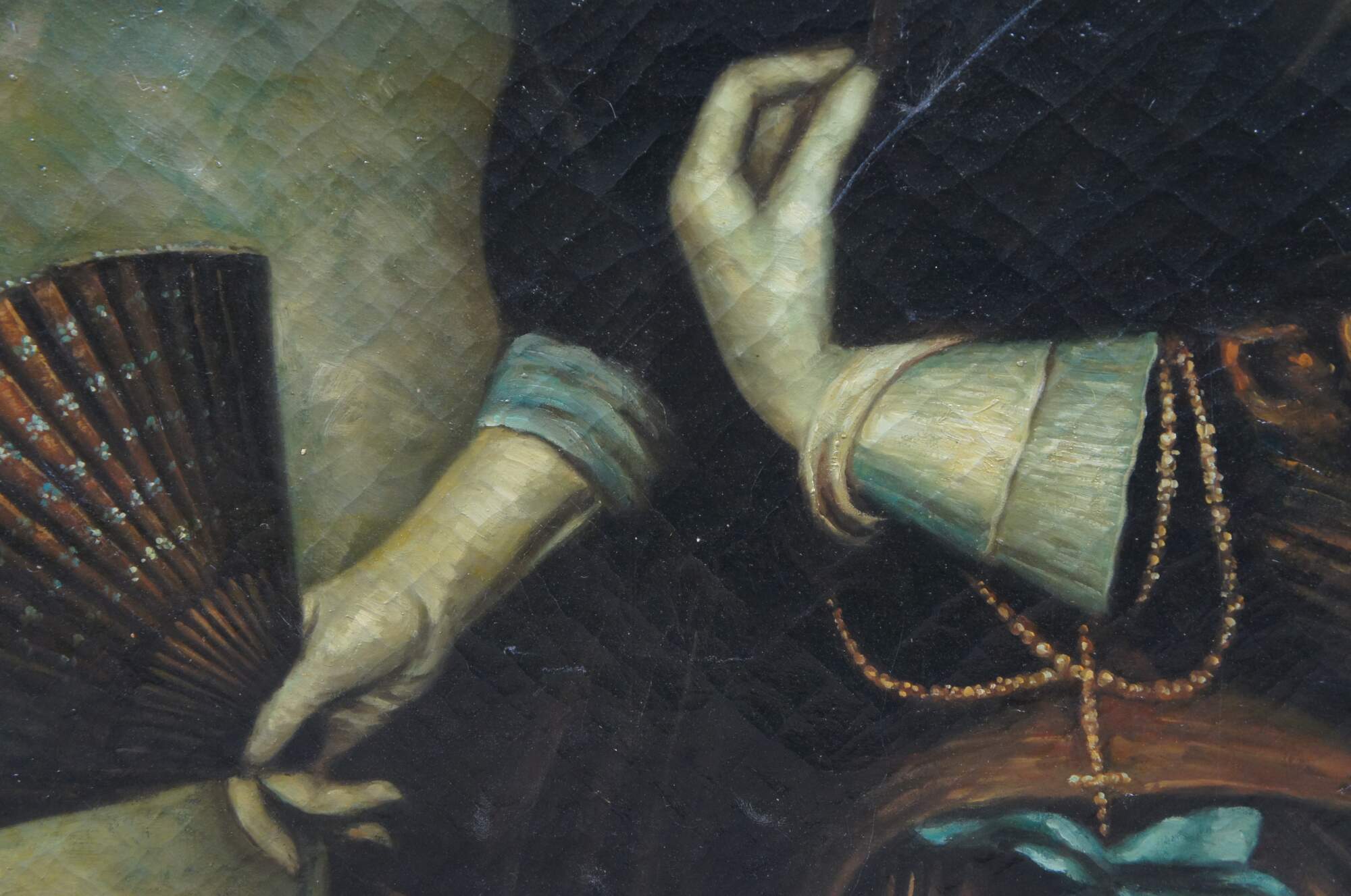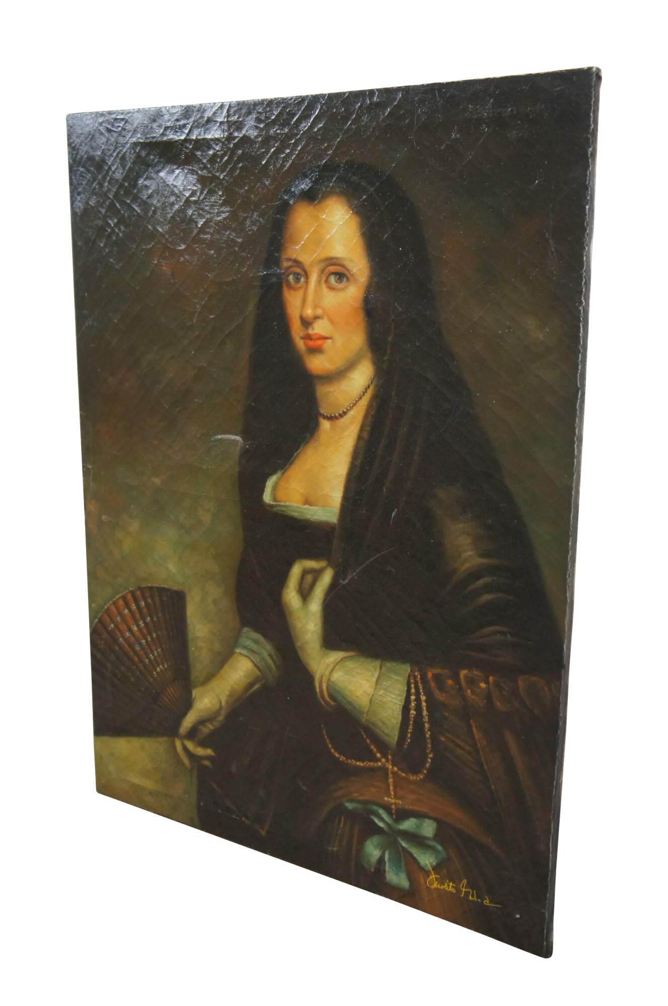 Late 20th century oil painting on linen after "La Dama del Abanico" (The Lady with a Fan) originally painted circa 1635-1640 by Diego Velazquez. Depicts a woman in black dress and veil with white gloves, rosary on her wrist and a fan in her hand. Signed in lower right corner. Unframed.