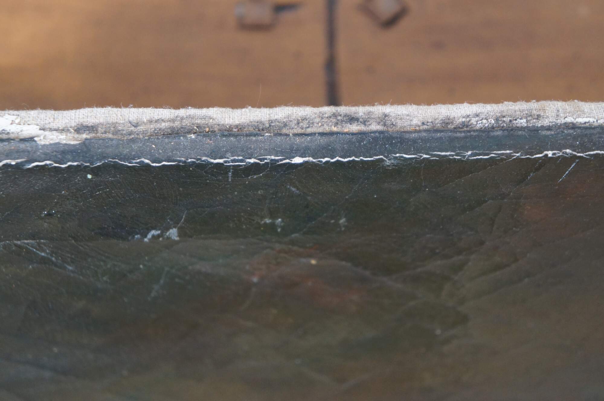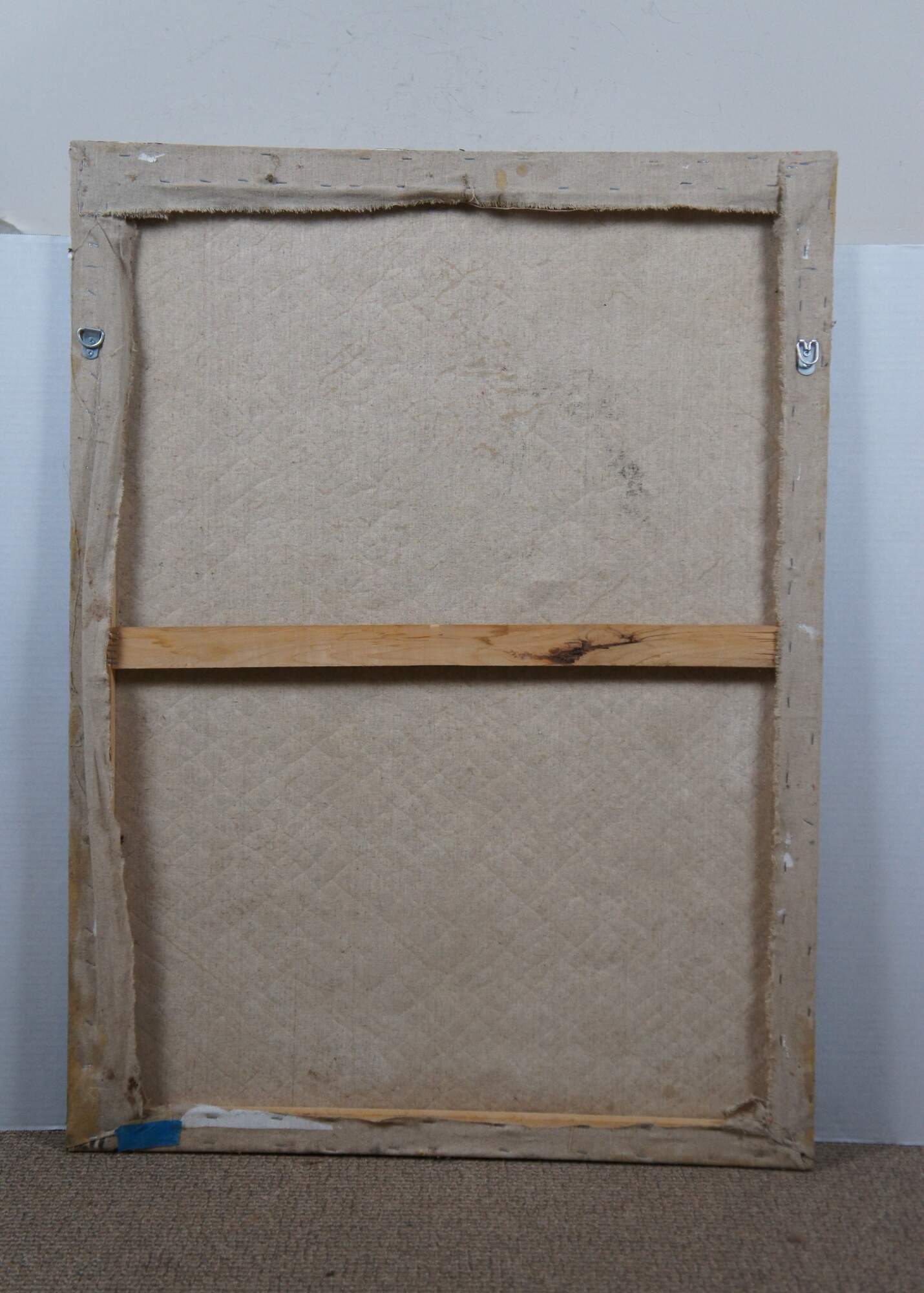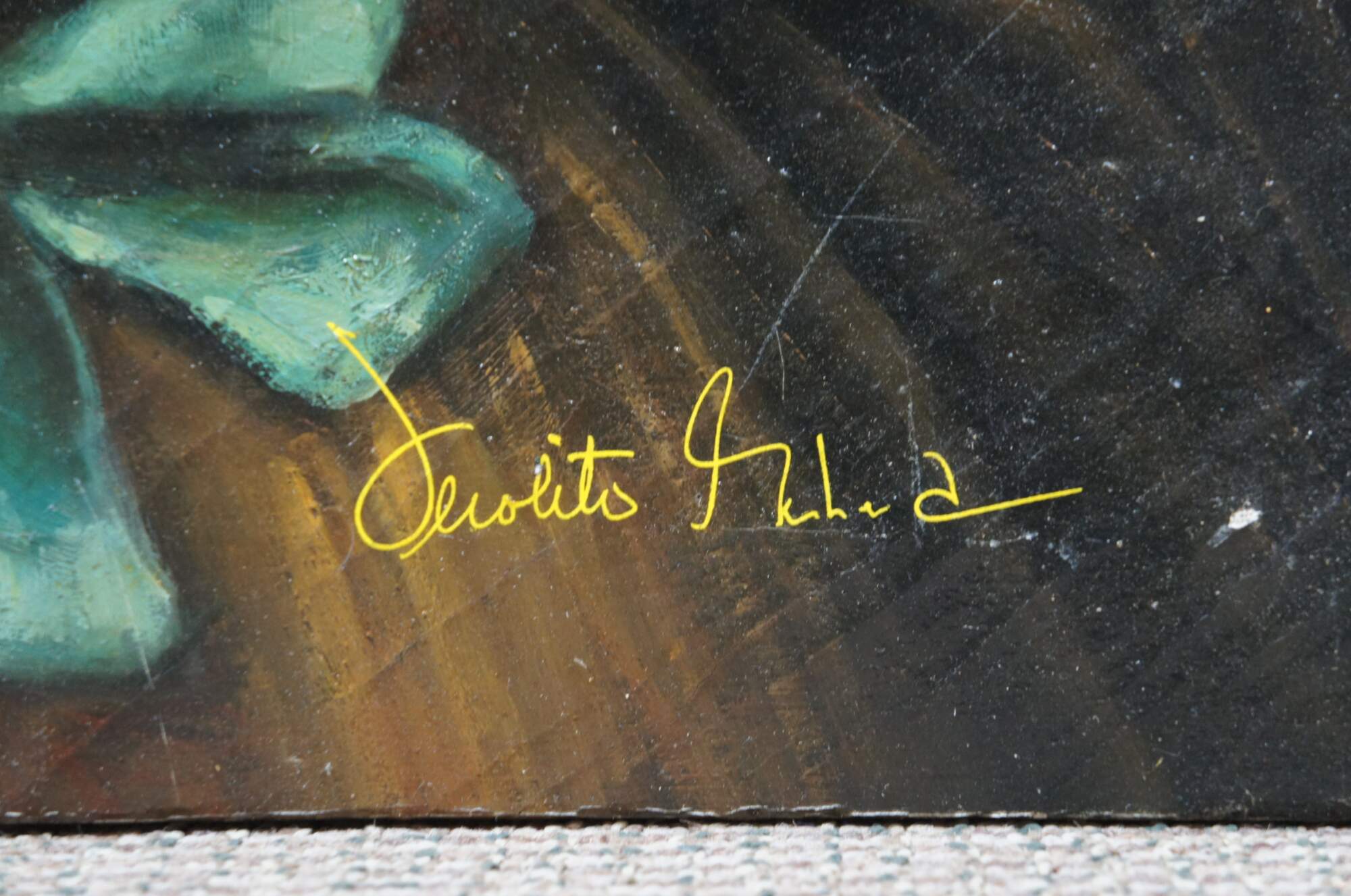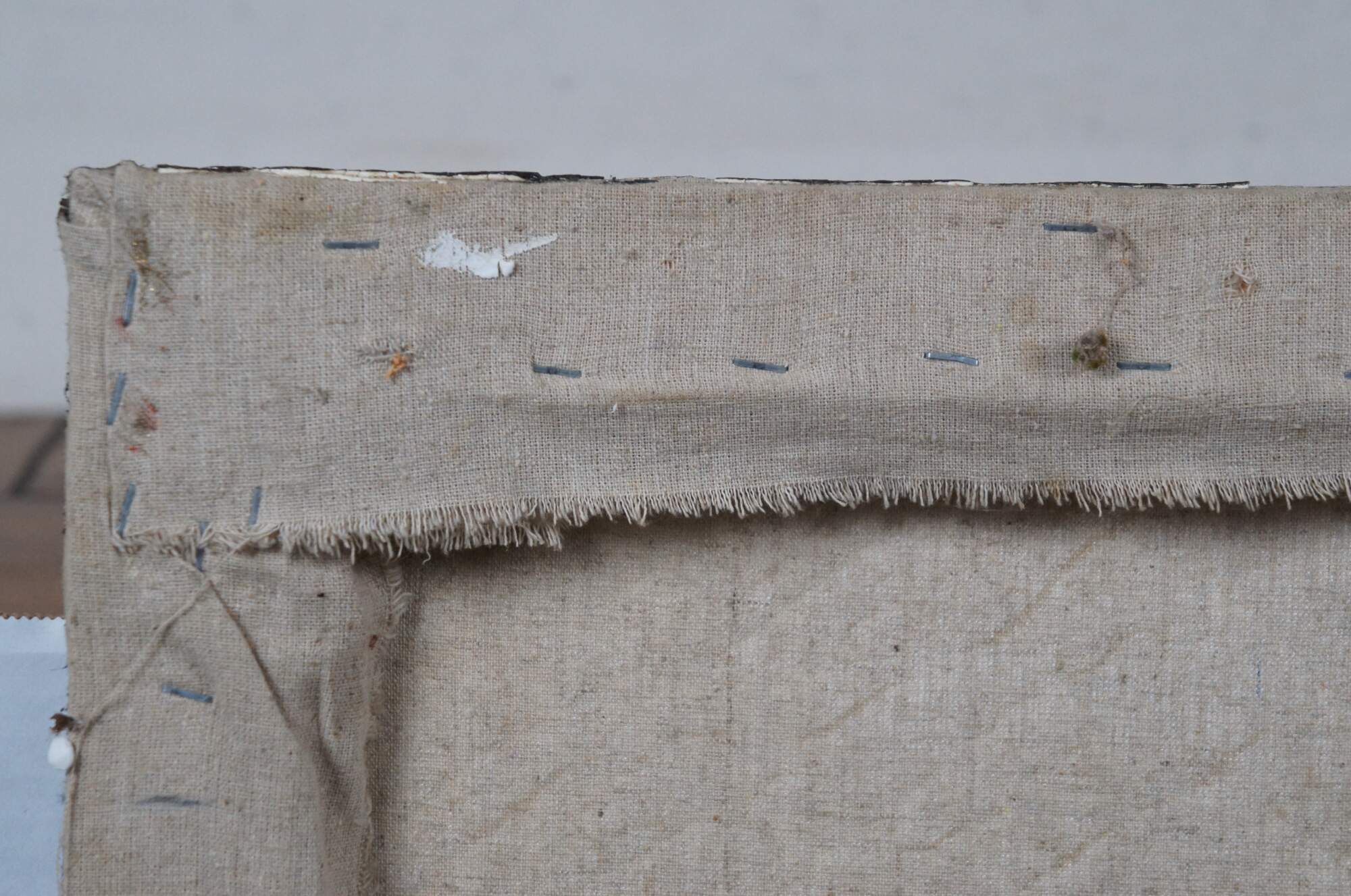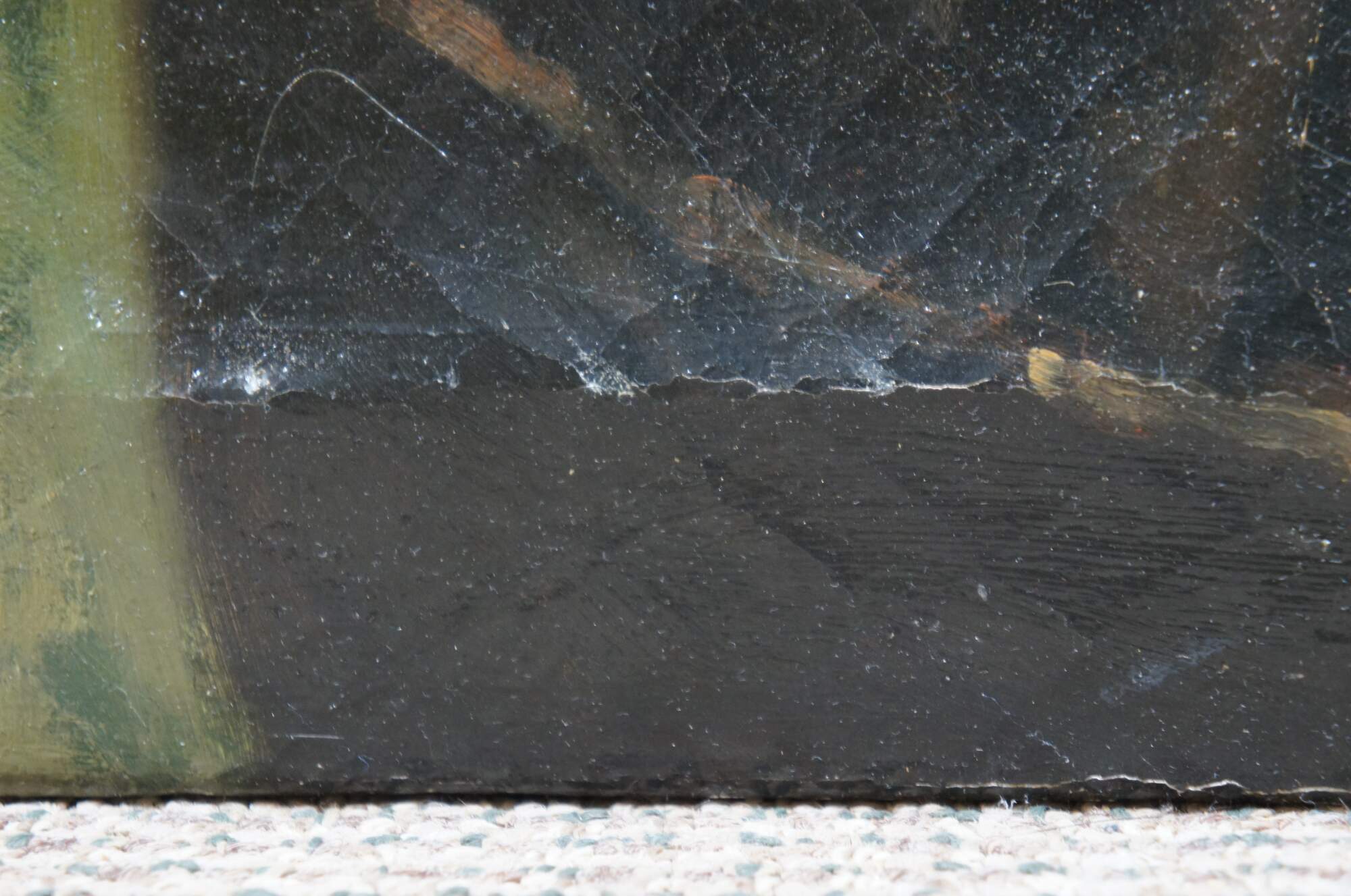 Late 20th century oil painting on linen after "La Dama del Abanico" (The Lady with a Fan) originally painted circa 1635-1640 by Diego Velazquez. Depicts a woman in black dress and veil with white gloves, rosary on her wrist and a fan in her hand. Signed in lower right corner. Unframed.