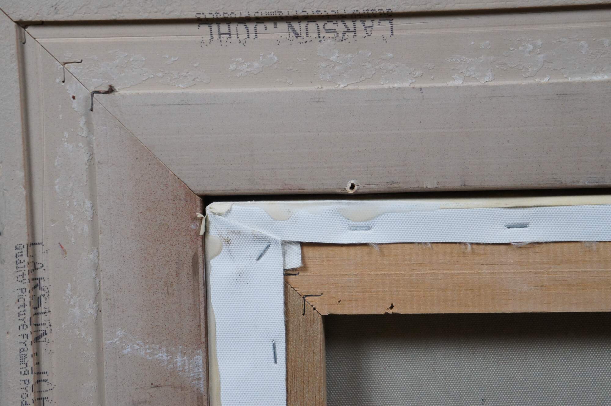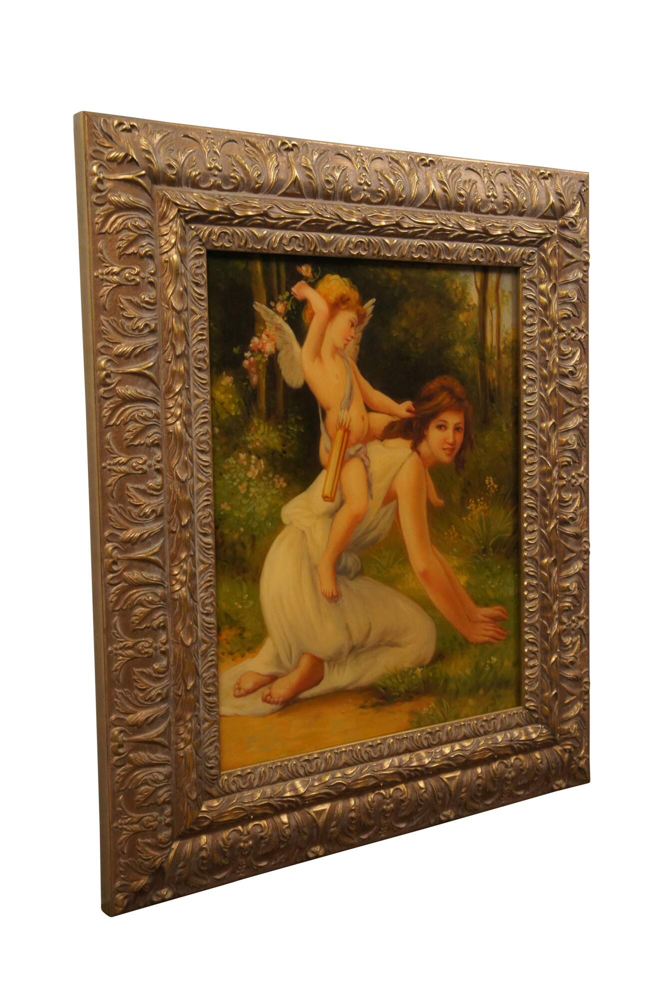 Late 20th century oil on canvas reproduction painting after "Venus and Cupid" by Guillaume Seignac. Depicts a young Cupid (Eros) playing "horsey" with his mother Venus (Aphrodite) in a forest landscape. Heavy resin frame molded with a foliate motif; plexiglass front.