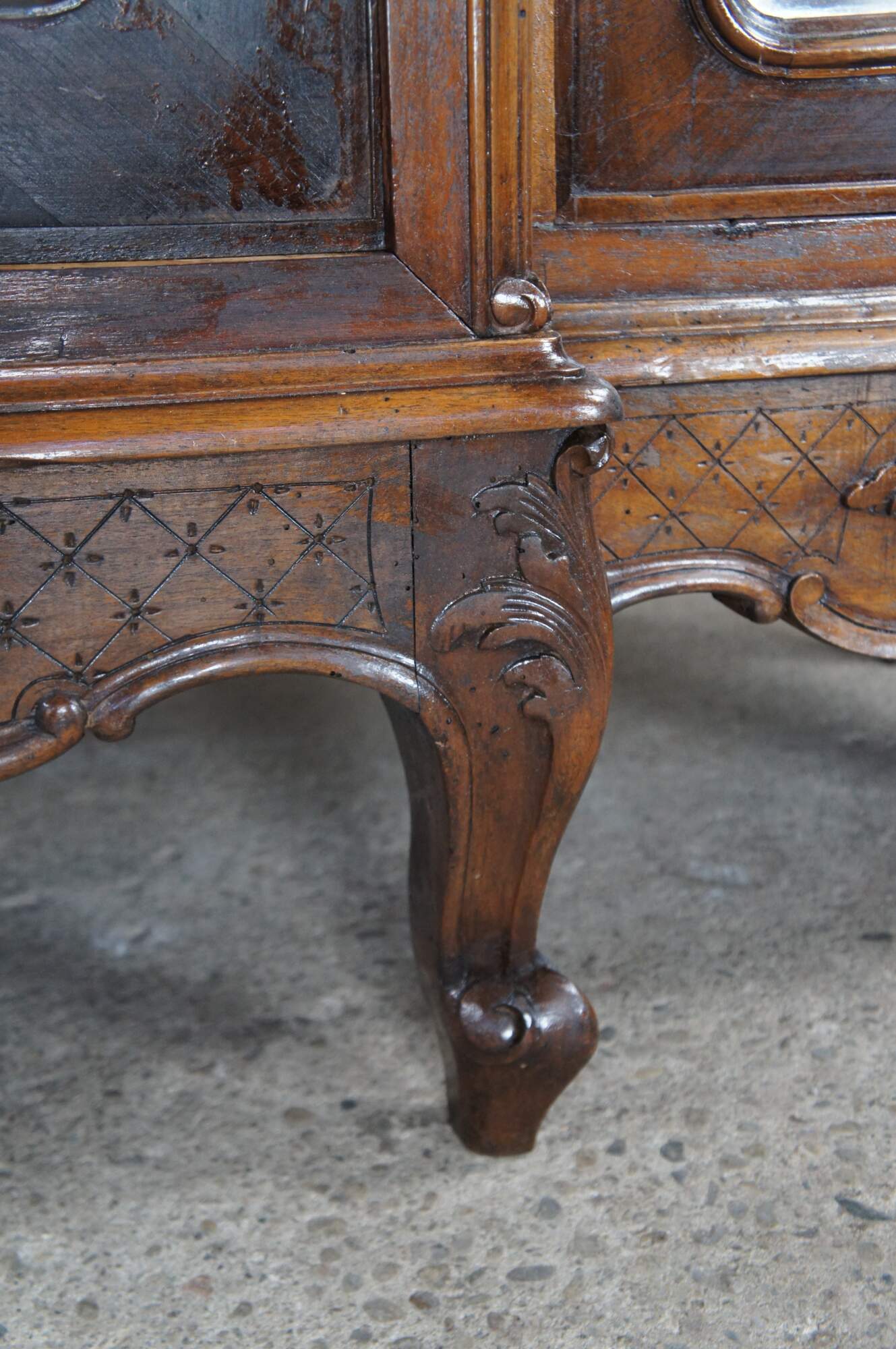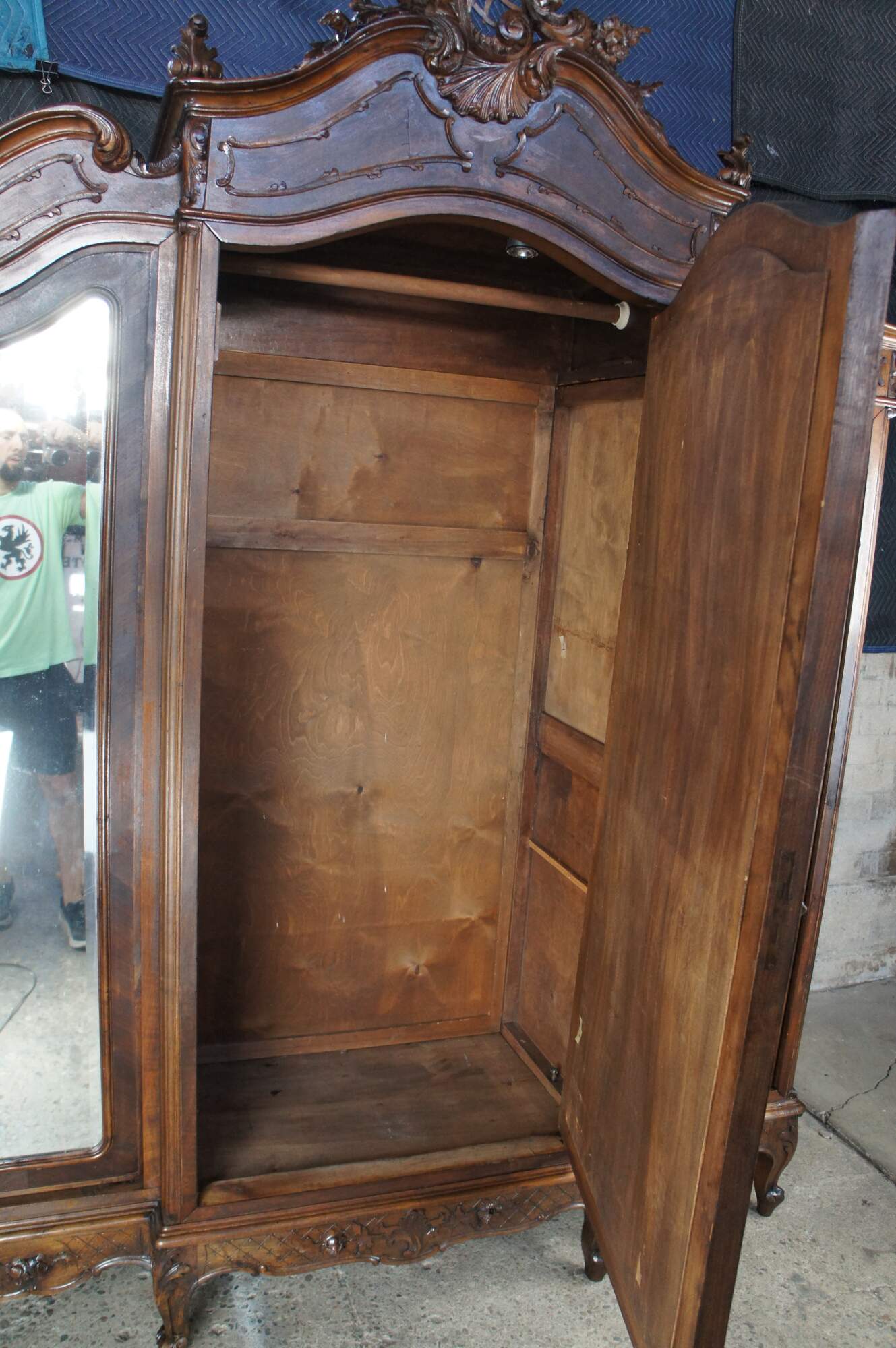 A beautiful antique 19th Century French Knockdown Armoire / Wardrobe. Features a walnut frame with three large beveled glass mirrored doors The cabinet opens to a large central area for hanging garments at the center which is flanked by smaller outer cabinets with shelves. The central crown has a beautifully carved cartouche with shell and acanthus motifs. Lower aprons showcase a lattice carved design, with rose carved accents over cabriole legs.