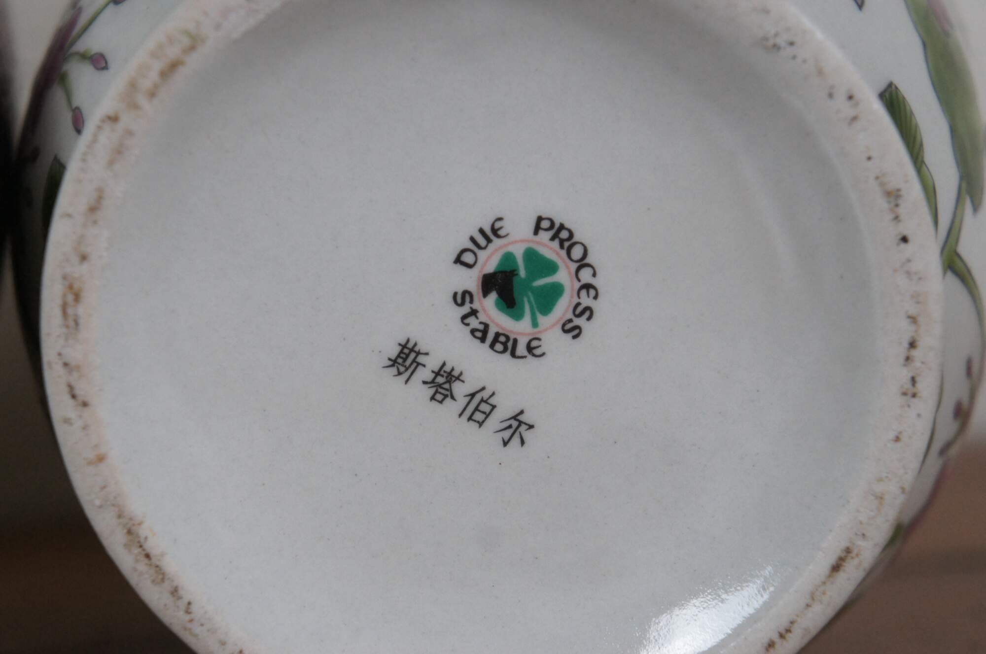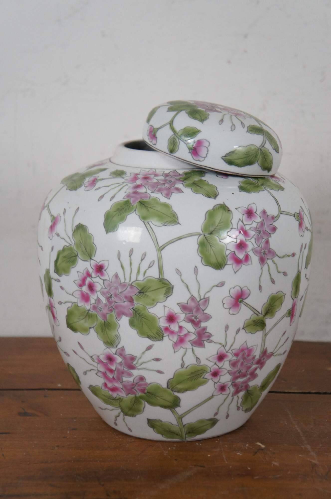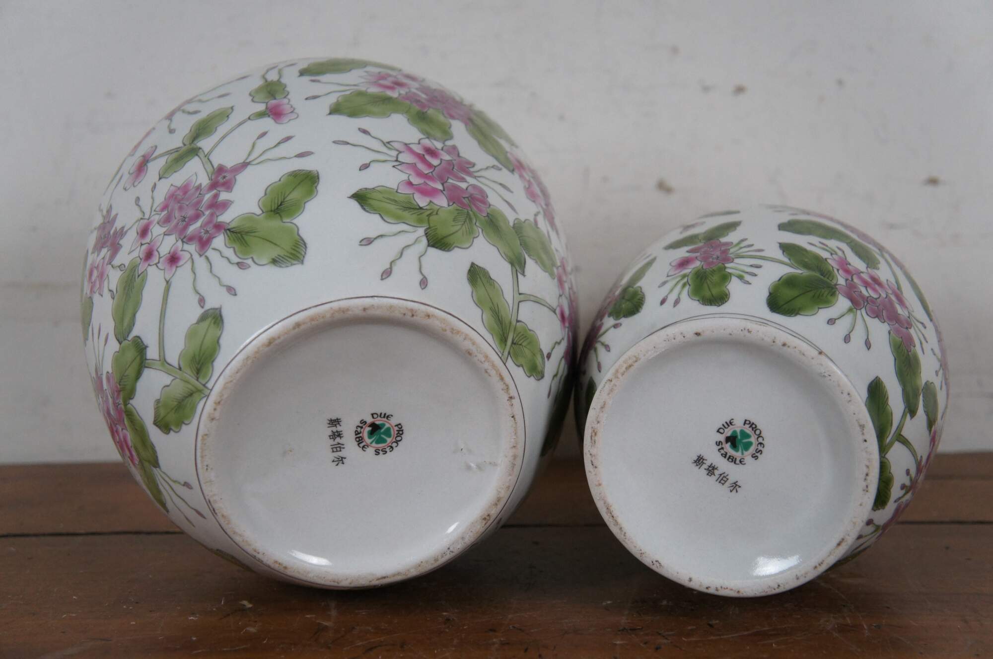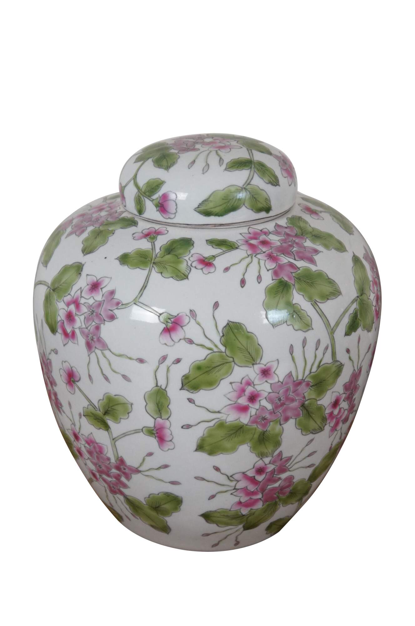 Rare late 20th century Due Process Stables white porcelain lidded ginger jar and vase / urn, decorated with an enameled design of green branches and pink cherry blossoms.