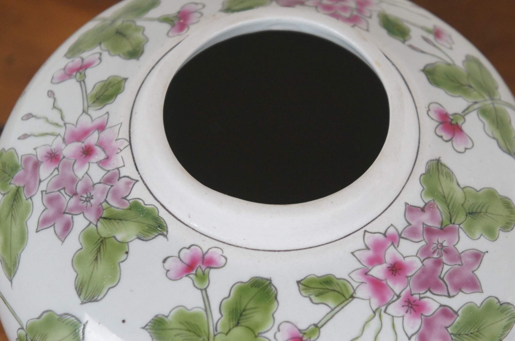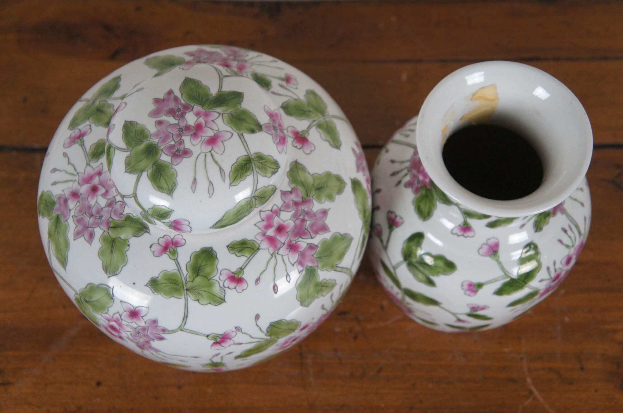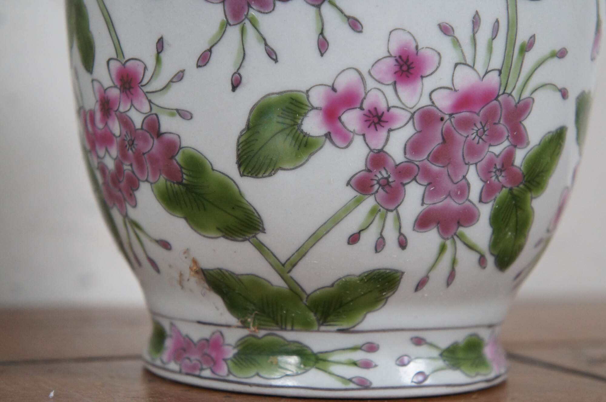 Rare late 20th century Due Process Stables white porcelain lidded ginger jar and vase / urn, decorated with an enameled design of green branches and pink cherry blossoms.