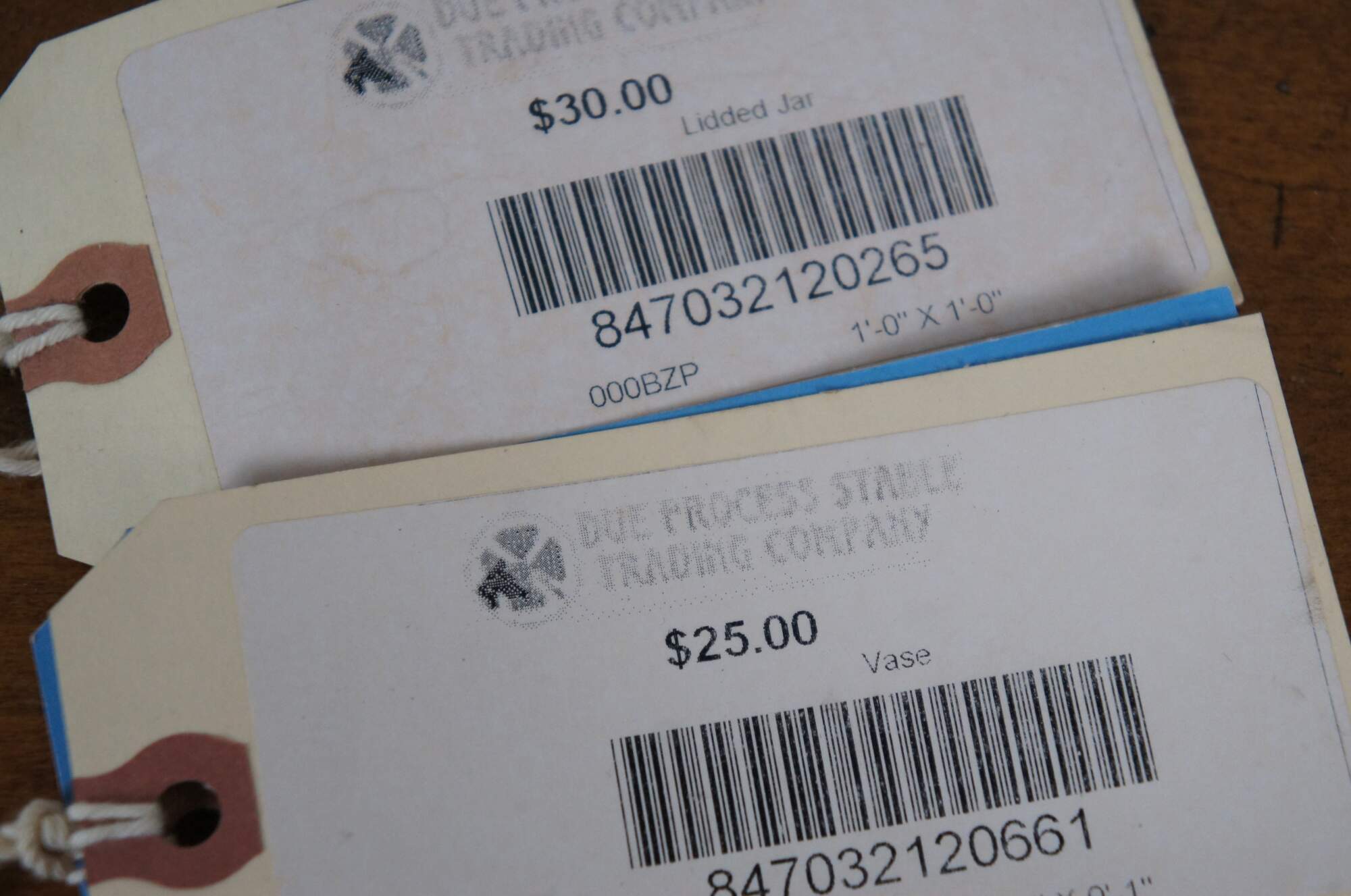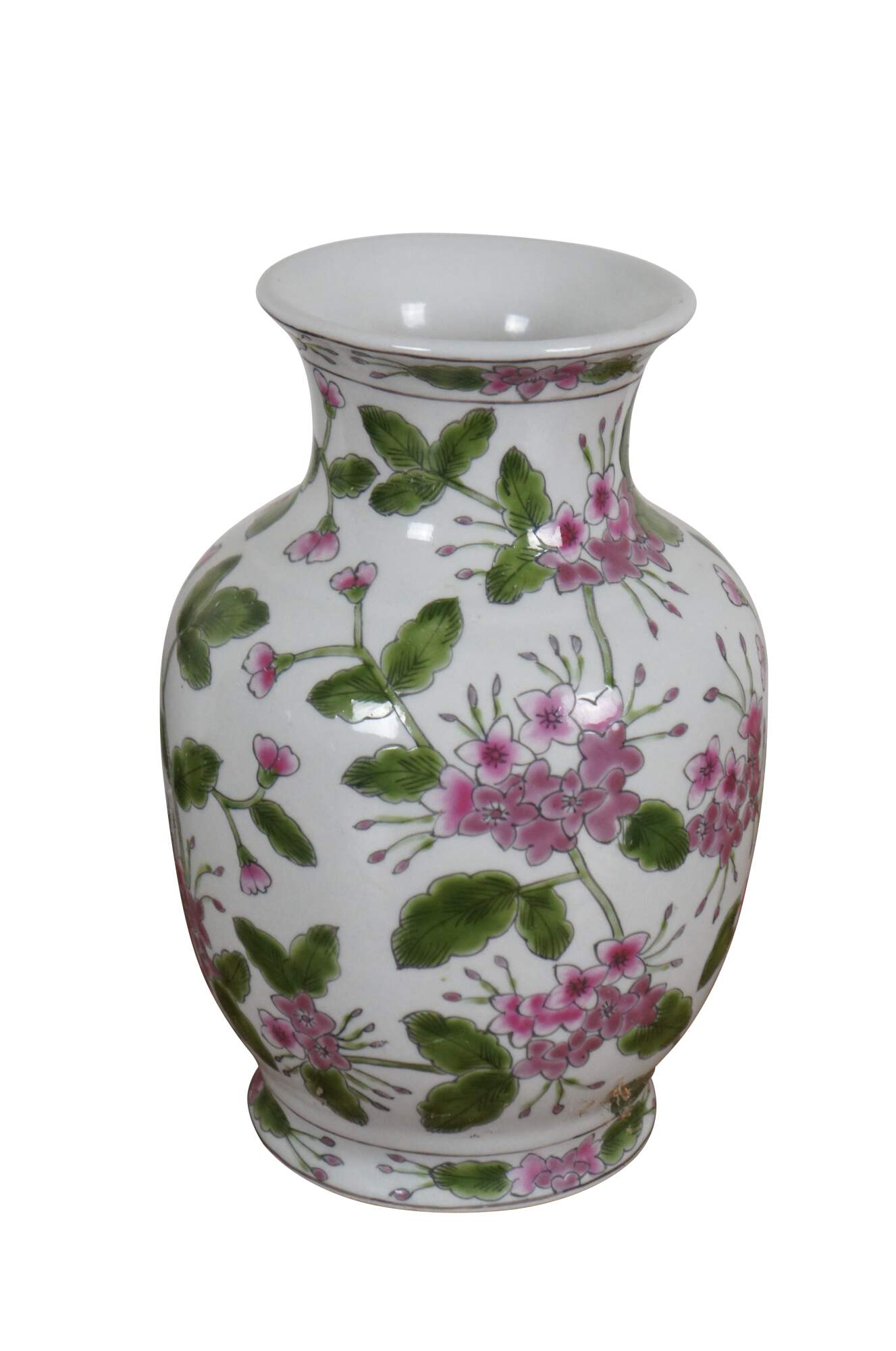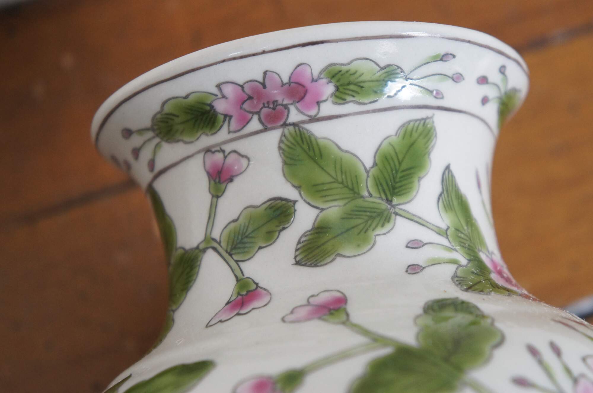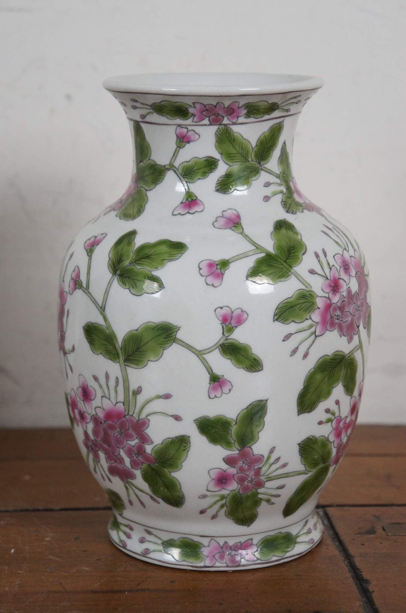 Rare late 20th century Due Process Stables white porcelain lidded ginger jar and vase / urn, decorated with an enameled design of green branches and pink cherry blossoms.