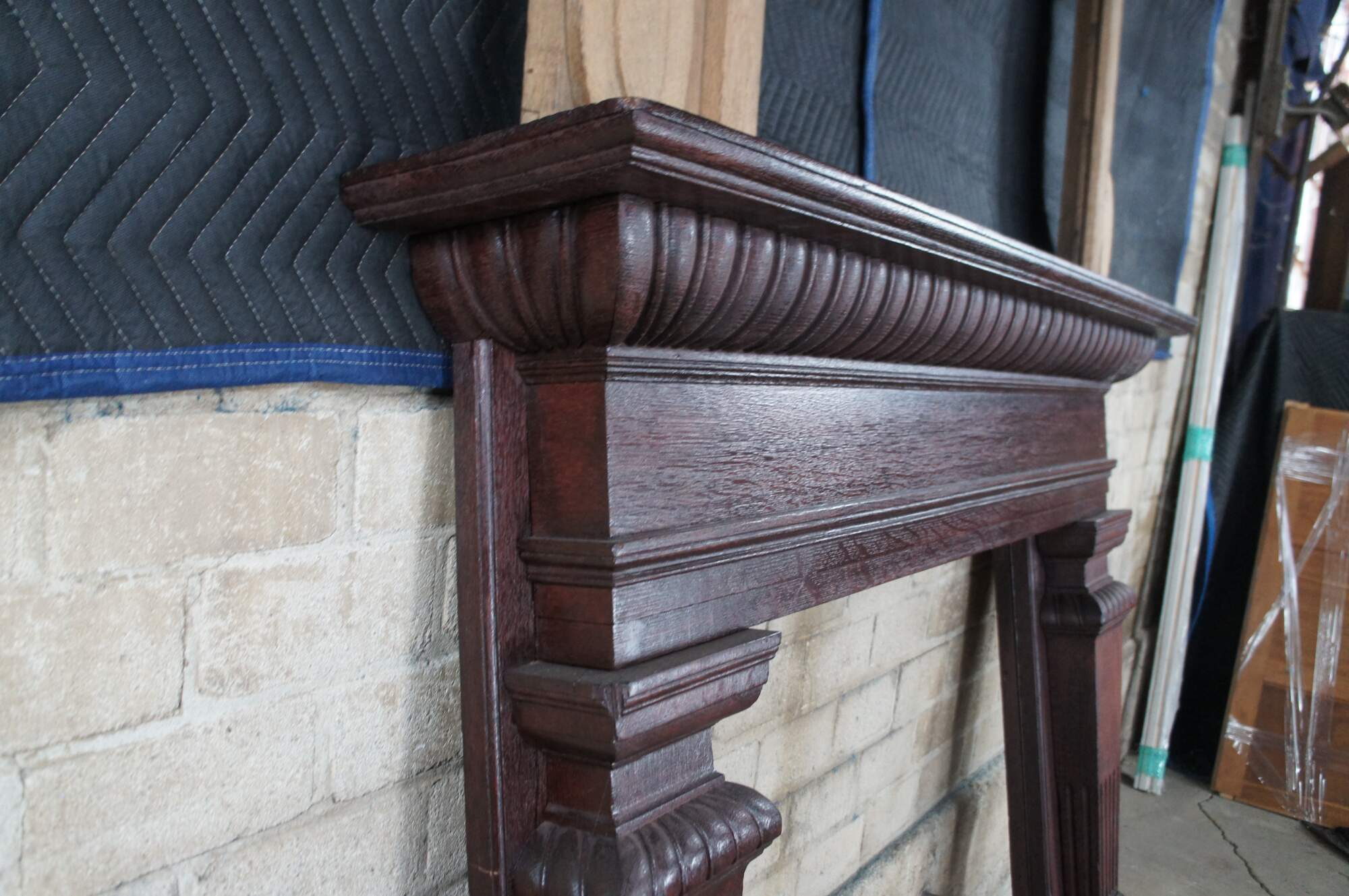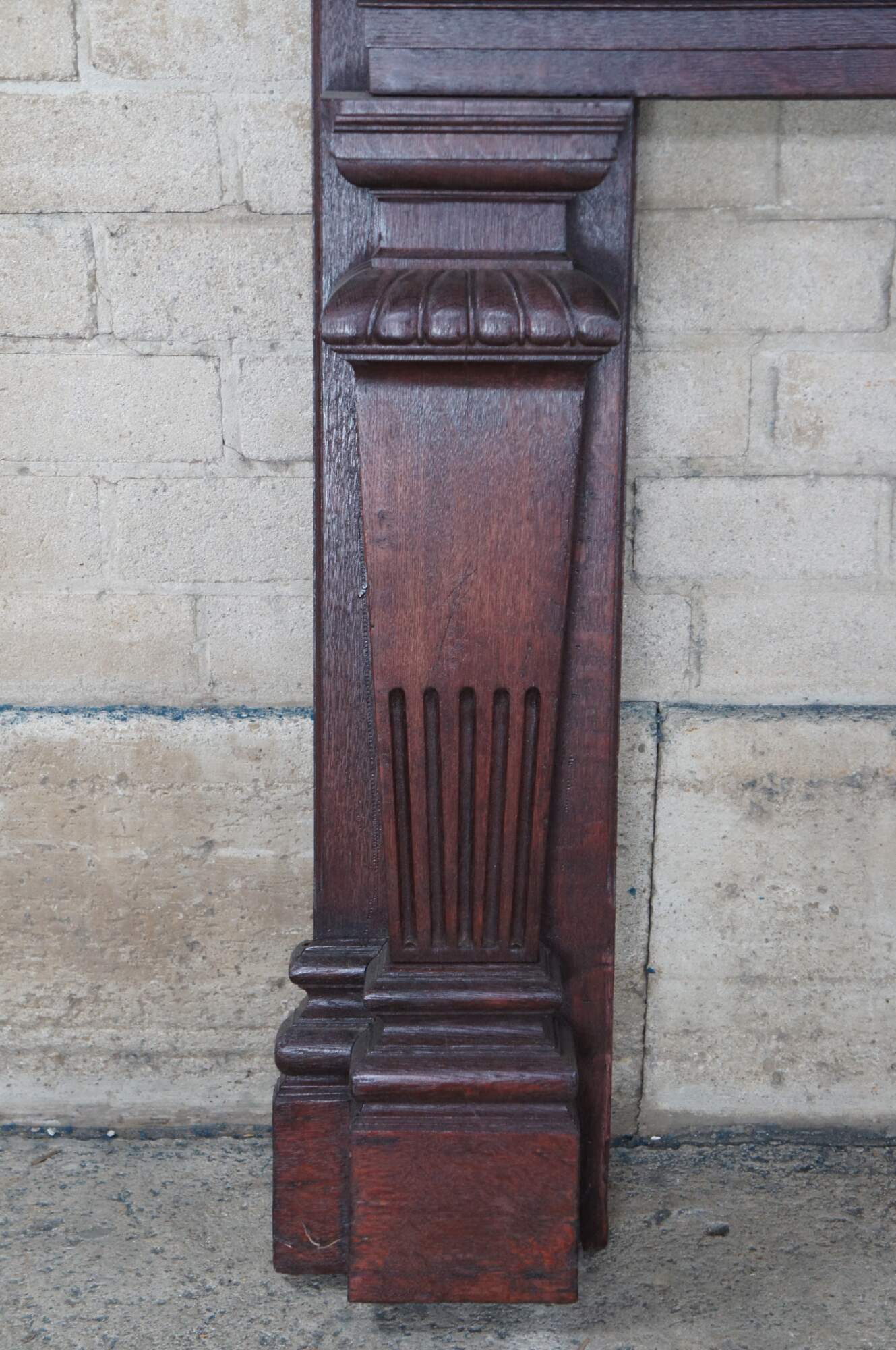 An Exquisite Antique English Georgian Style Fireplace Mantle & Overmantle. At over 9 feet tall it is a stately addition to any den or great room. Made from oak with large fluted columns along the front and gadrooned trim. The overmantel displays an arched opening perfect for a mirror or painting and set on a breakfront backing with scroll work, dentil molding, gadrooning, foliate details and an arched open pediment with round medallions centered around a Fleur. The Mantel is 3 pieces allowing for added versatility. The crown is removable to fit in smaller spaces and the overmantel removes allowing for use separately.