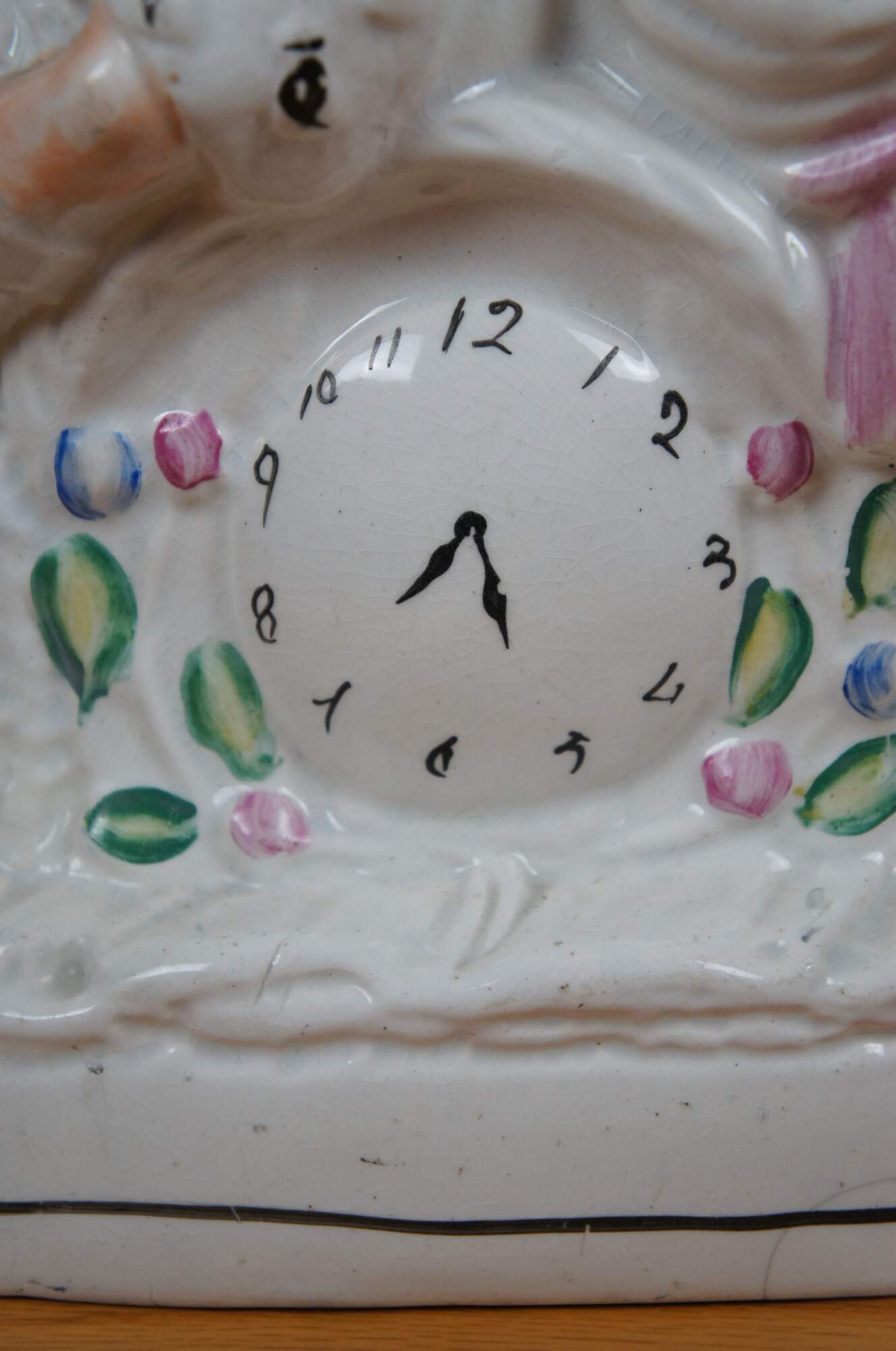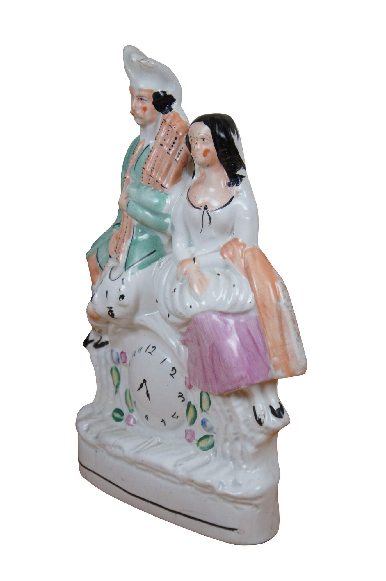 Antique 19th century English Staffordshire flatback porcelain figurine depicting a Scottish Highland couple perched on a floral clock, than man holding a set of bag pipes.