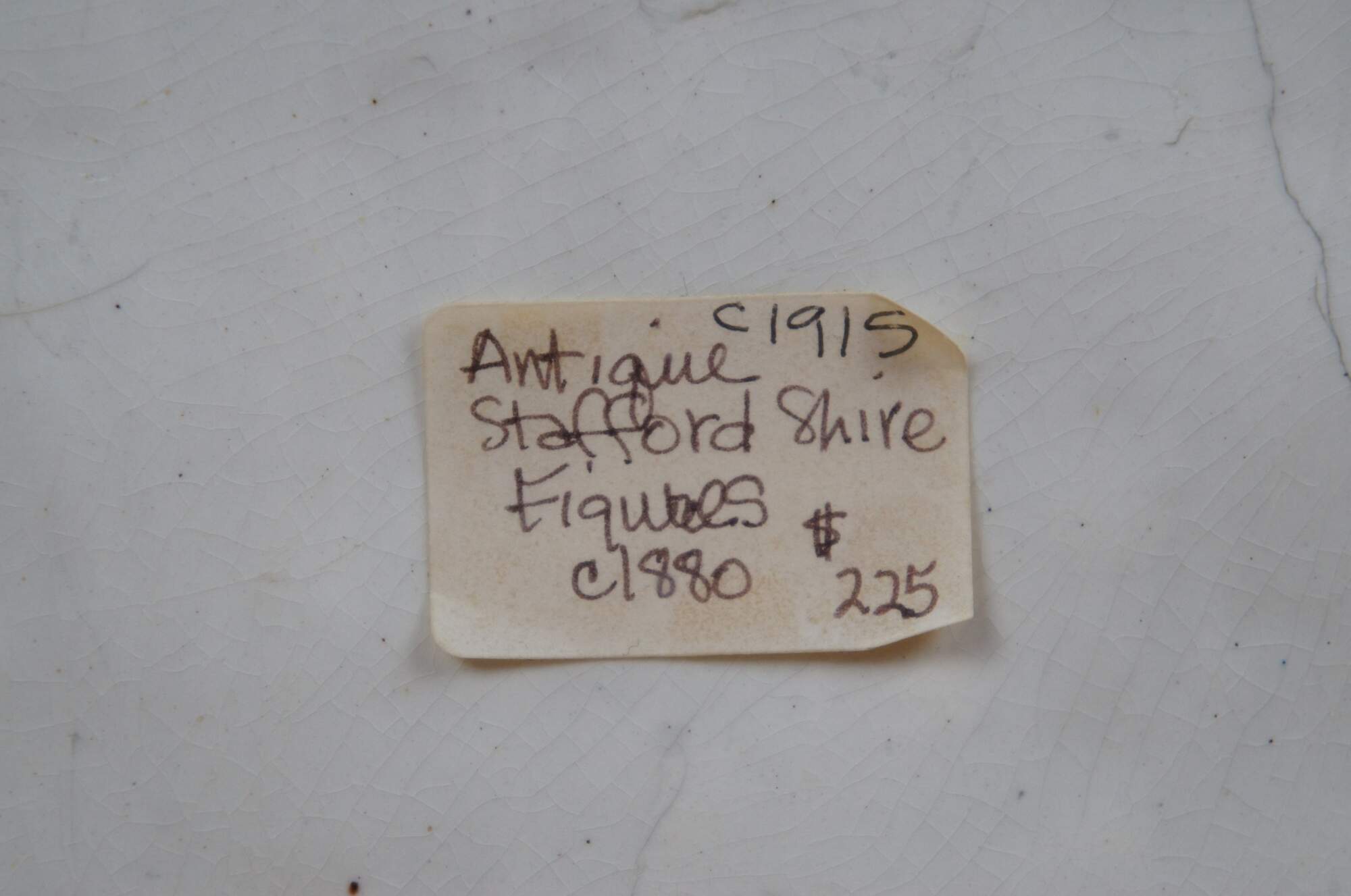 Staffordshire figures are a type of popular pottery figurine made in England from the 18th century onward and often described as important English folk art - "of the people, for the people". Most Staffordshire figures made from 1740 to 1900 were produced by small potteries and makers' marks are generally absent. Most Victorian figures (1837 to 1900) were designed to stand on a shelf or mantlepiece and are therefore only modelled and decorated where visible from the front and sides. These are known as 'flatbacks'.