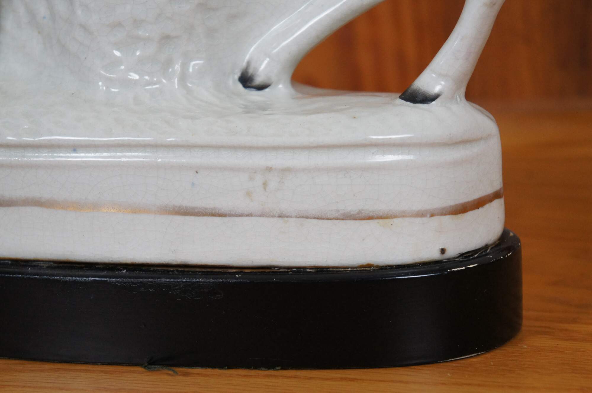 Antique 19th century Staffordshire porcelain flatback equestrian hunt figurine, converted into a two light table lamp, depicting a Scottish Highlander / hunter on horseback with a deer / stag draped over the saddle. Black wood base; painted wire cover; brass finial. Circa mid 19th century.
