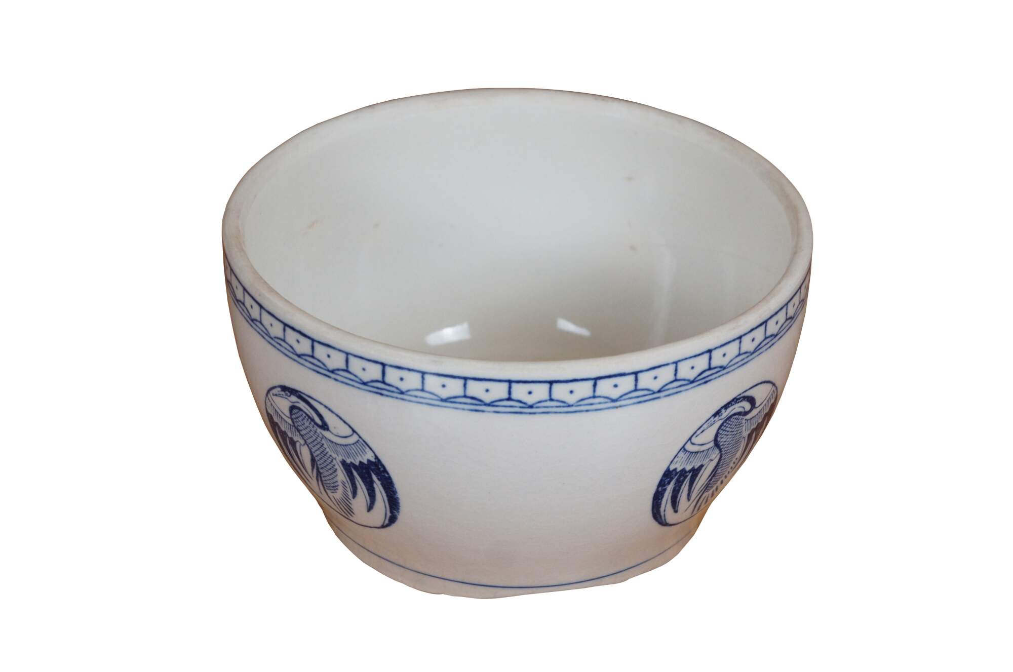 Vintage 20th century Lillian Vernon white porcelain Chinese chinoiserie farmhouse rice bowl decorated with medallions depicting blue herons / cranes / phoenix birds and a scalloped pattern around the upper edge.