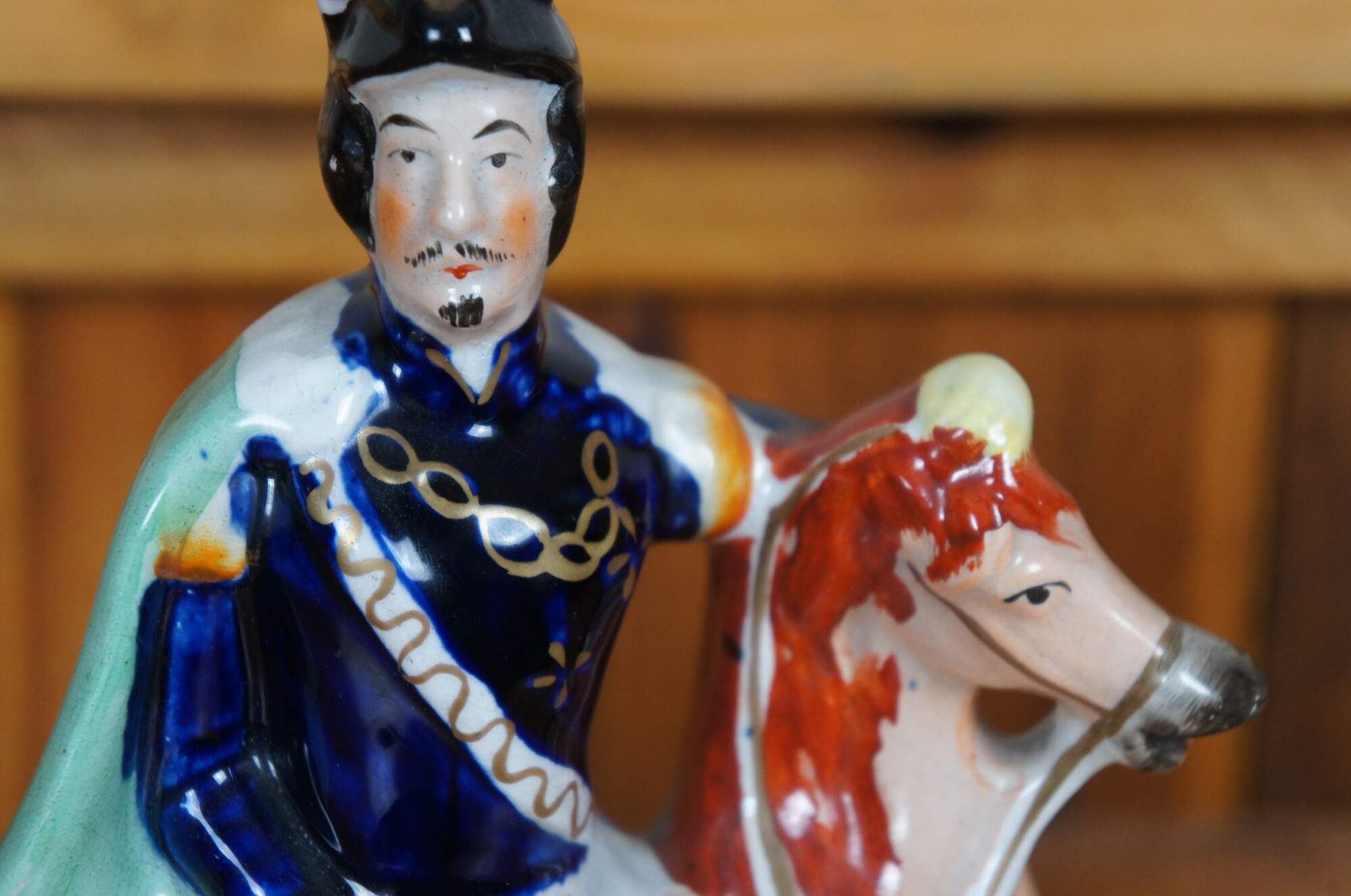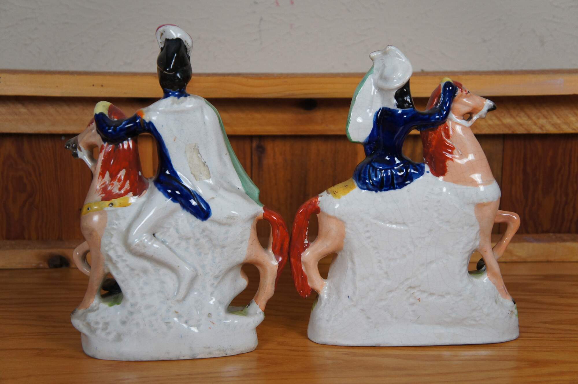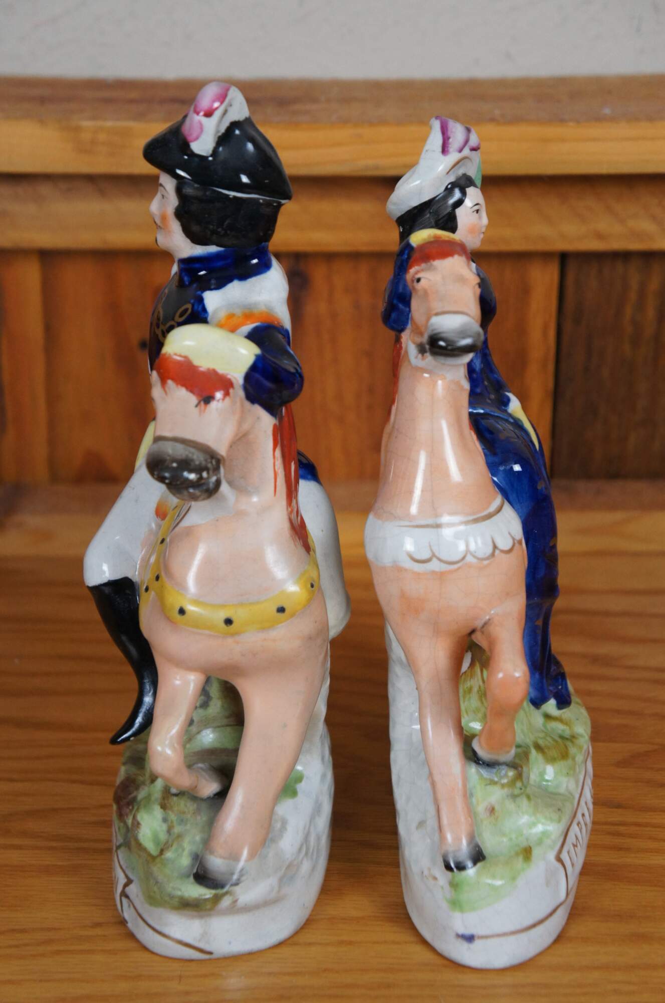Antique 19th century Staffordshire porcelain equestrian horse flatback figurines - a fine pair depicting Louis Napoleon and his wife the Empress of France seated on horseback.