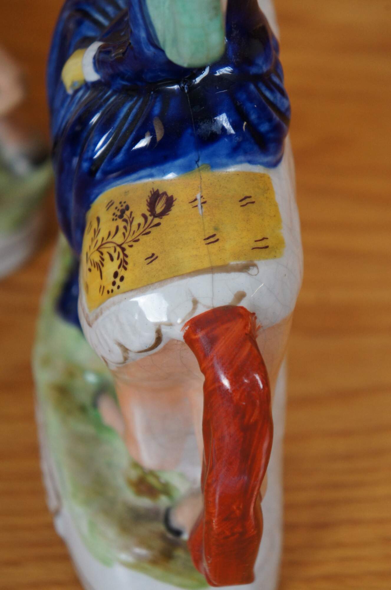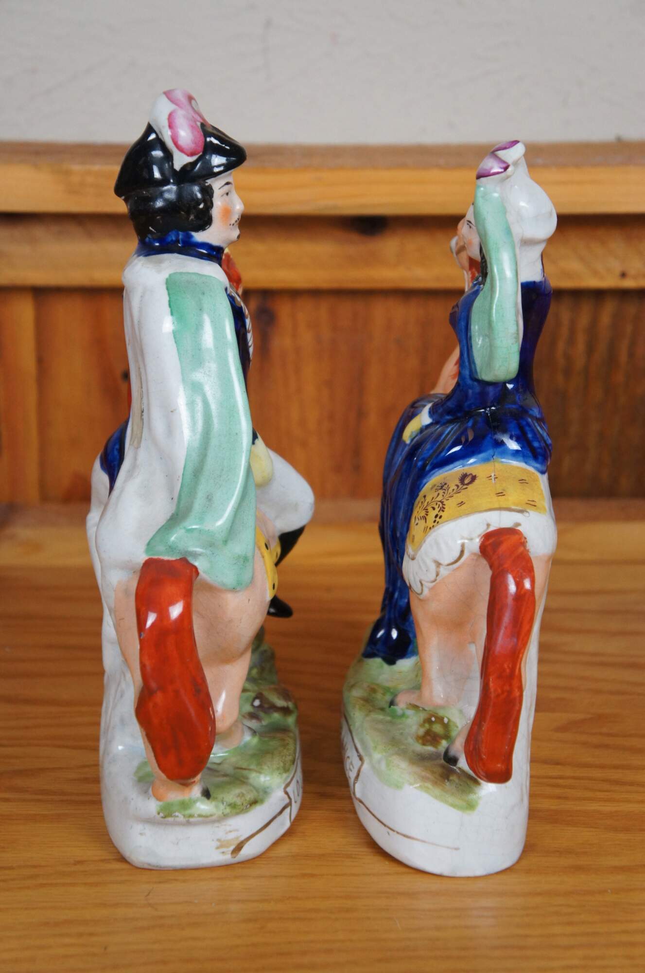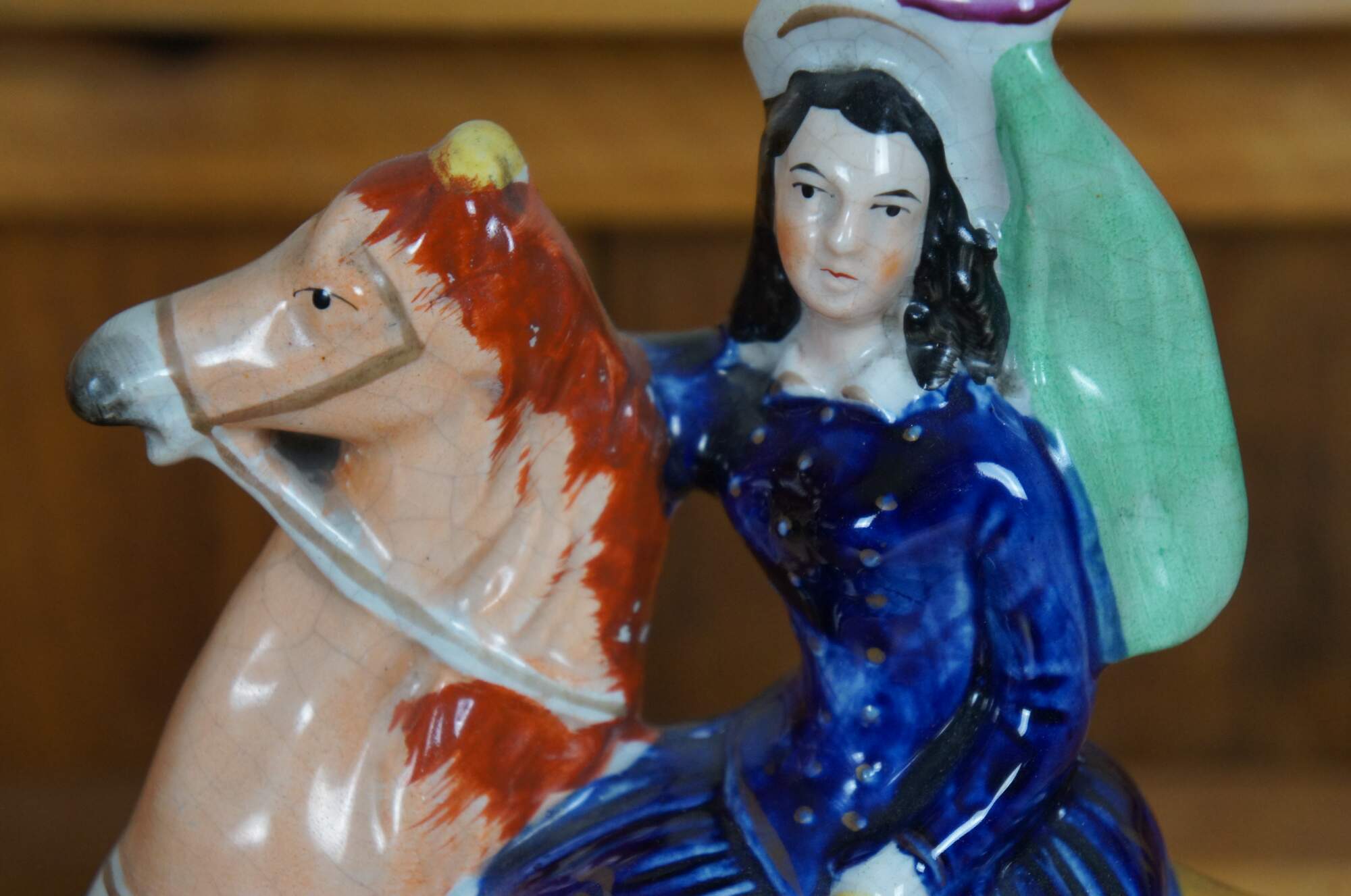 Antique 19th century Staffordshire porcelain equestrian horse flatback figurines - a fine pair depicting Louis Napoleon and his wife the Empress of France seated on horseback.