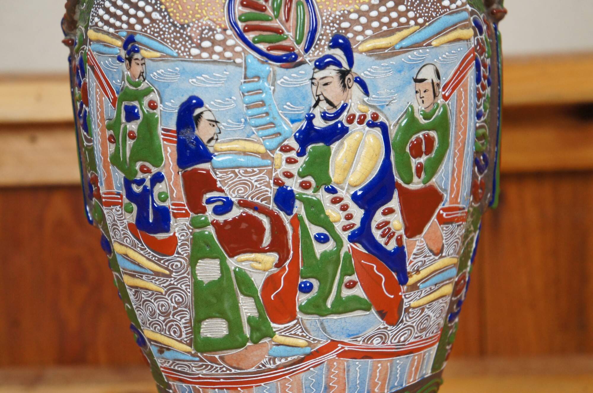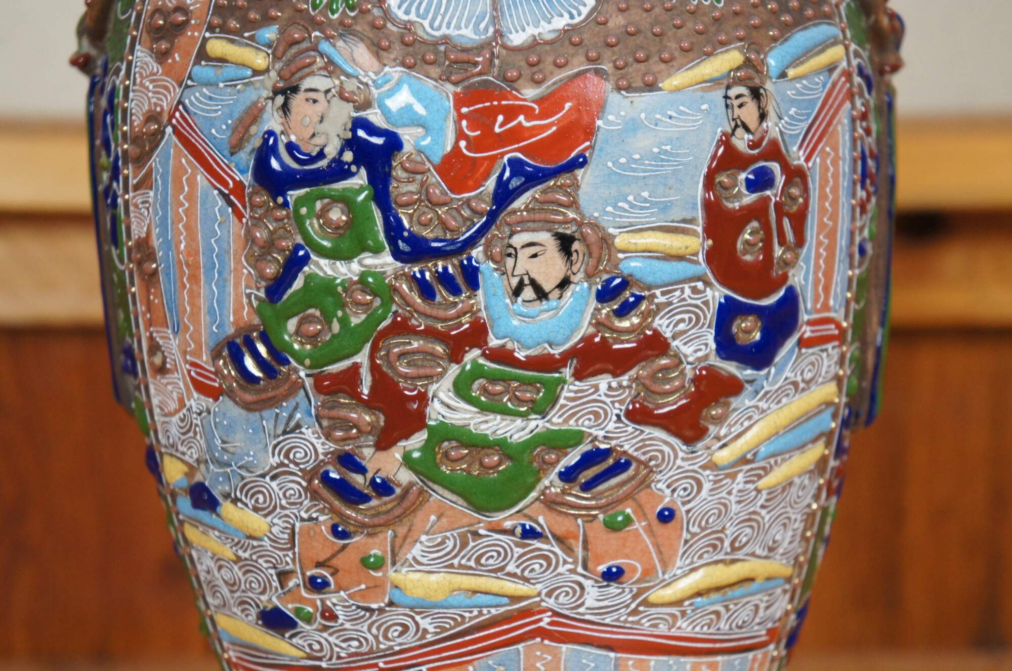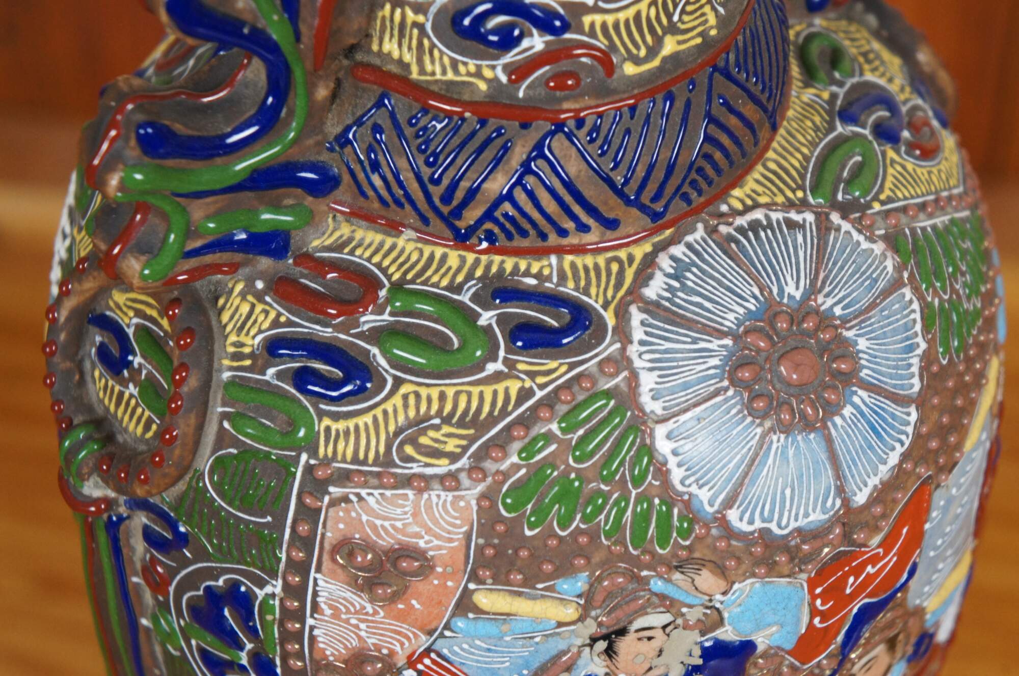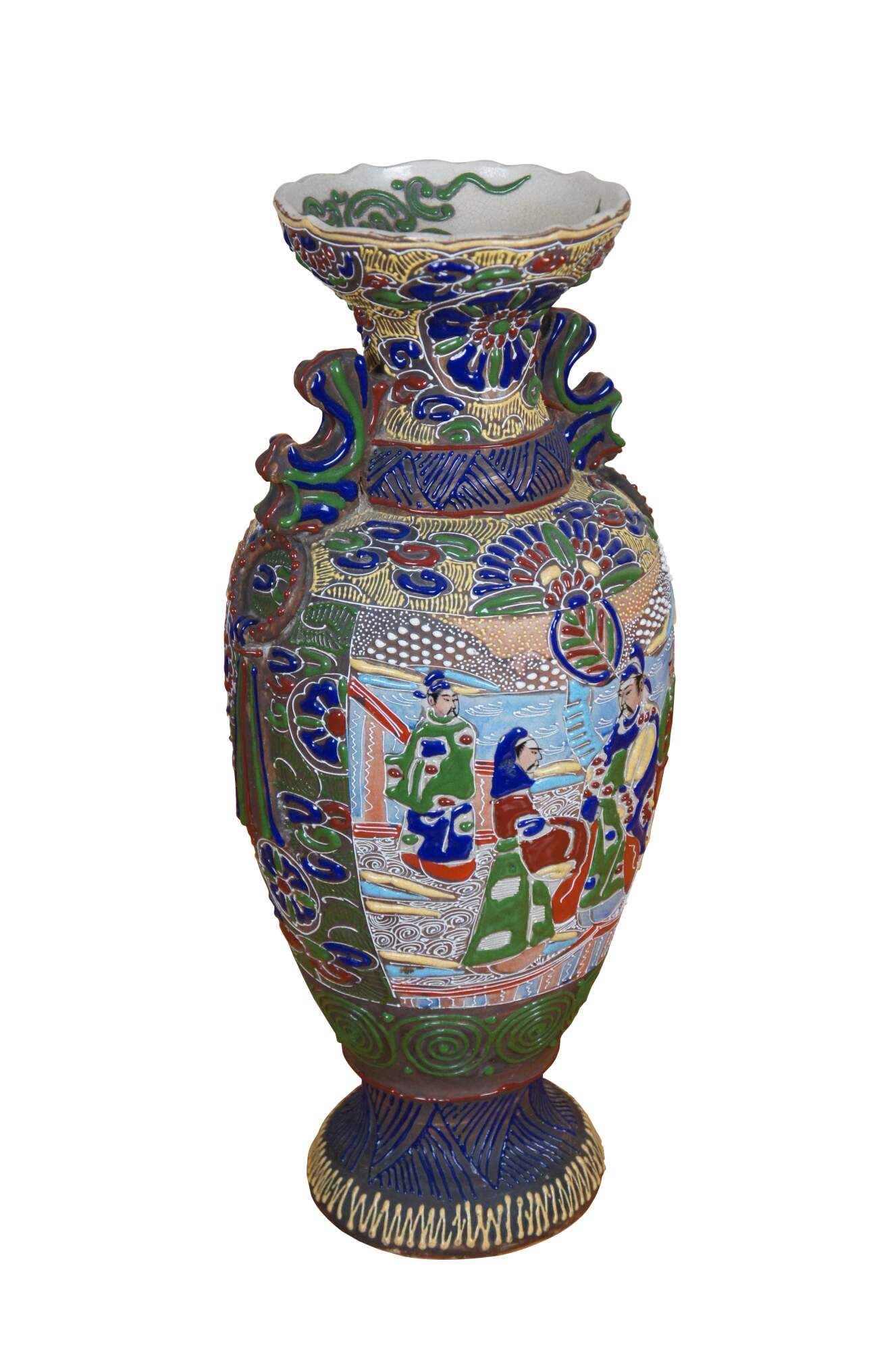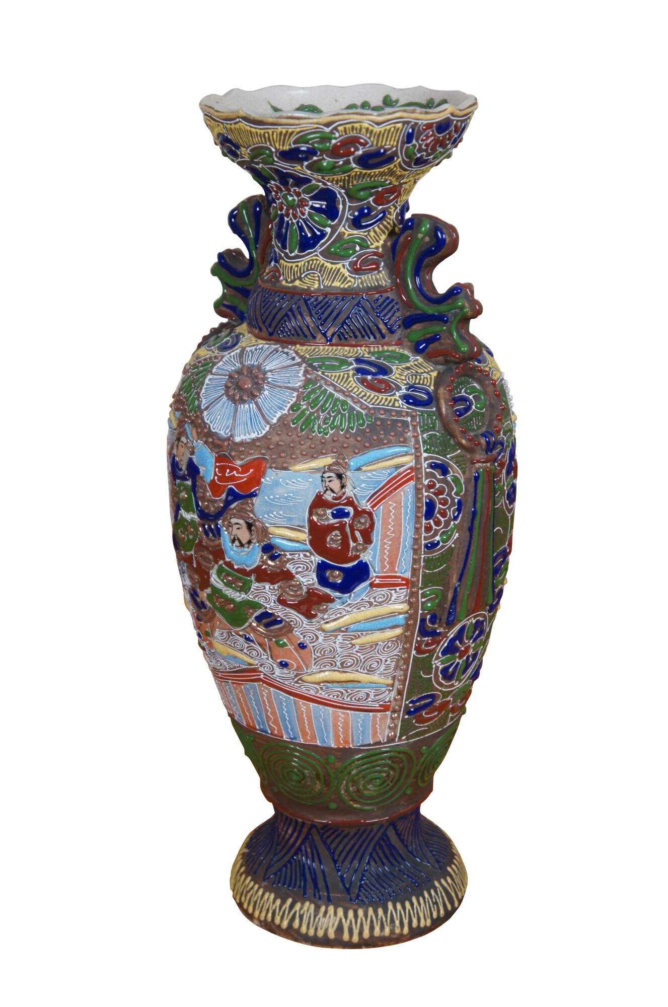 Antique Meiji period Japanese satsuma style moriage vase featuring a multicolored floral enamel design in bold relief framing two scenes with figures and half-moon handles.