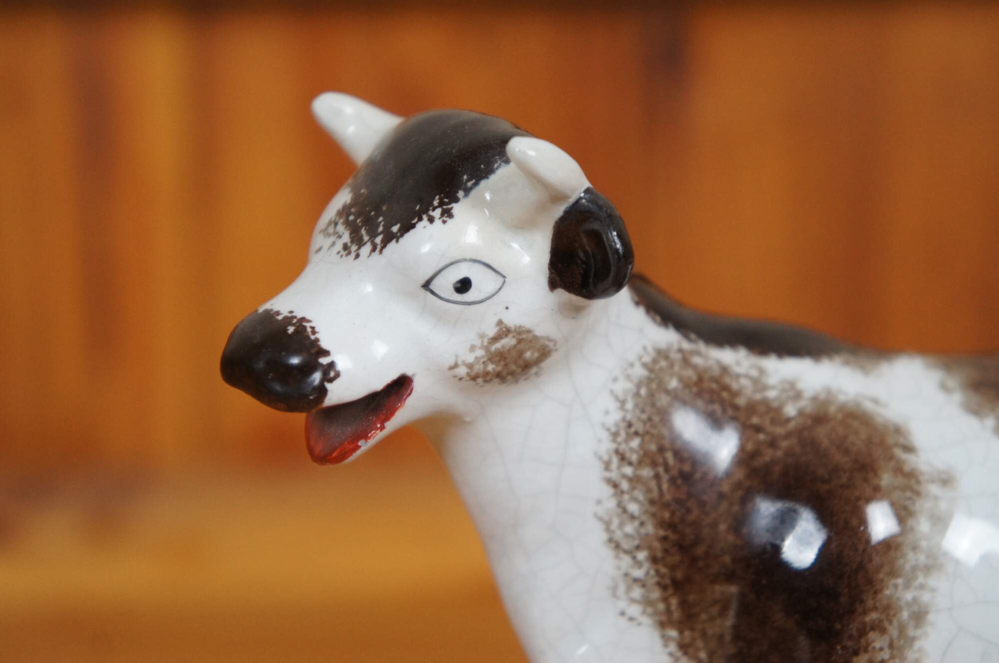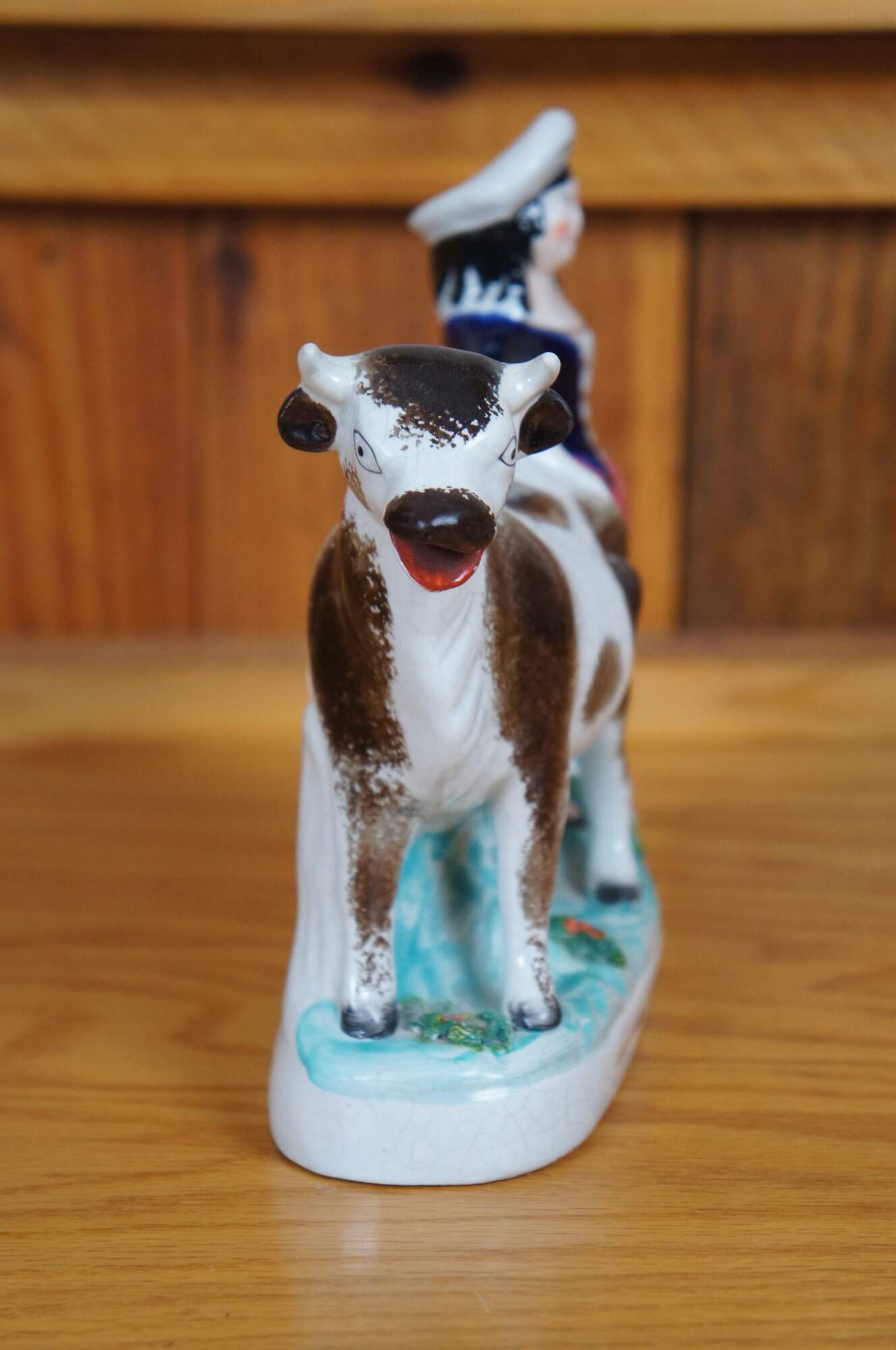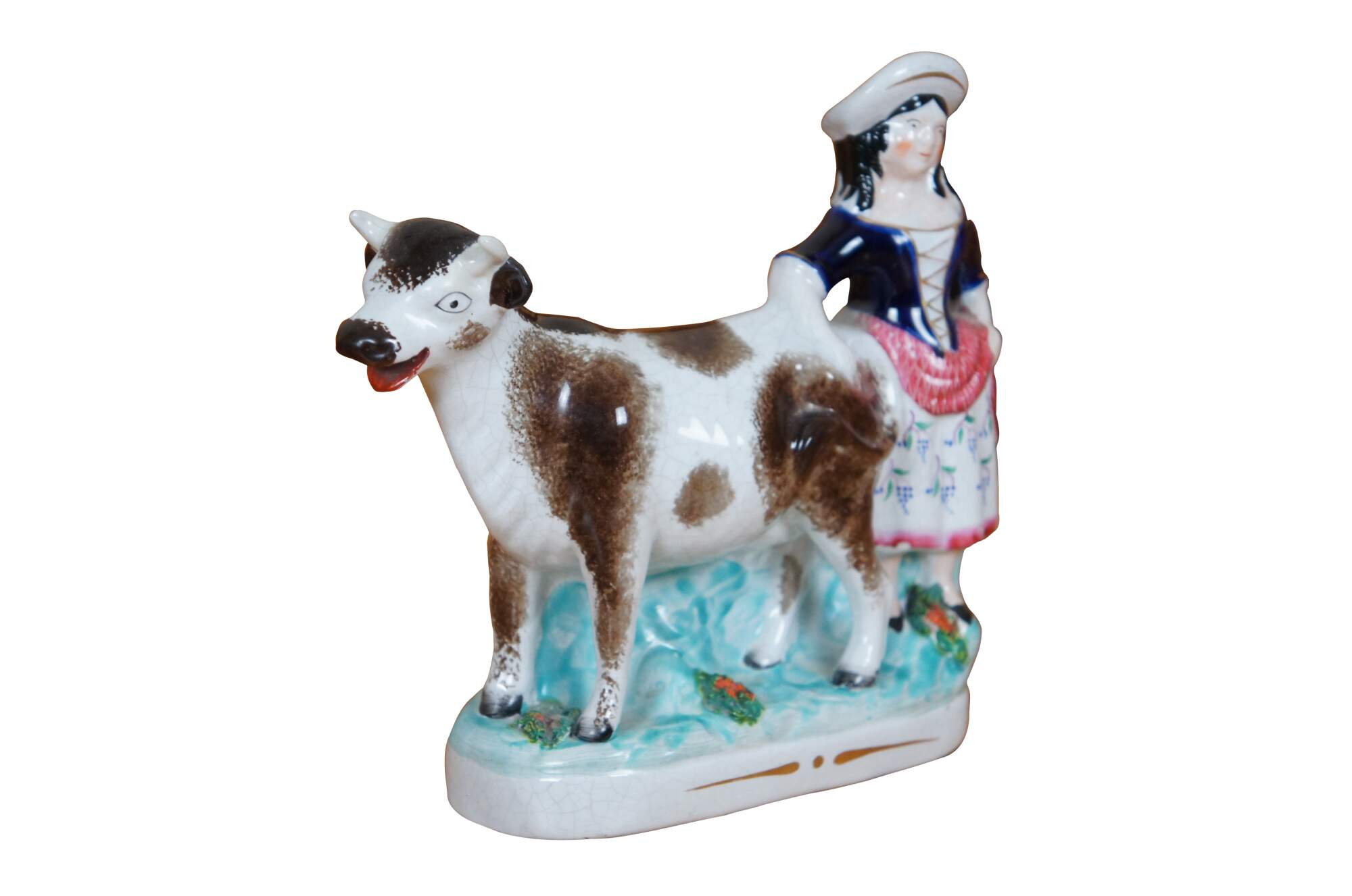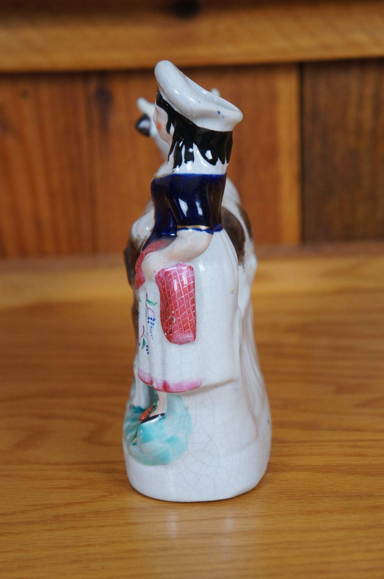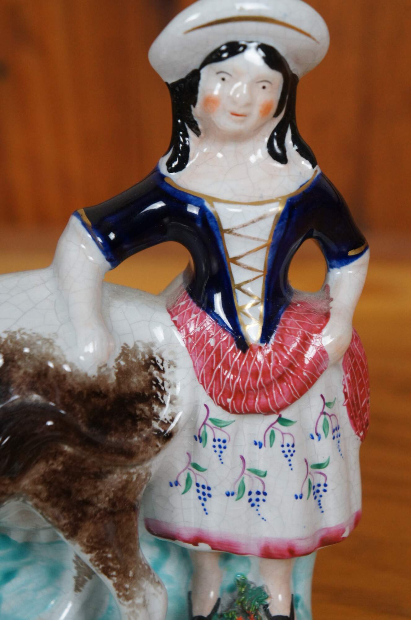 Antique 19th century staffordshire porcelain flatback figural spill vase or creamer in the shape of a woman with grapes on her skirt standing next to a very happy brown and white cown.
