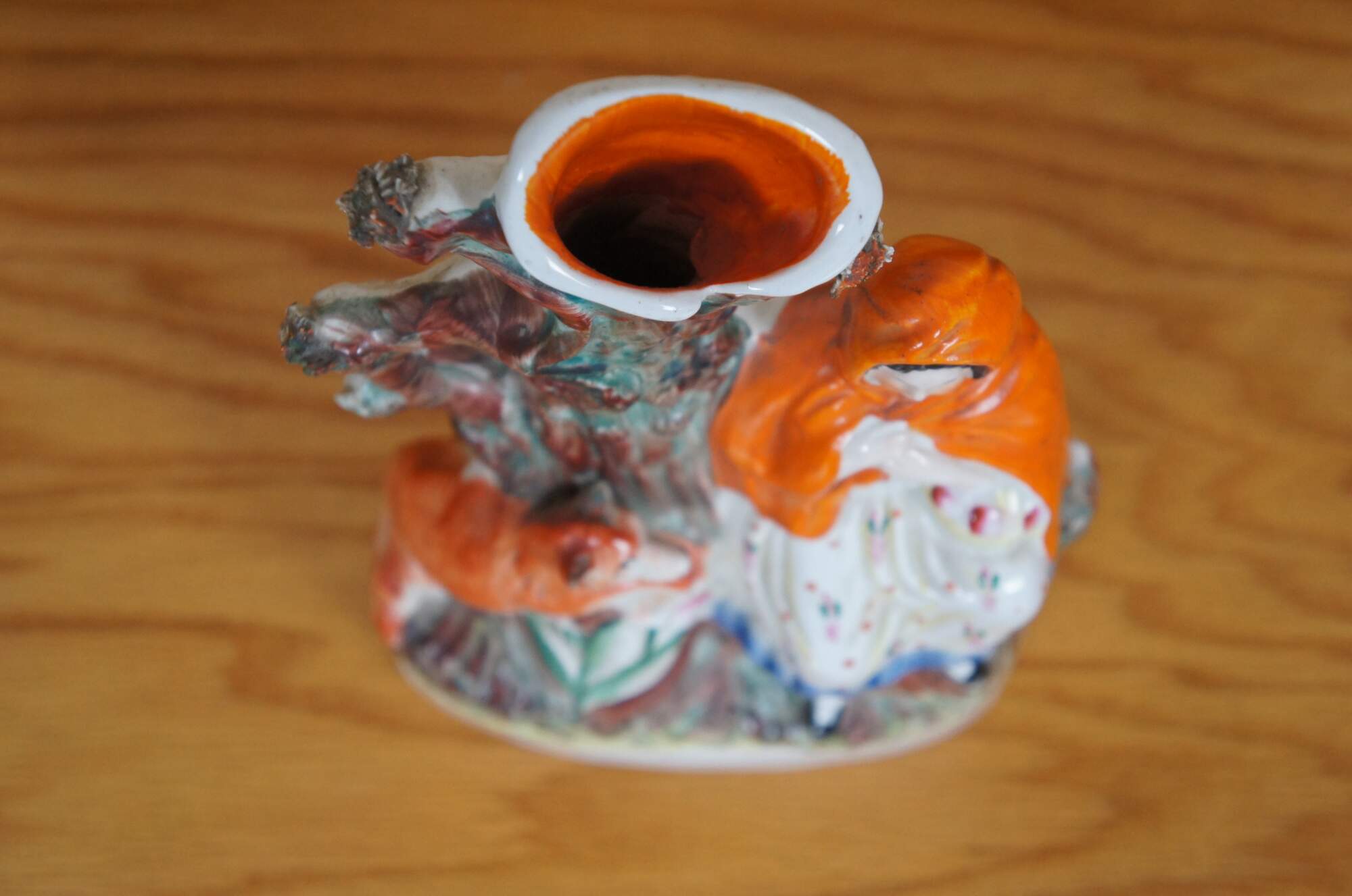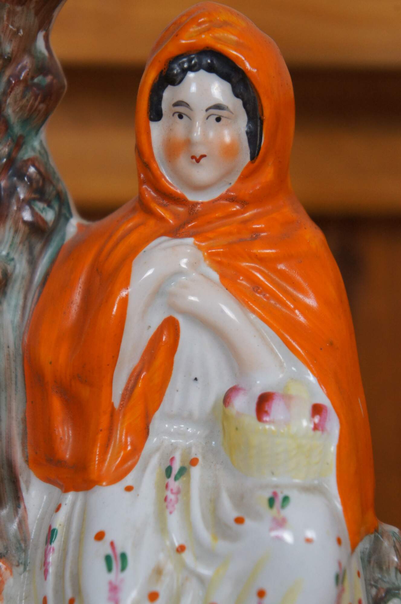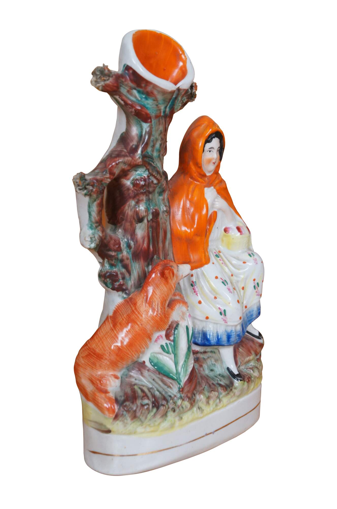 Antique 19th century Staffordshire porcelain flatback figural spill vase depicting fairy tale figure Little Red Riding Hood and the wolf standing next to a tree.