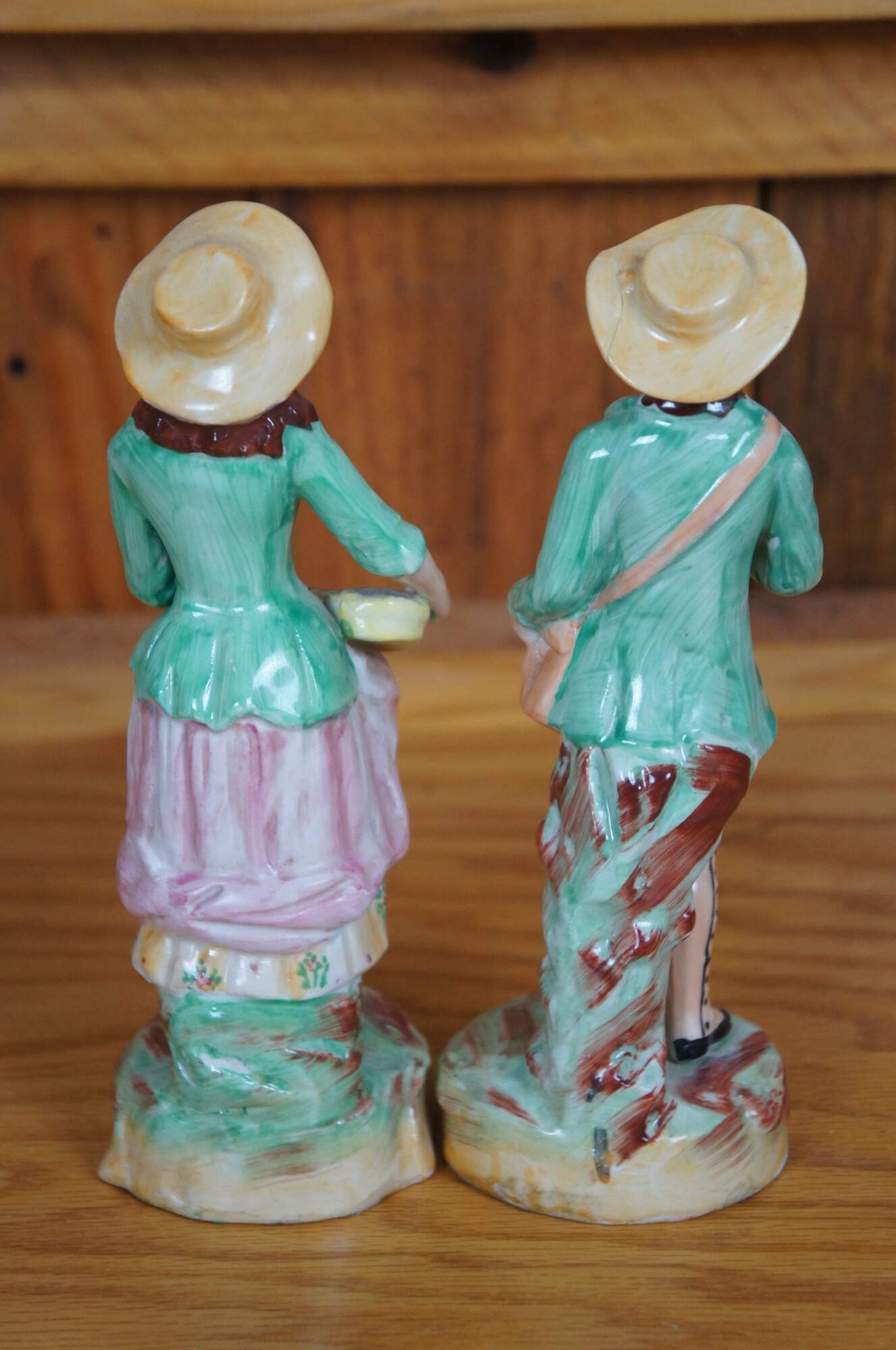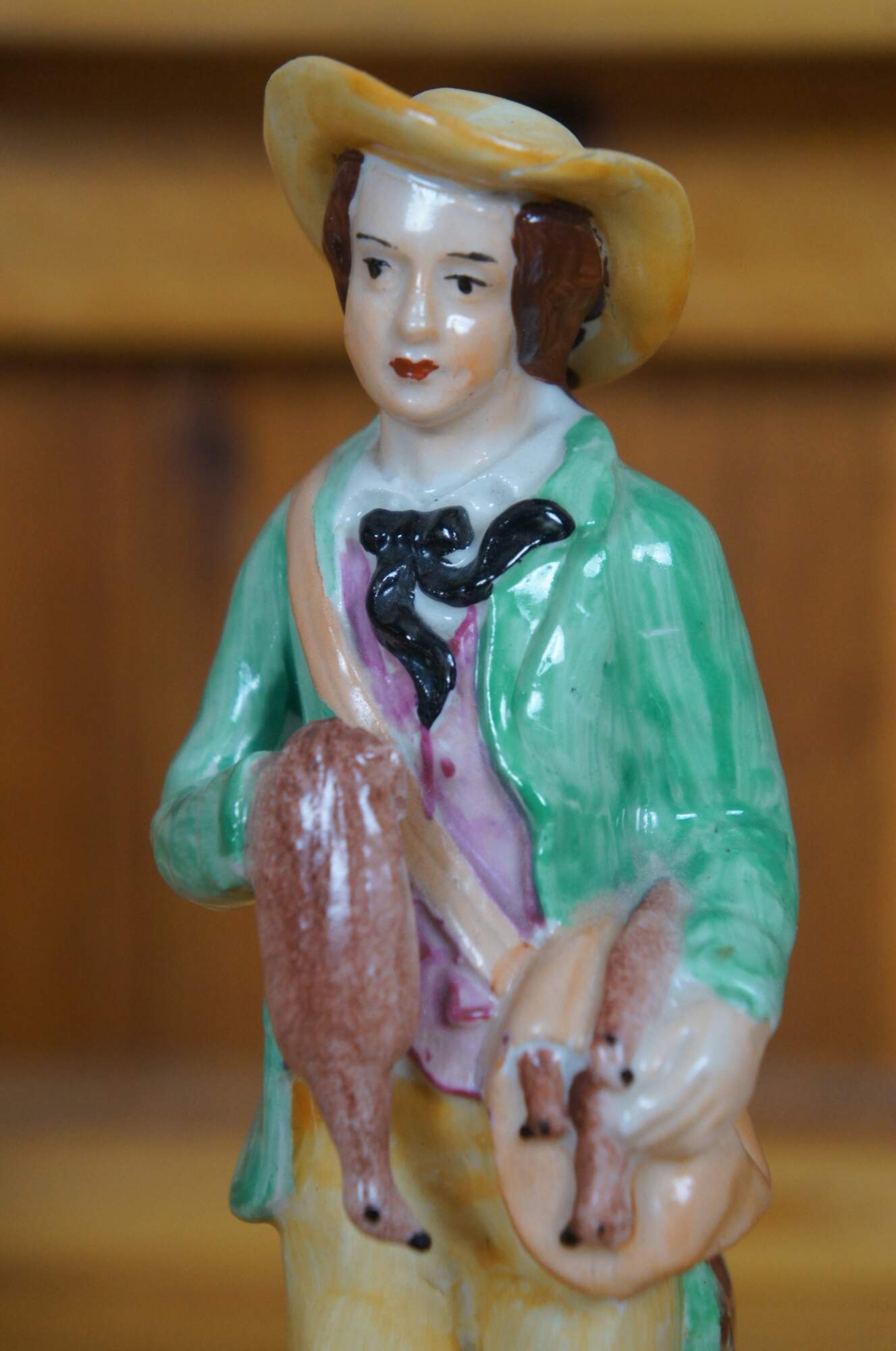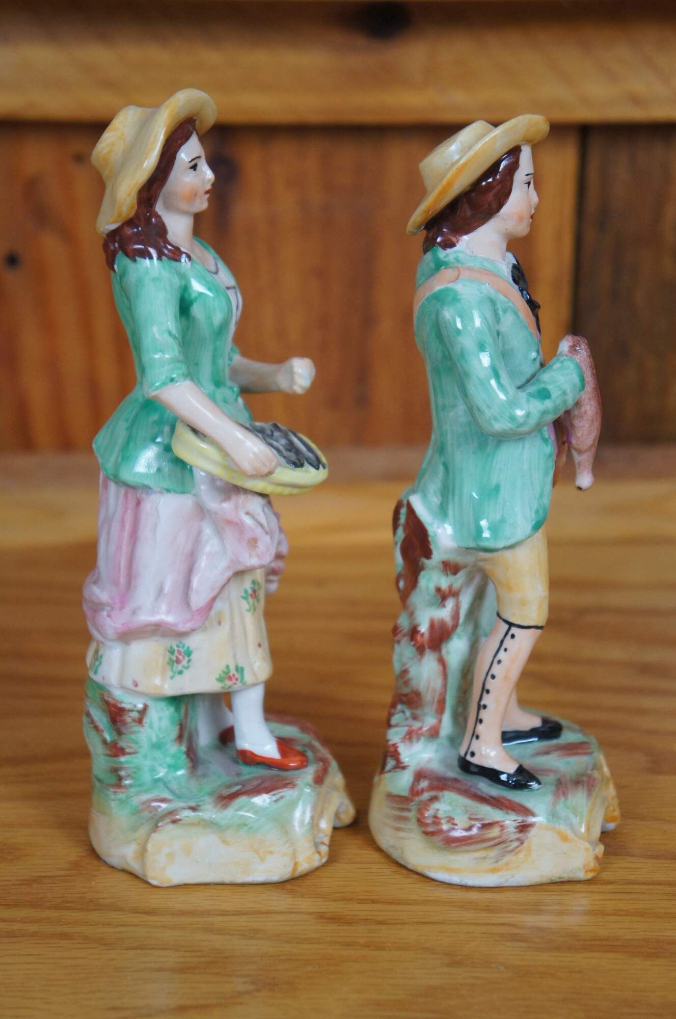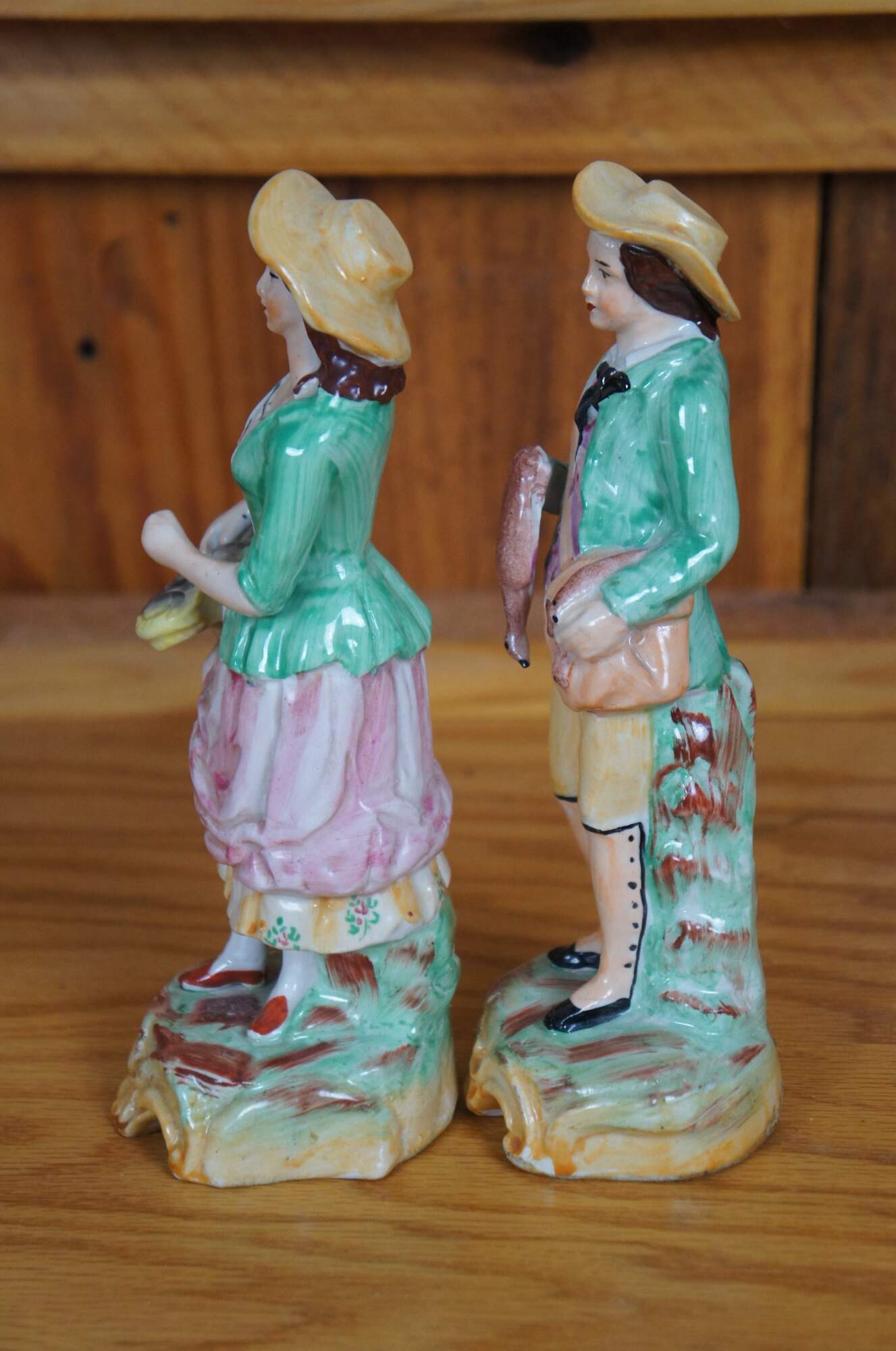 Old Staffordshire Ware England porcelain figurines depicting a pair of figures in green, pink, and yellow, carrying a basket of fish and game pheasants / birds. Marked on bases.