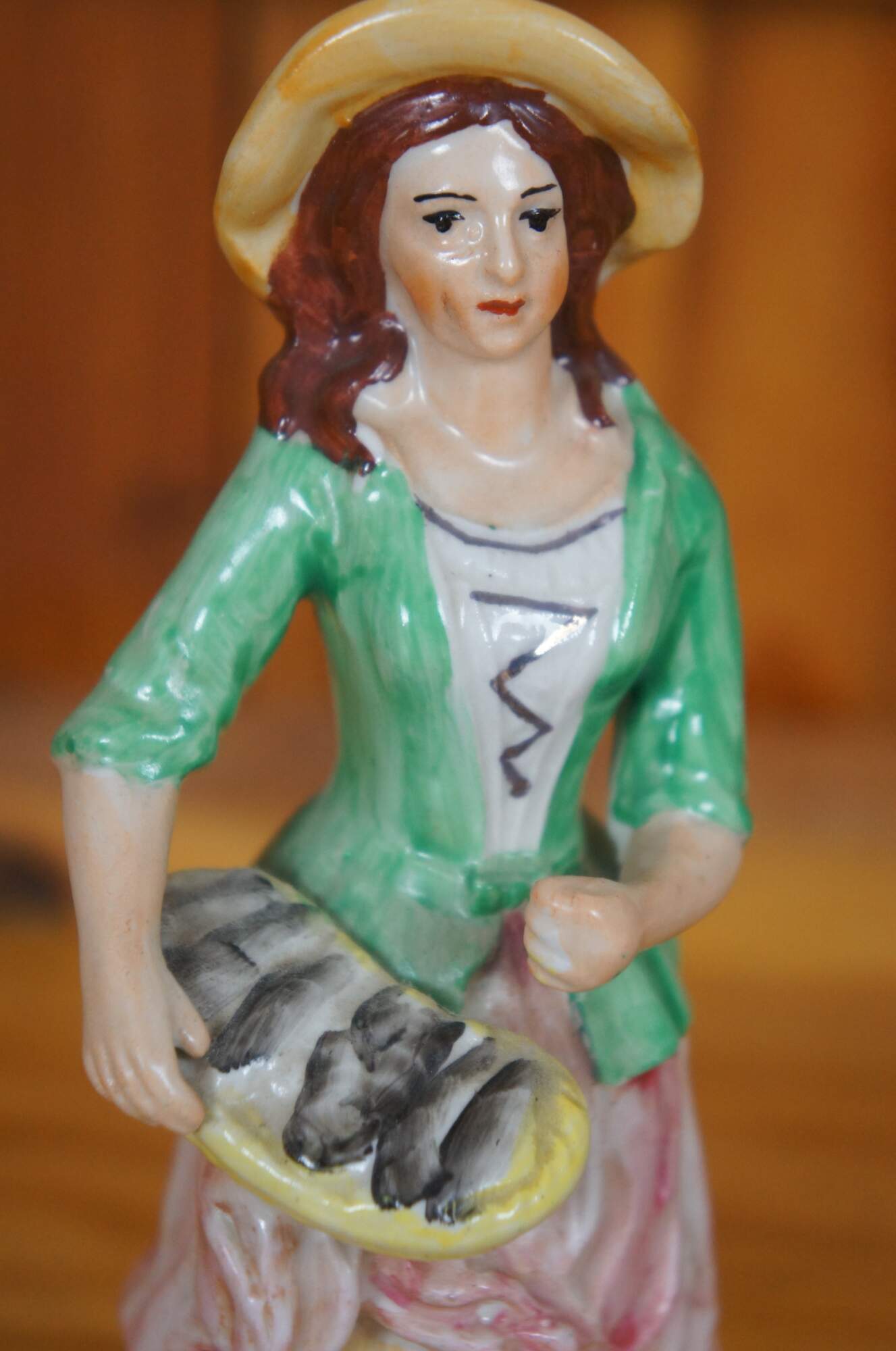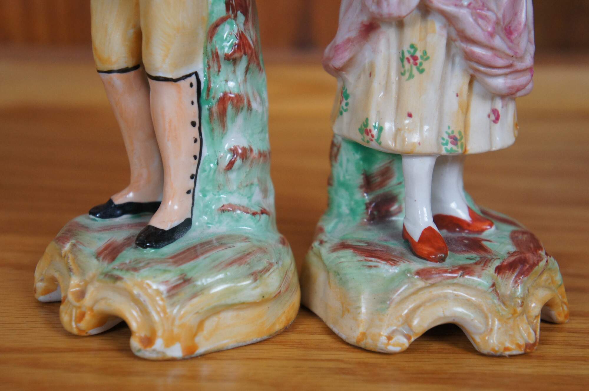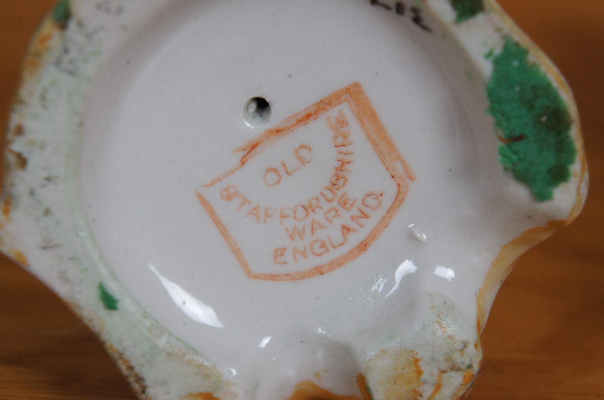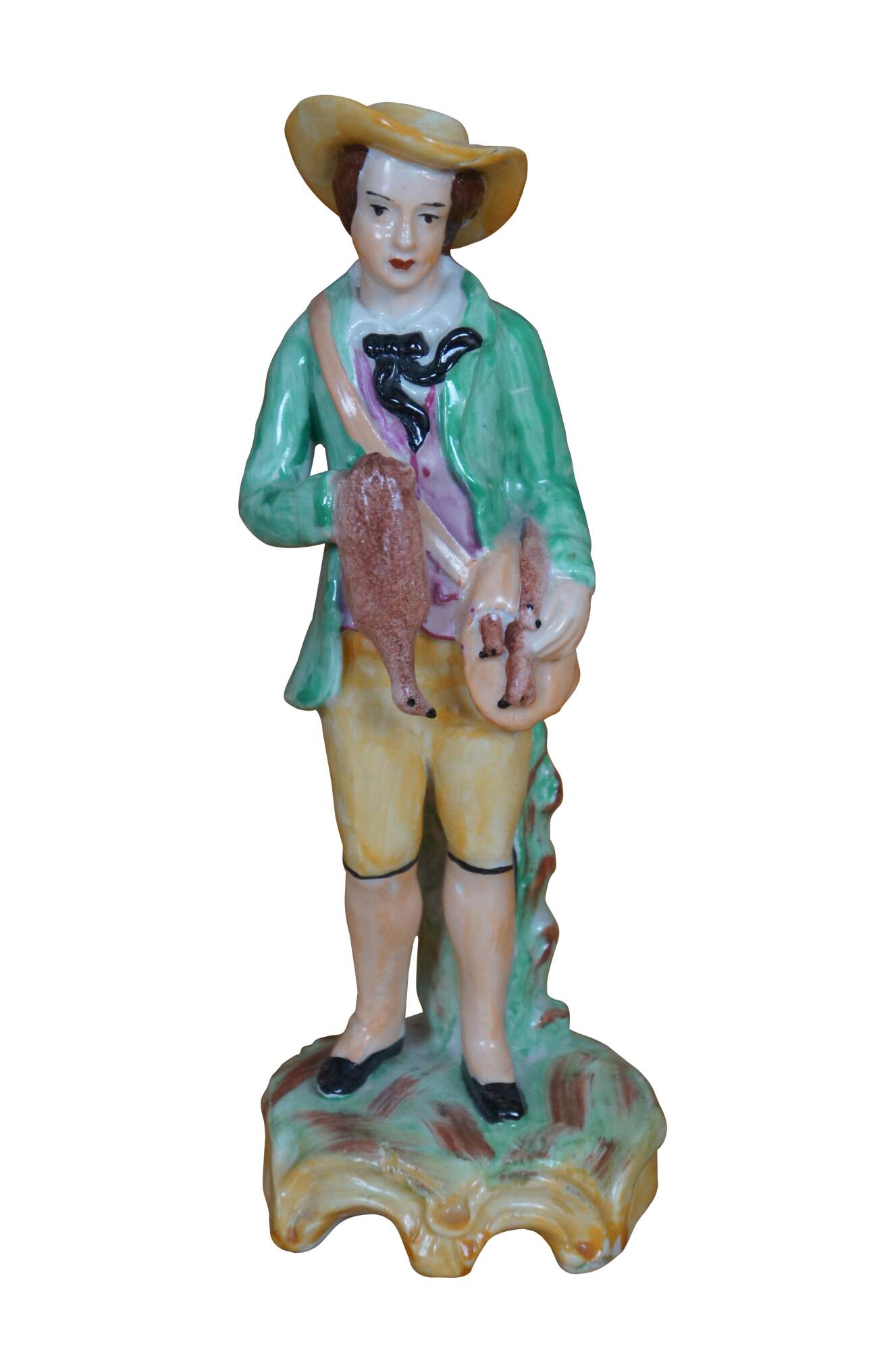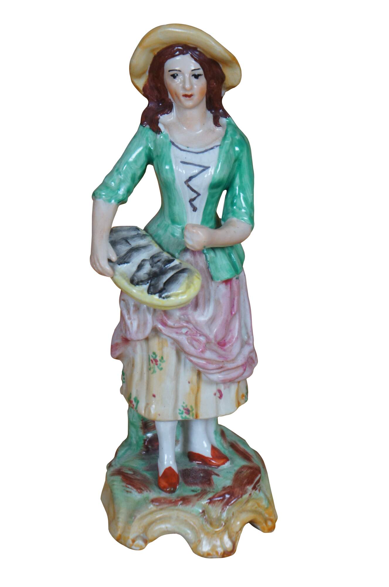 Old Staffordshire Ware England porcelain figurines depicting a pair of figures in green, pink, and yellow, carrying a basket of fish and game pheasants / birds. Marked on bases.