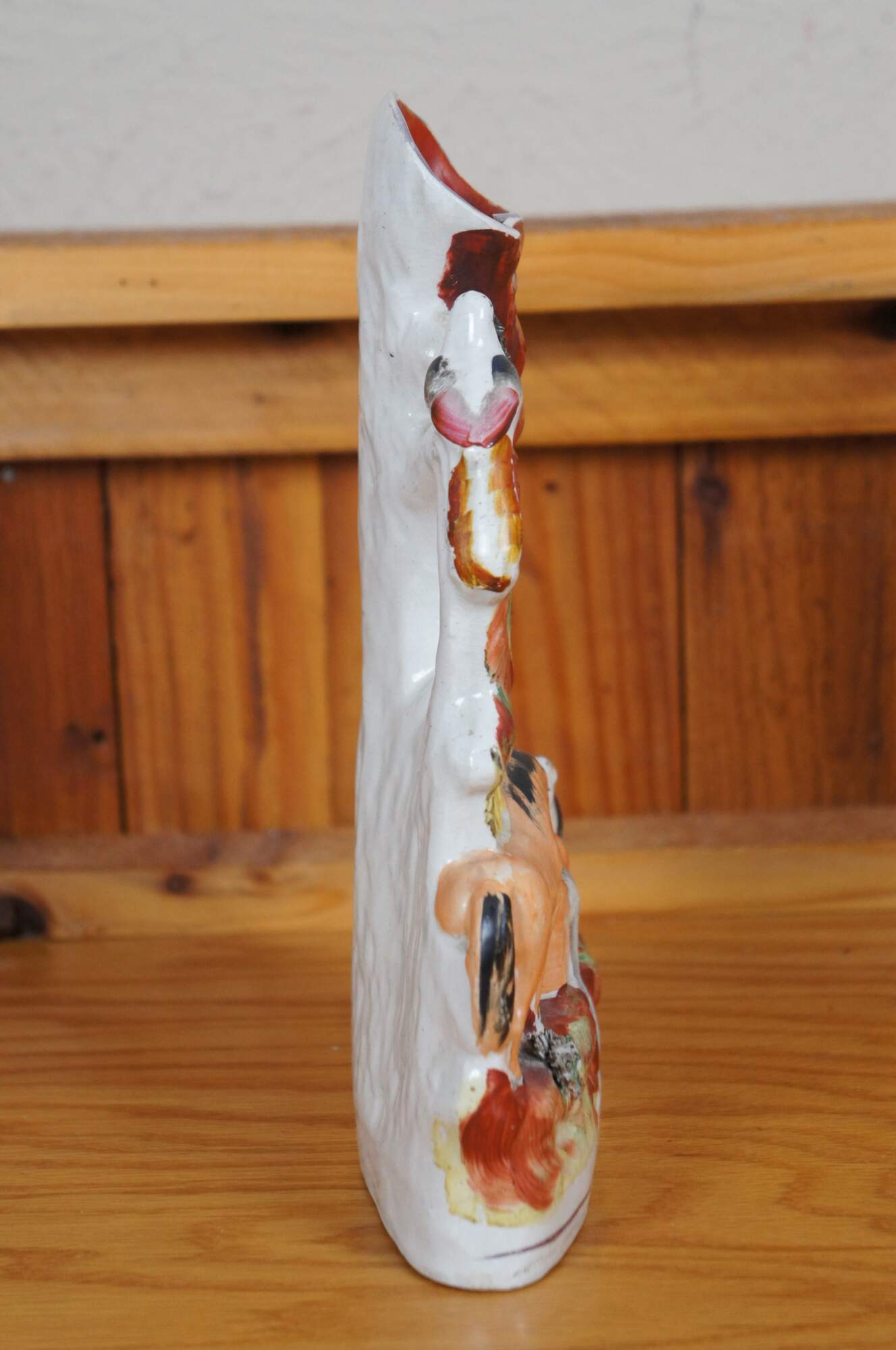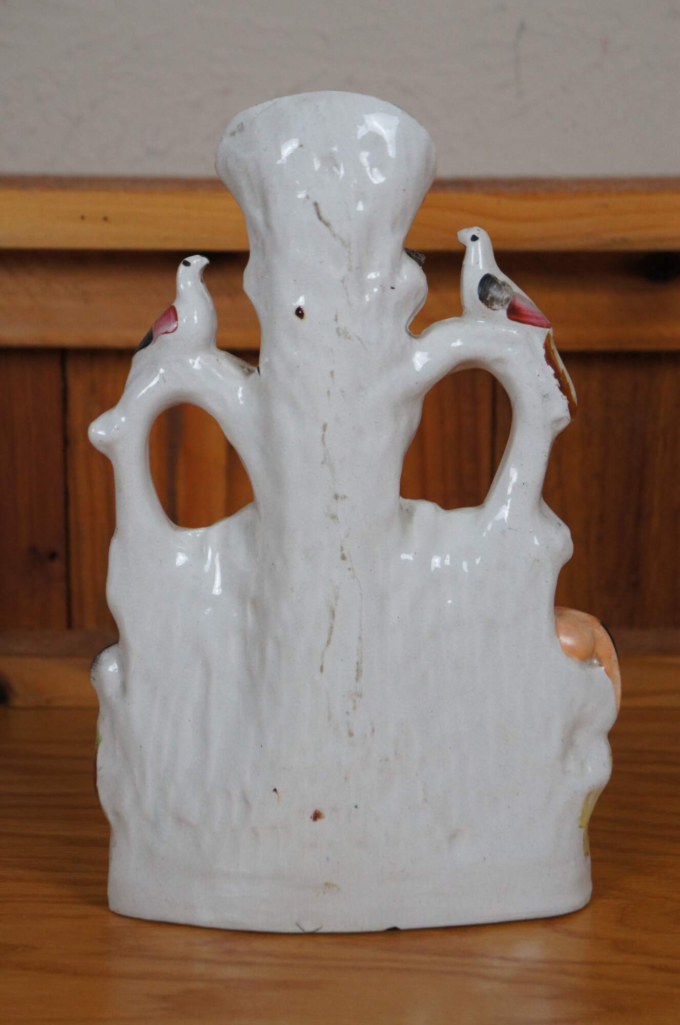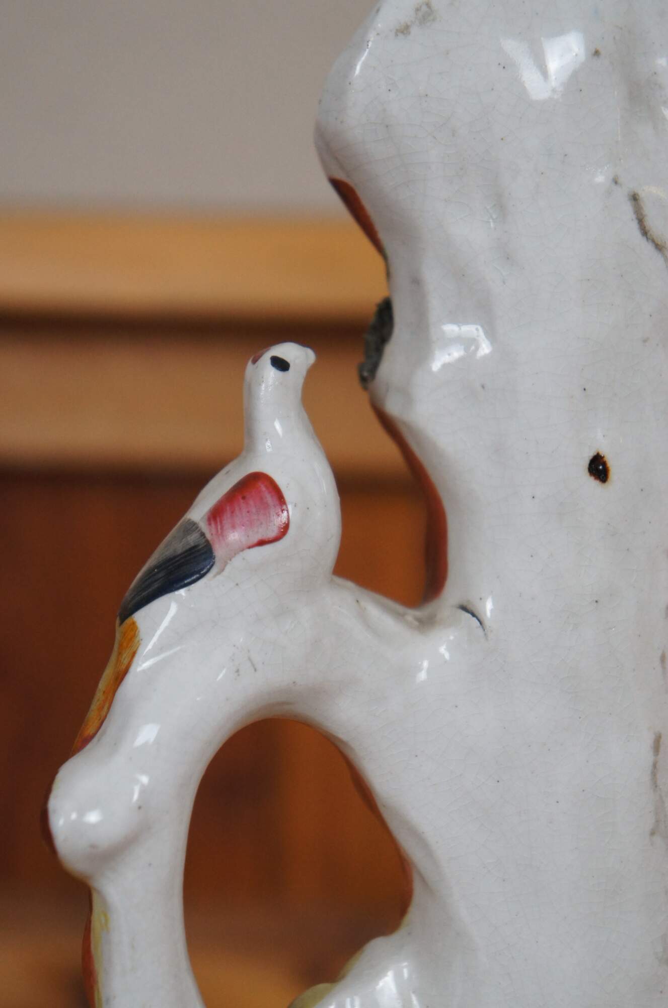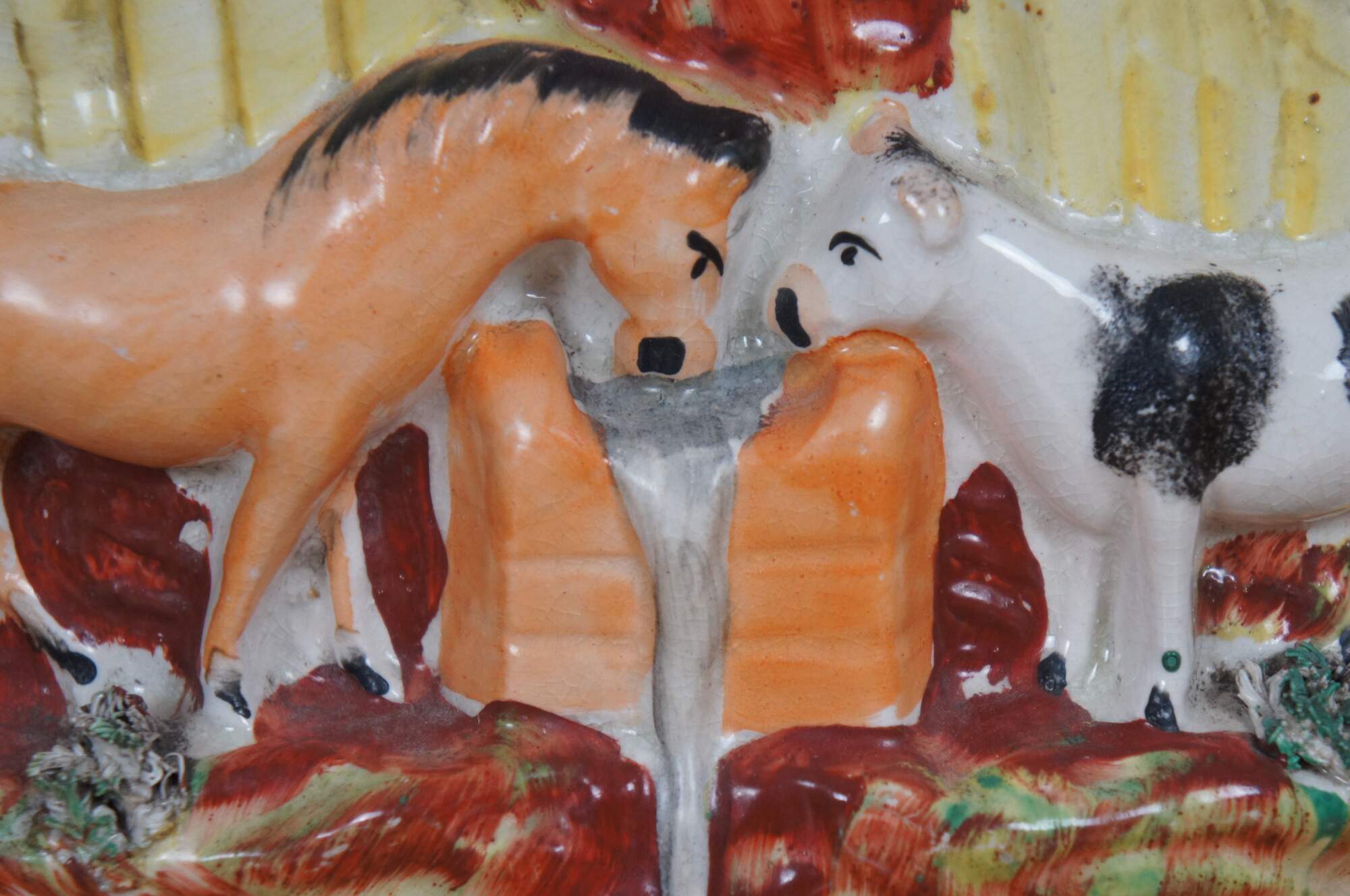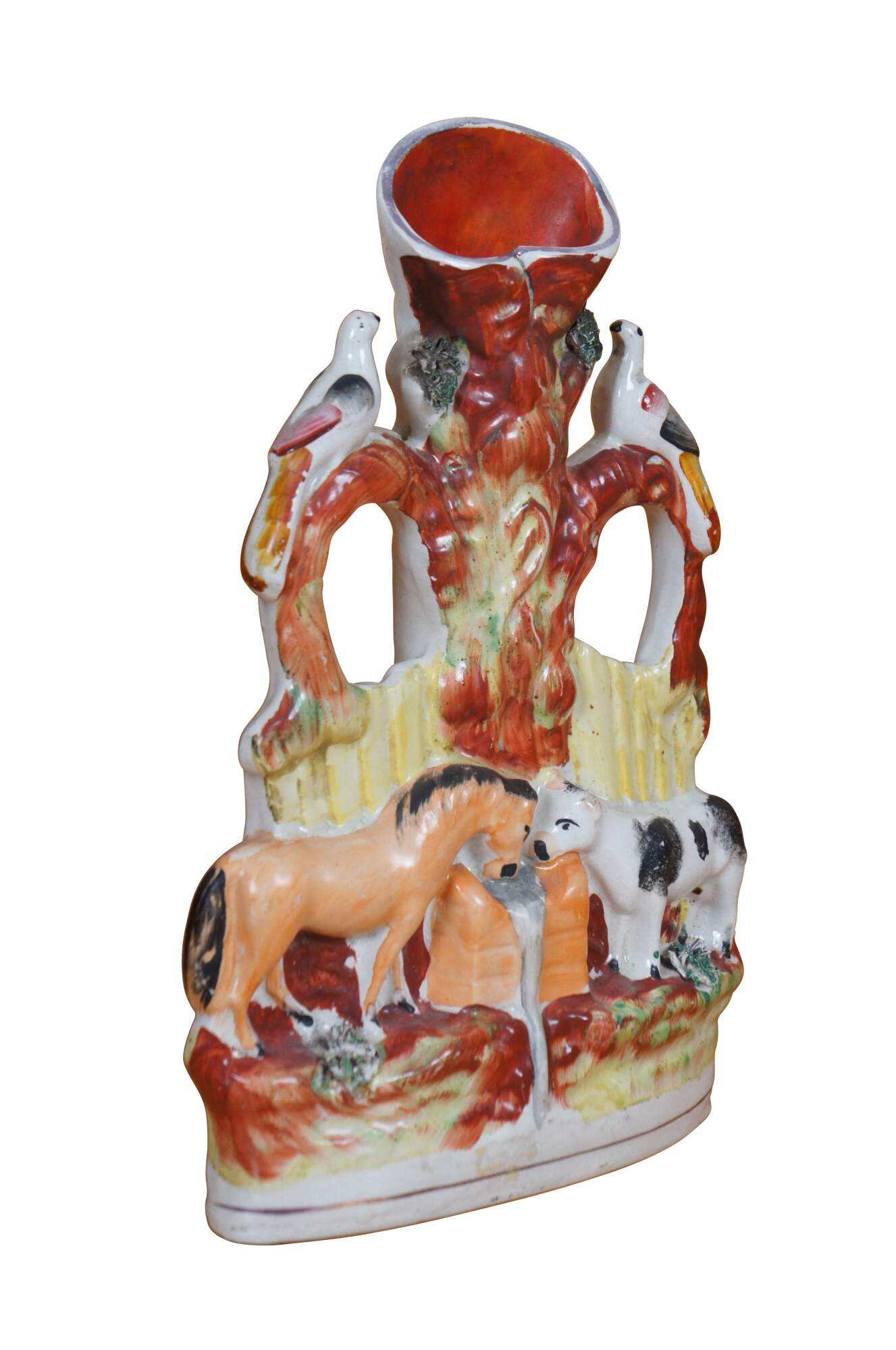 Antique 19th century Staffordshire porcelain flatback figural spill vase known as Good Companions - depicting a rural farm scene with horse and cow drinking together at an overflowing water trough or tree of life style fountain, at the base of a tree on whose curved branches perch a pair of birds. Circa 1870s.