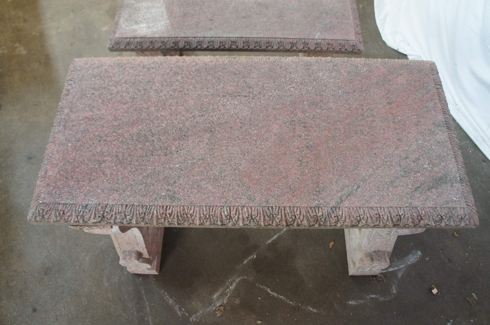 Classical Italian Revival Sculpted Granite Picnic Patio Table & Benches. Features acanthus carved edges and scrolled supports. Great for use in the garden or on your porch. Breaks down for ease of moving.
