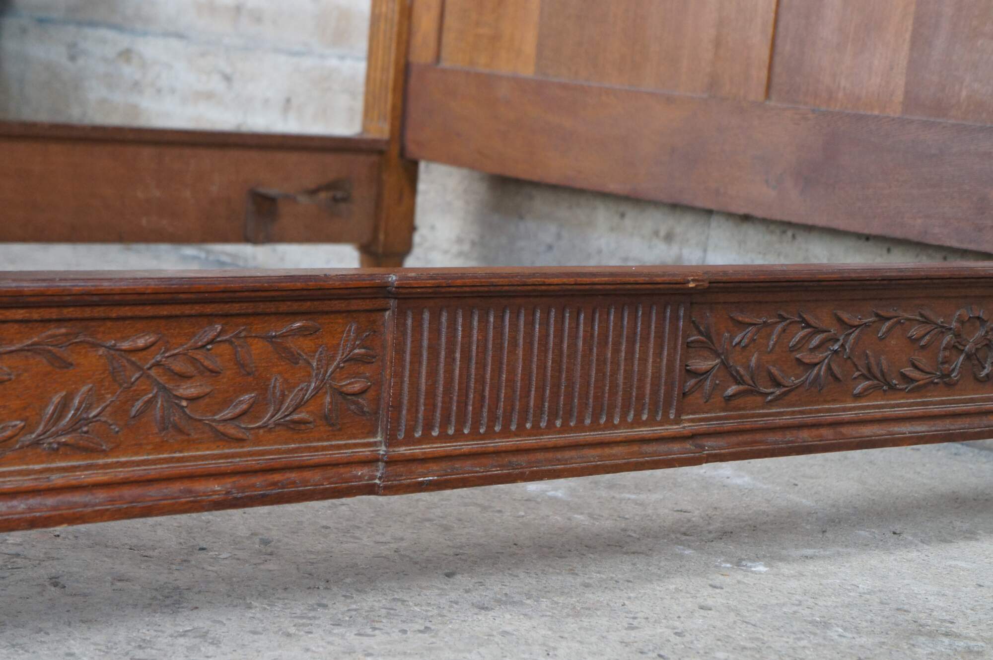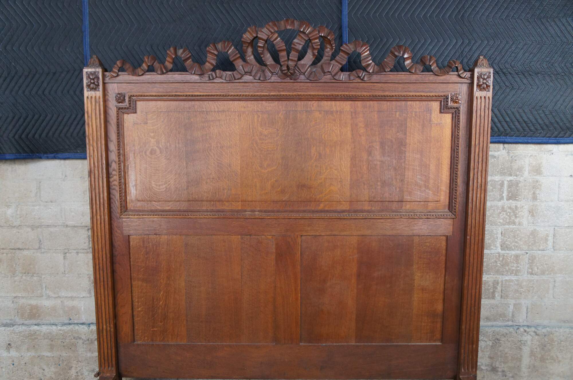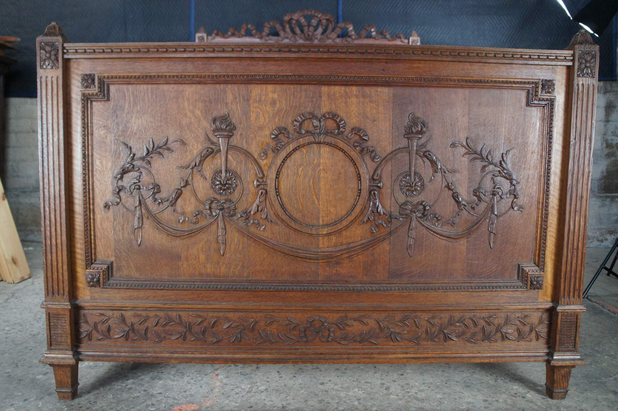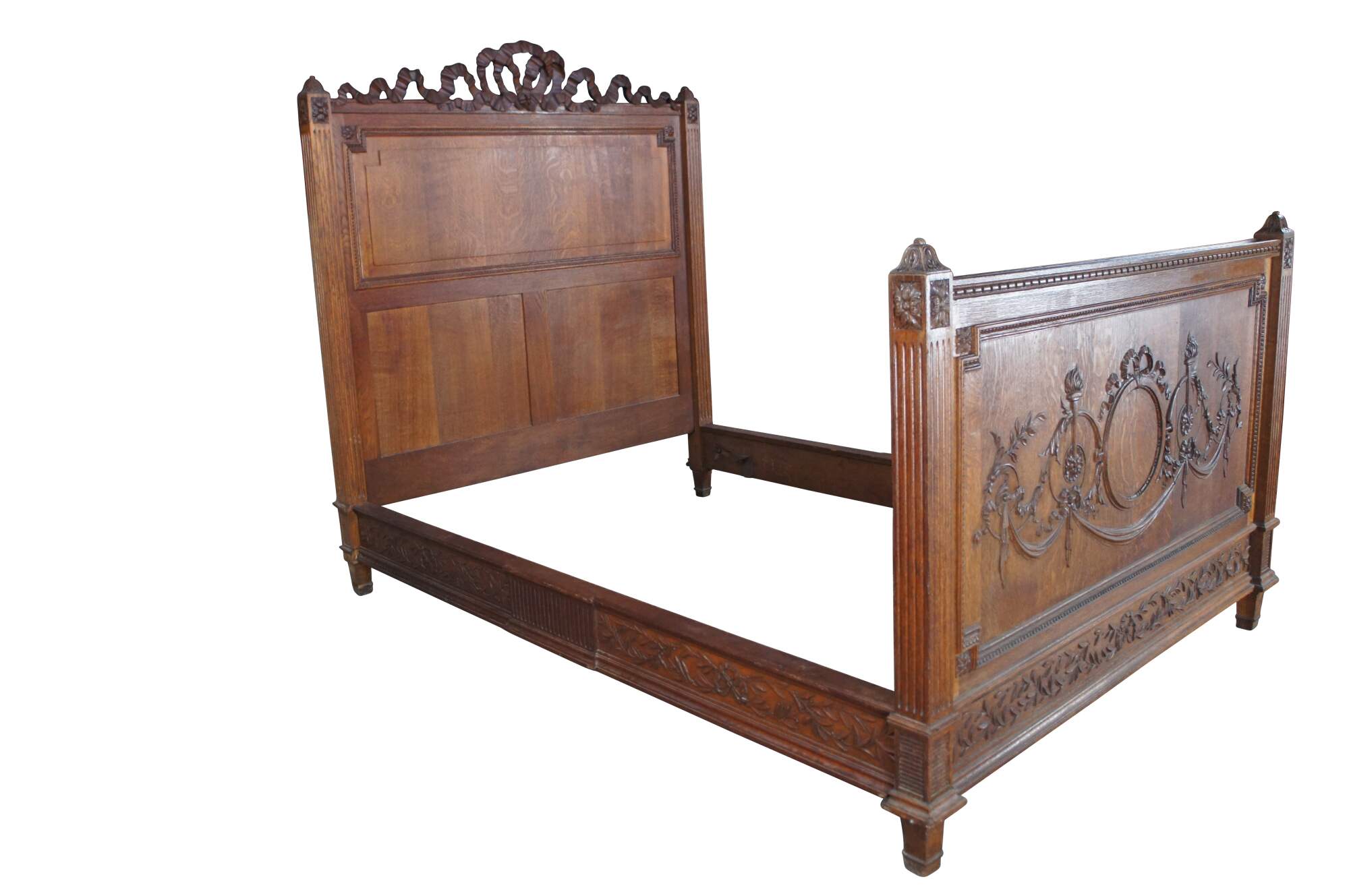 Exquisite antique 19th century French Louis XVI Full Size Bed. Made from solid quartersawn oak with meticulous carving throughout. Features square fluted posts with French medallions. The footboard is beautifully carved with a neoclassical scene showcasing ribbons, torchieres, scrolling foliate and swag. The scene is inset and framed in a panel with stepped dentil molding. Lower apron has a ribbon at the center flanked by an intertwined vine motif. This motif continues along the side rails with some fluting at the center. The final touch of this masterpiece can be seen along the crown of the headboard in a flowing serpentine pierced and carved ribbon and bow motif. This elaborate and large scale carving is rarely found in pieces from this period. The frame is supported by square tapered feet. Side rails have metal L brackets to support box spring and mattress. The perfect addition to any space.