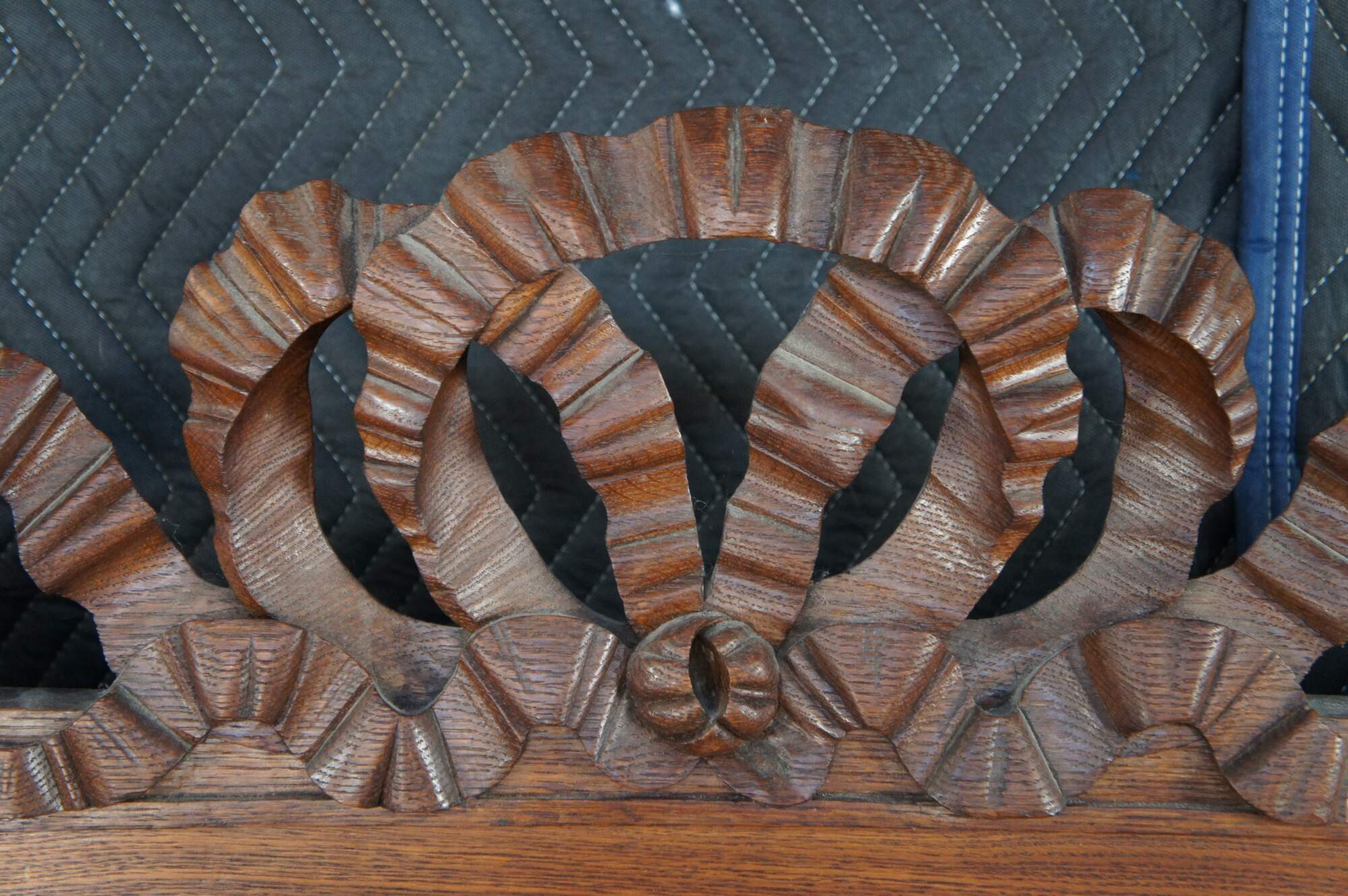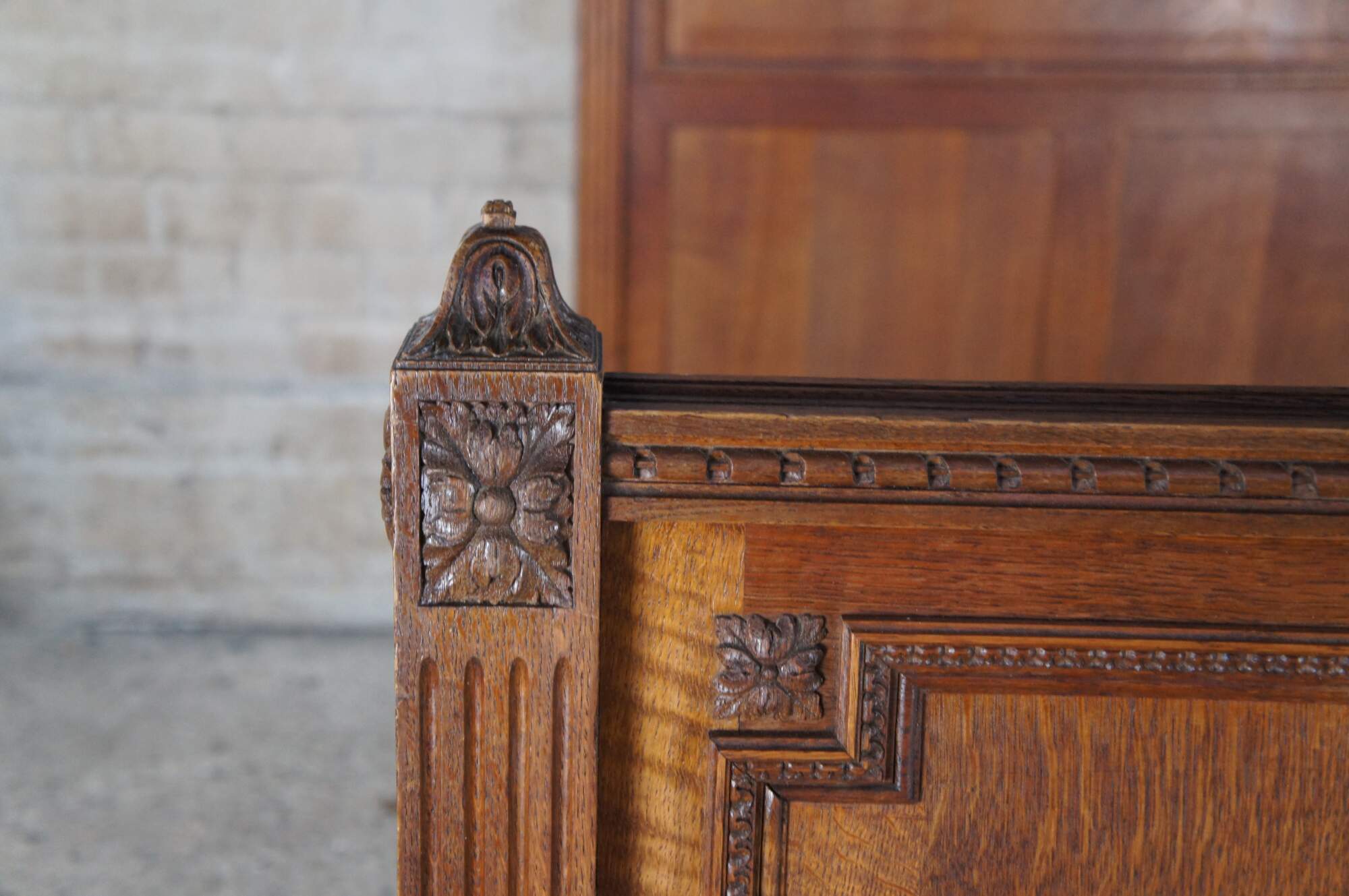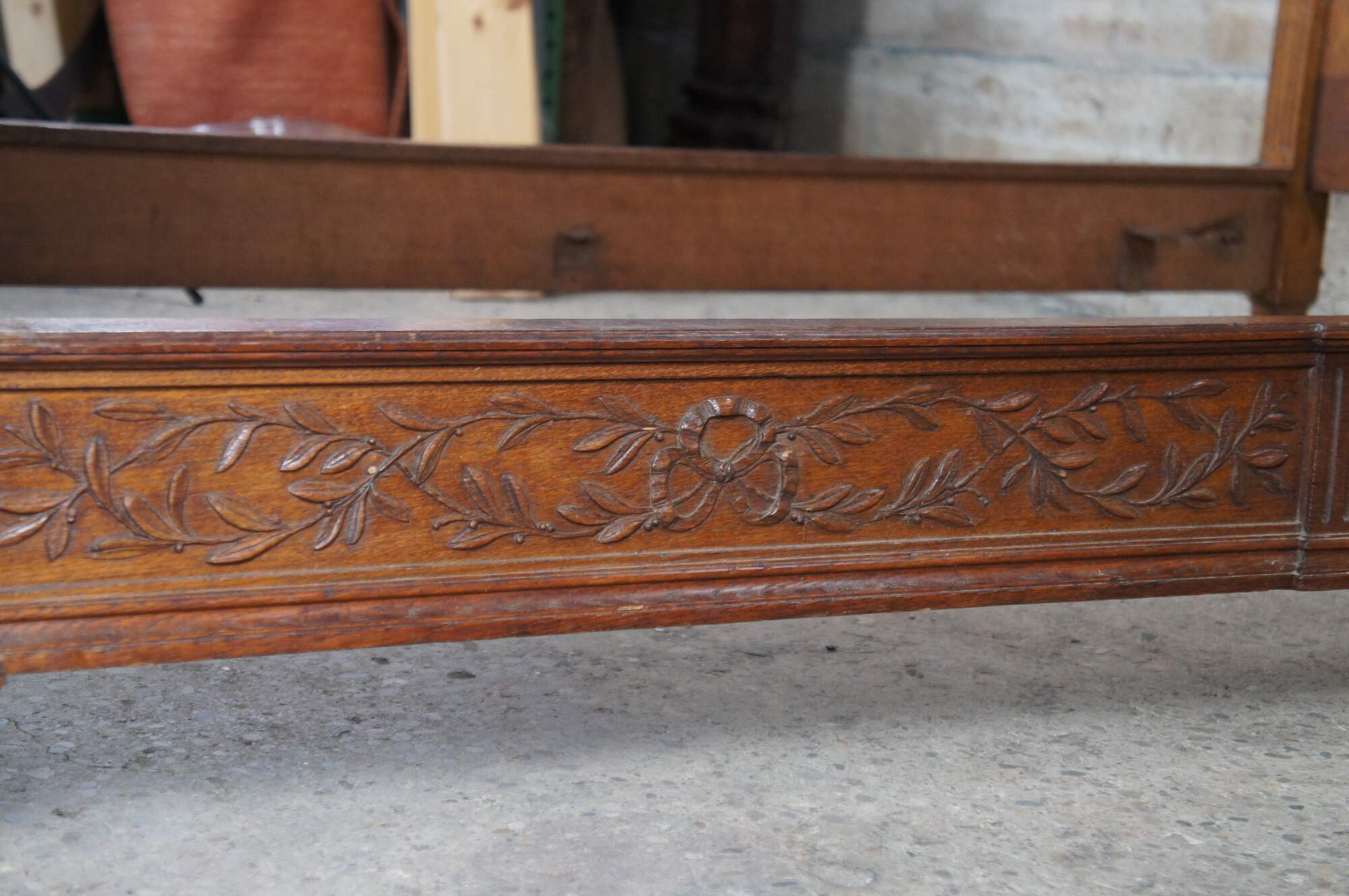 Exquisite antique 19th century French Louis XVI Full Size Bed. Made from solid quartersawn oak with meticulous carving throughout. Features square fluted posts with French medallions. The footboard is beautifully carved with a neoclassical scene showcasing ribbons, torchieres, scrolling foliate and swag. The scene is inset and framed in a panel with stepped dentil molding. Lower apron has a ribbon at the center flanked by an intertwined vine motif. This motif continues along the side rails with some fluting at the center. The final touch of this masterpiece can be seen along the crown of the headboard in a flowing serpentine pierced and carved ribbon and bow motif. This elaborate and large scale carving is rarely found in pieces from this period. The frame is supported by square tapered feet. Side rails have metal L brackets to support box spring and mattress. The perfect addition to any space.