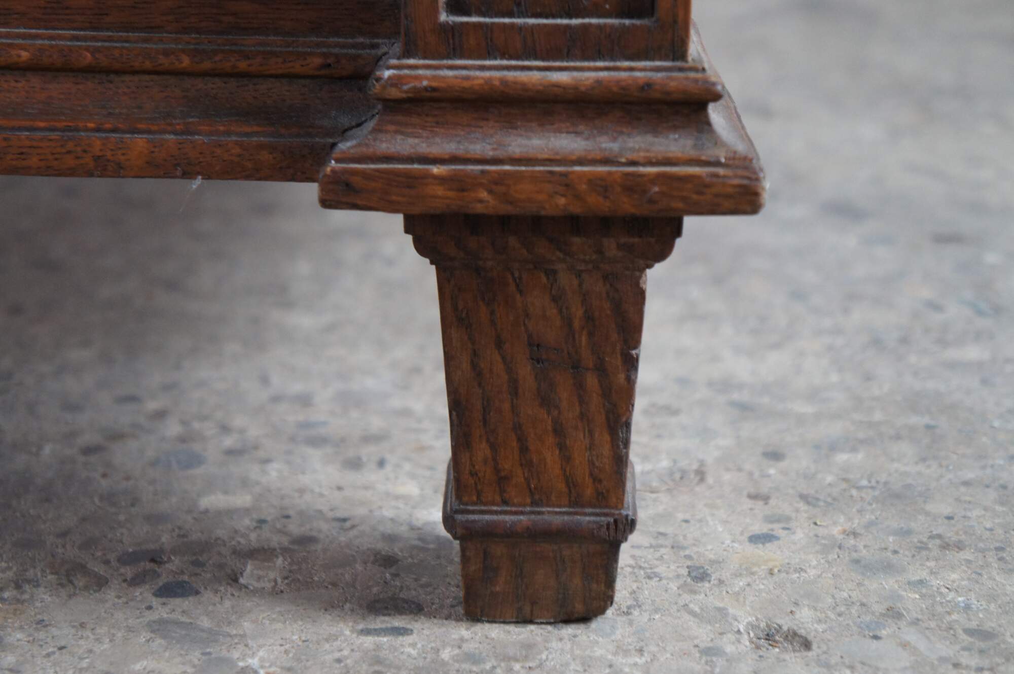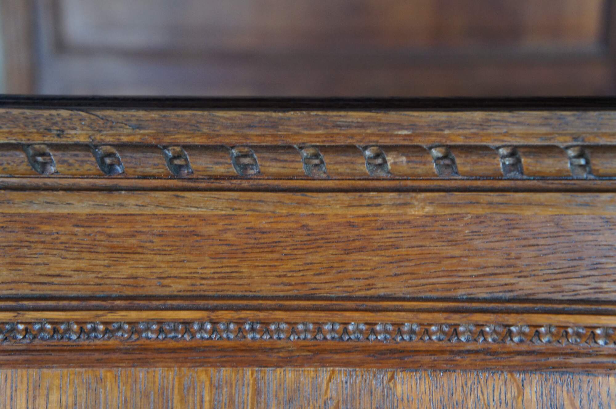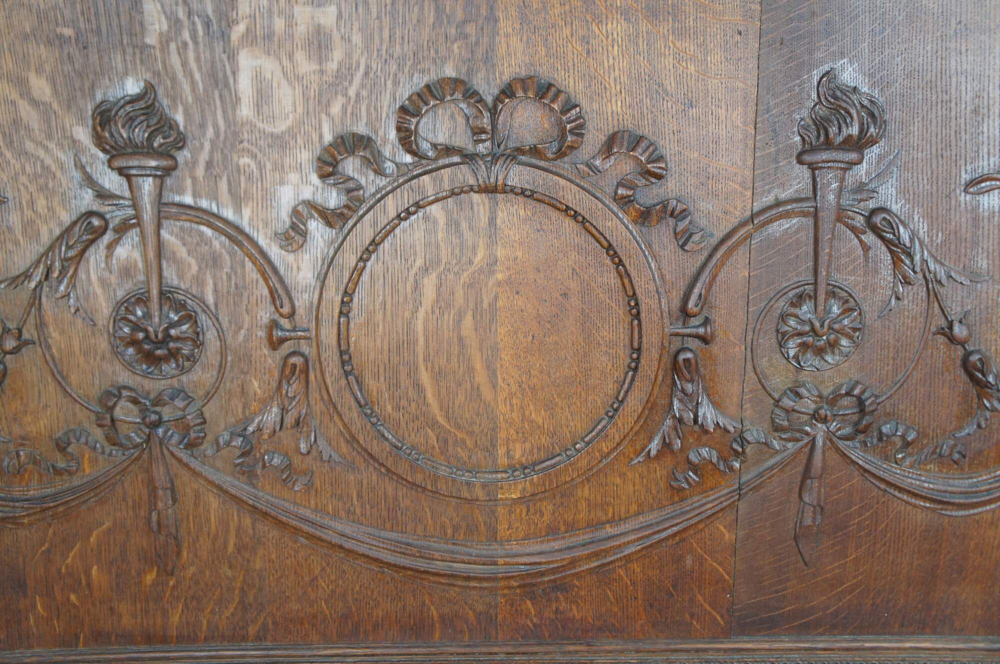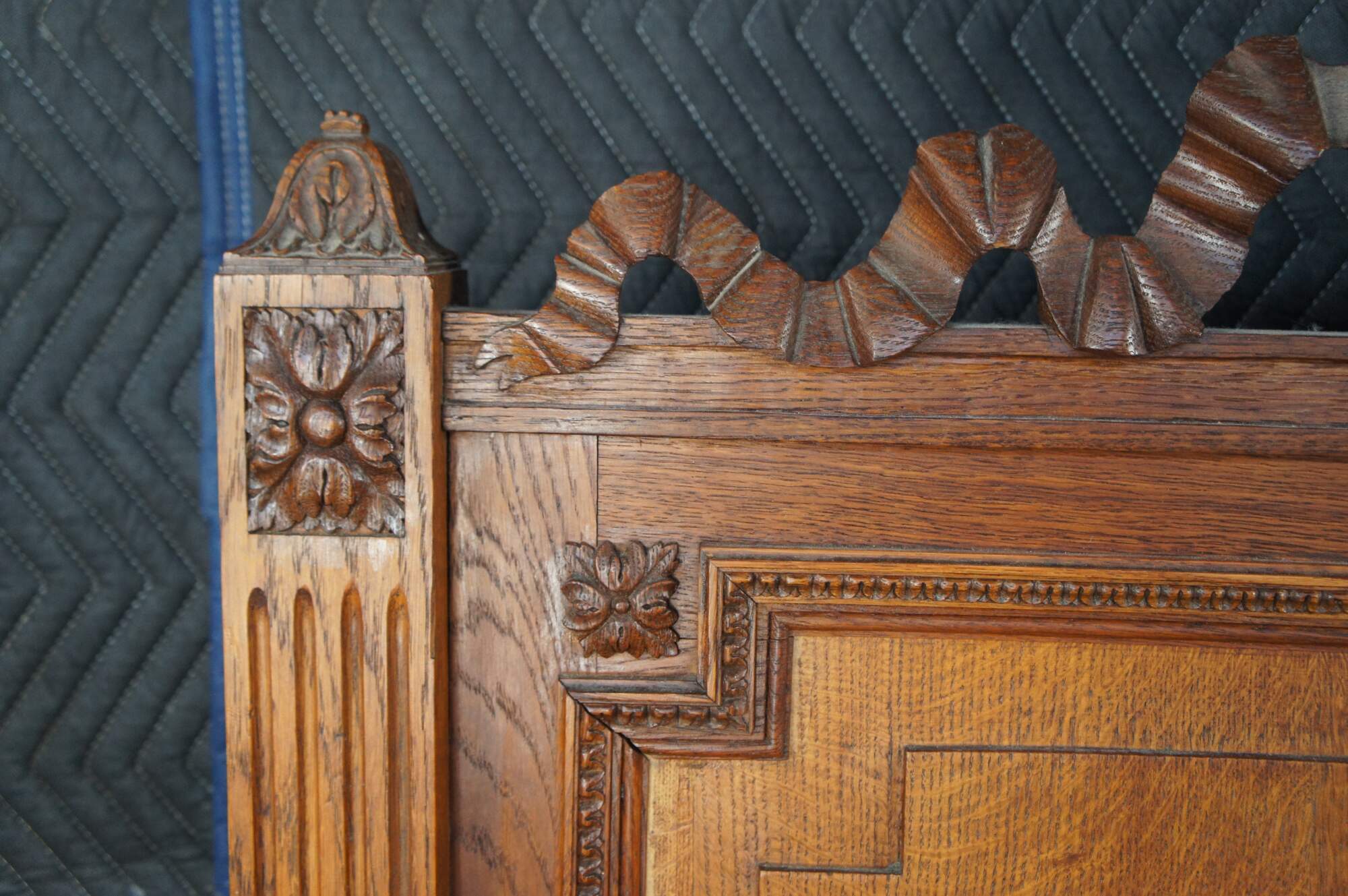 Exquisite antique 19th century French Louis XVI Full Size Bed. Made from solid quartersawn oak with meticulous carving throughout. Features square fluted posts with French medallions. The footboard is beautifully carved with a neoclassical scene showcasing ribbons, torchieres, scrolling foliate and swag. The scene is inset and framed in a panel with stepped dentil molding. Lower apron has a ribbon at the center flanked by an intertwined vine motif. This motif continues along the side rails with some fluting at the center. The final touch of this masterpiece can be seen along the crown of the headboard in a flowing serpentine pierced and carved ribbon and bow motif. This elaborate and large scale carving is rarely found in pieces from this period. The frame is supported by square tapered feet. Side rails have metal L brackets to support box spring and mattress. The perfect addition to any space.