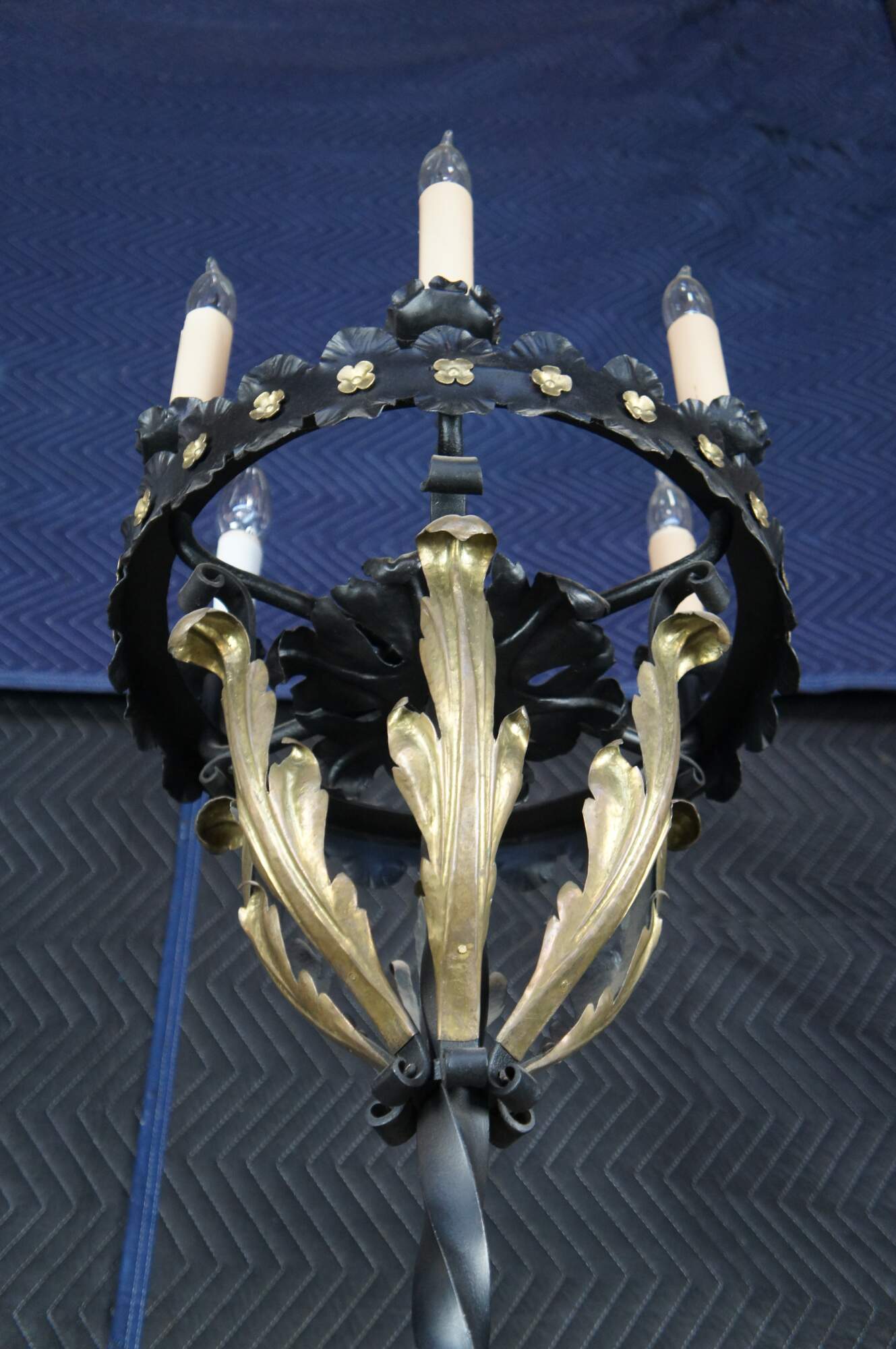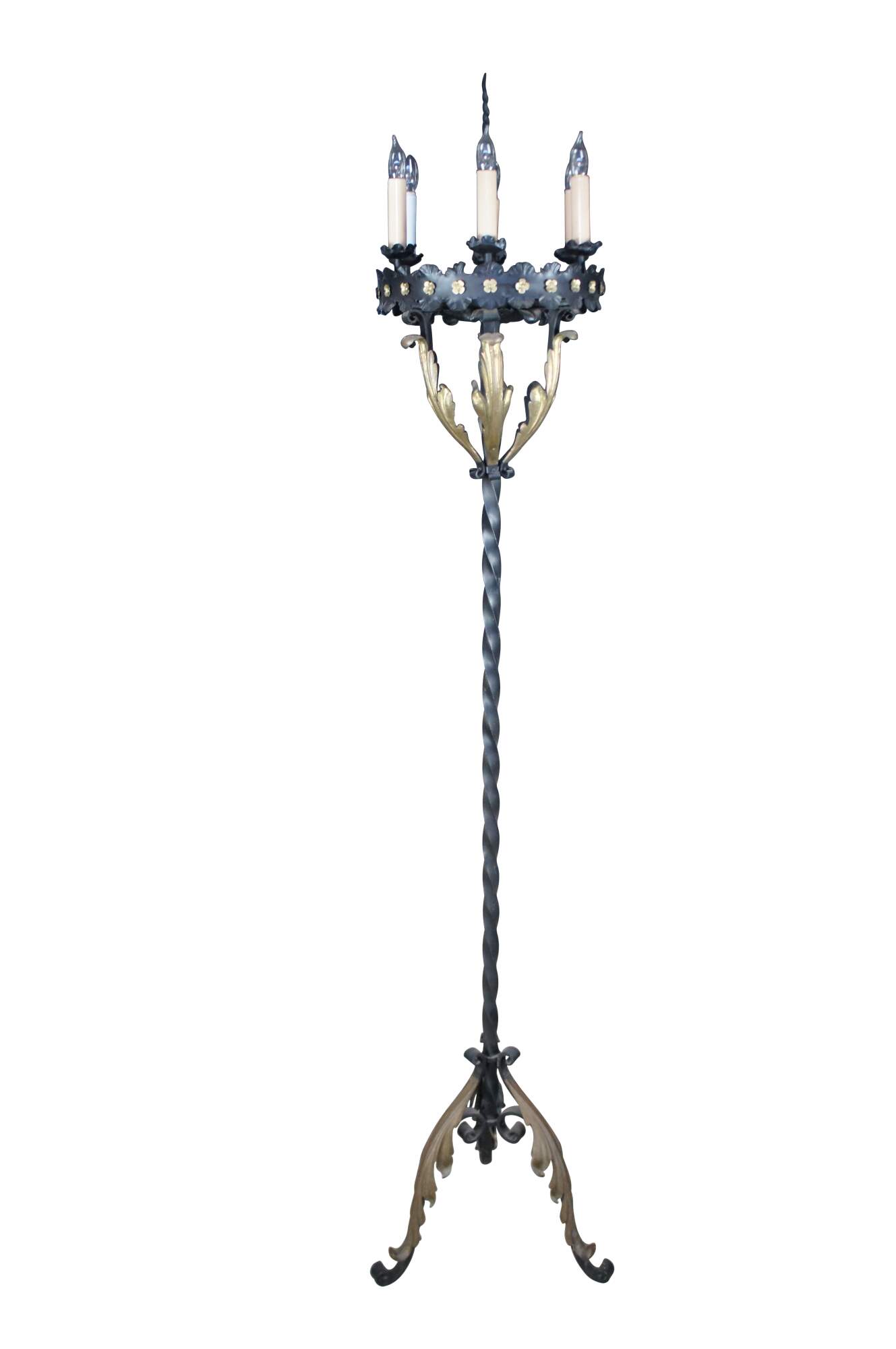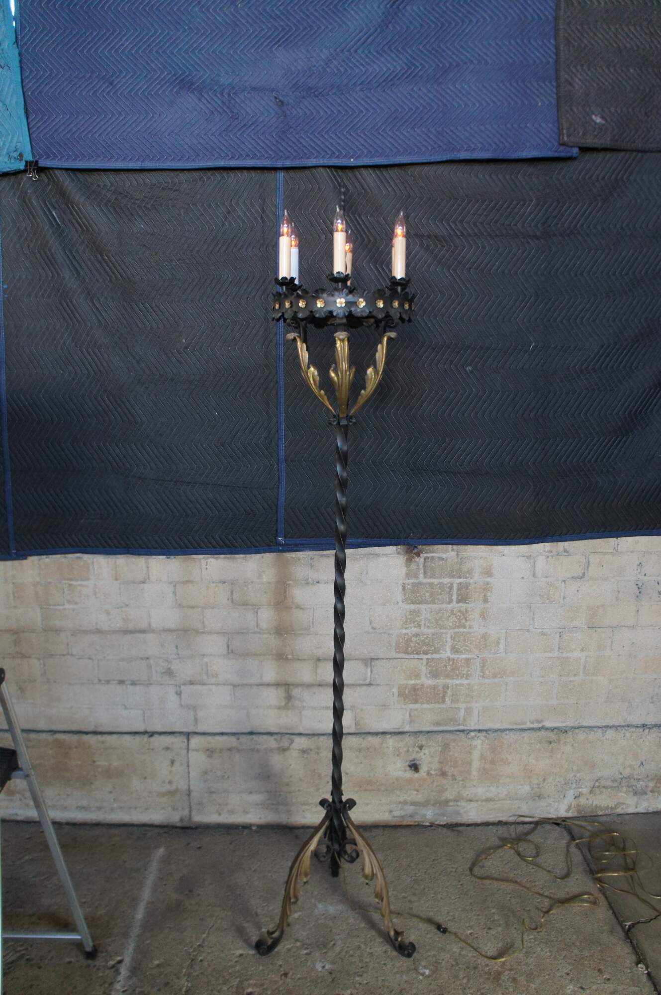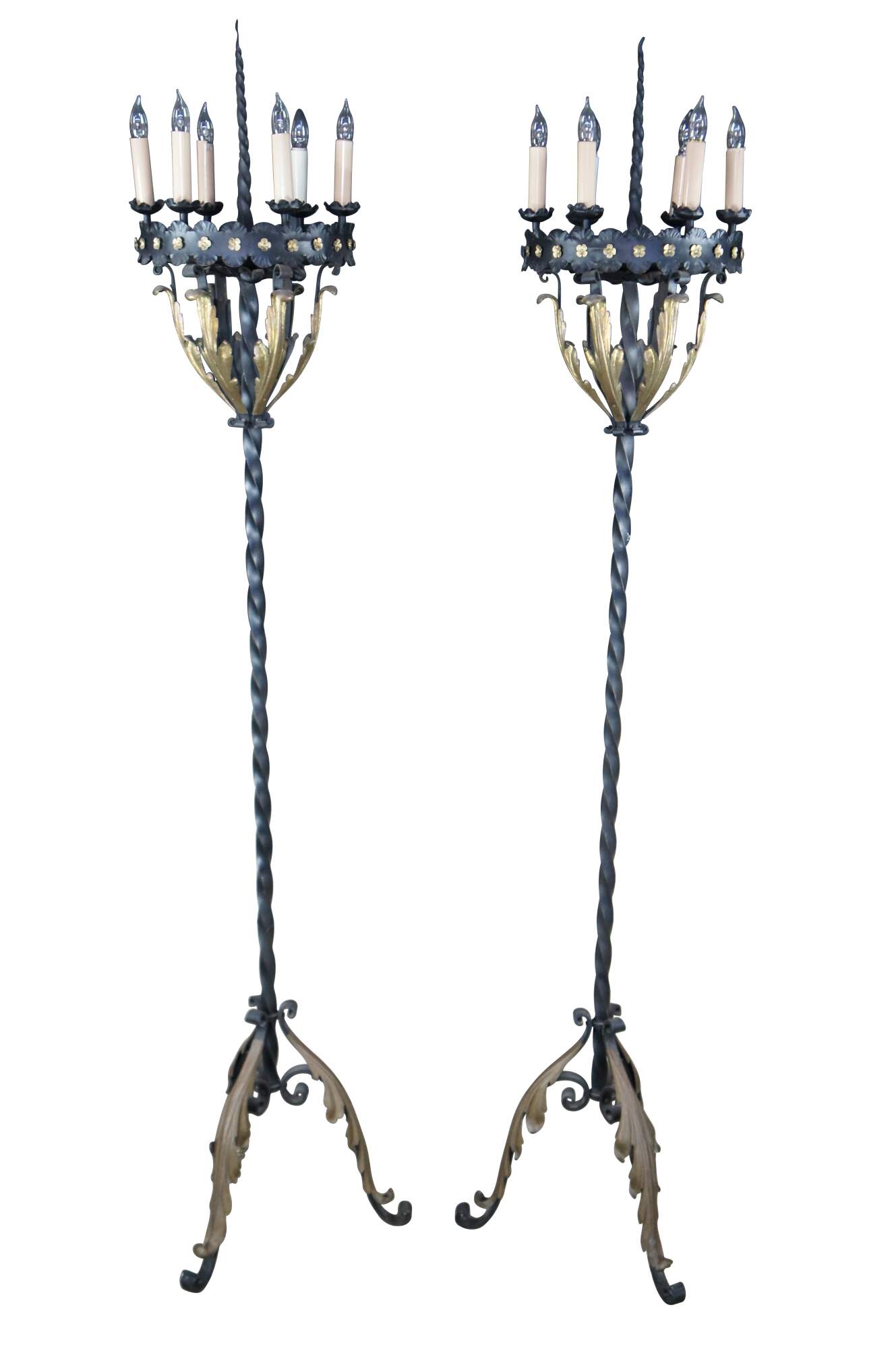 Early 20th Century pair of Spanish Revival palace sized torchiere candelabra floor lamps. Made from black twisted iron with gold acanthus trim and floret accents. Each lamp has six candlestick posts centered around a twisted iron spire. The lights are supported by scrolled tripod bases and turn on via a switch along the cord. Electric cords are very long allow for versatility in use. An exception set that will make a grande addition to any space.