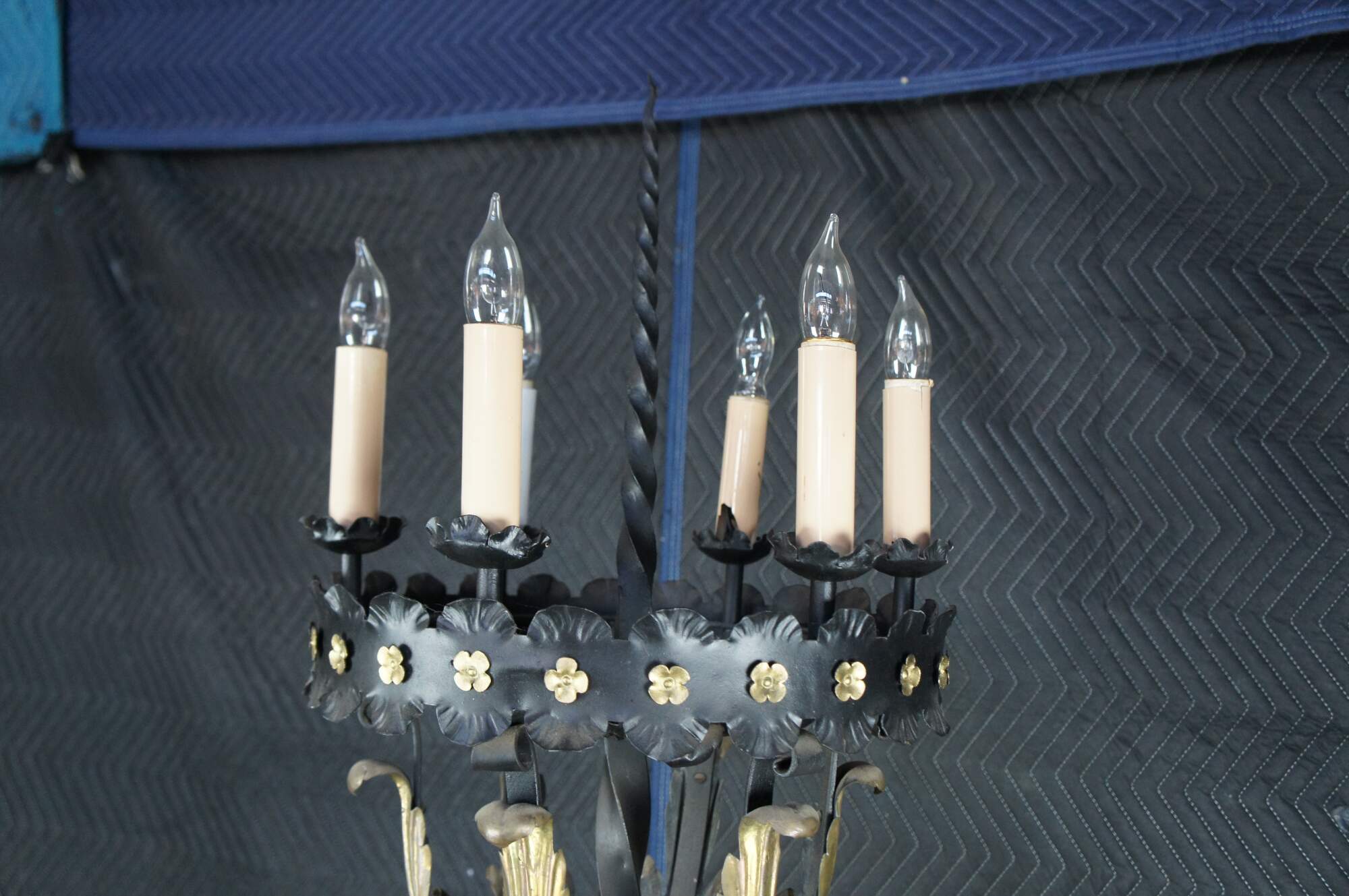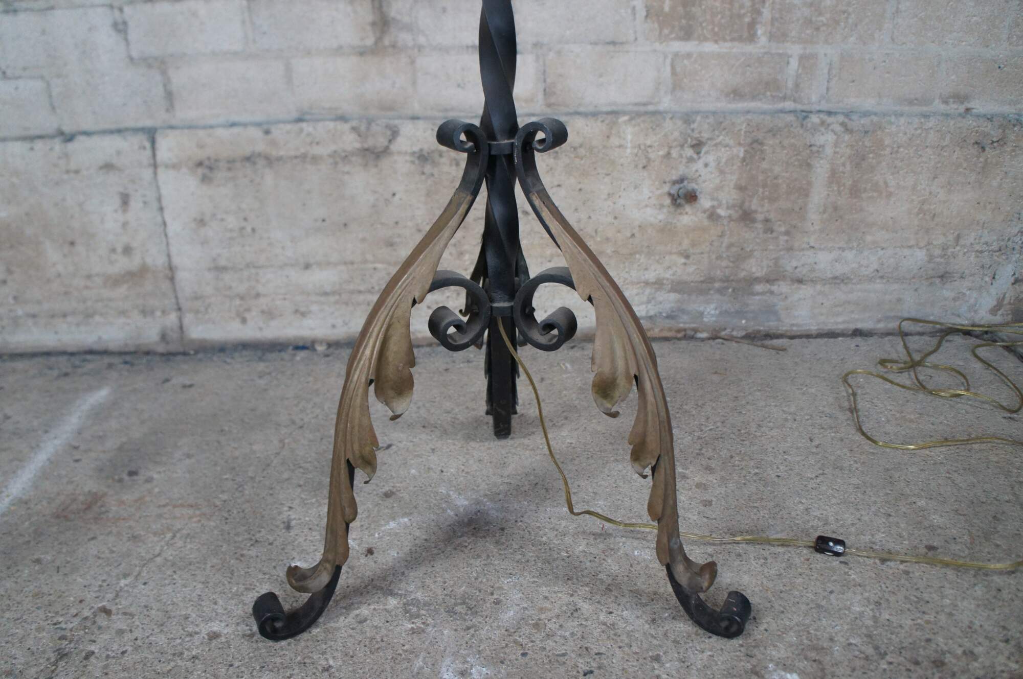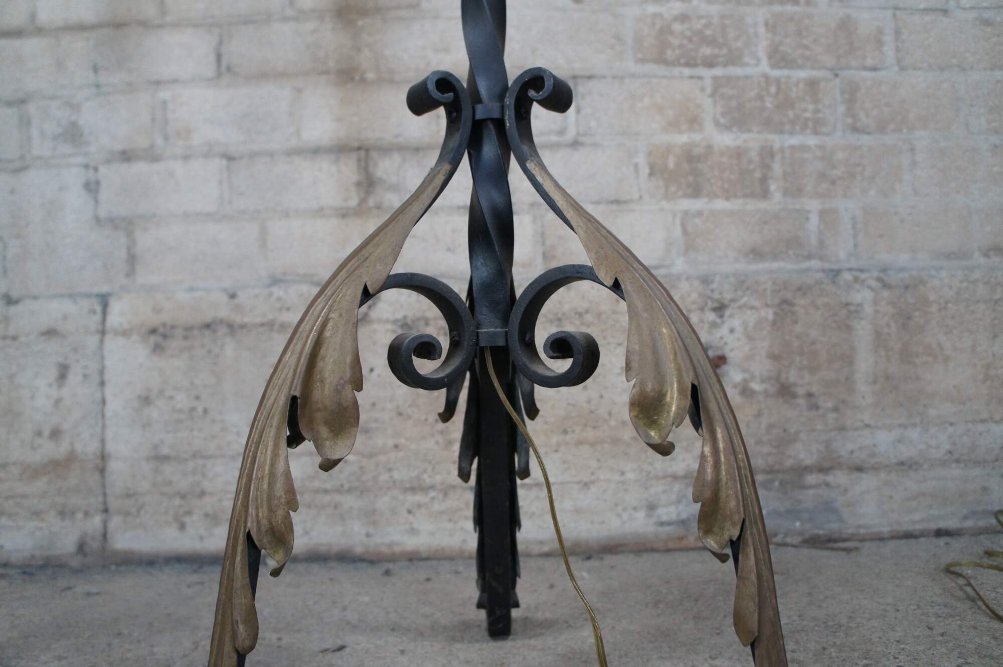 Early 20th Century pair of Spanish Revival palace sized torchiere candelabra floor lamps. Made from black twisted iron with gold acanthus trim and floret accents. Each lamp has six candlestick posts centered around a twisted iron spire. The lights are supported by scrolled tripod bases and turn on via a switch along the cord. Electric cords are very long allow for versatility in use. An exception set that will make a grande addition to any space.