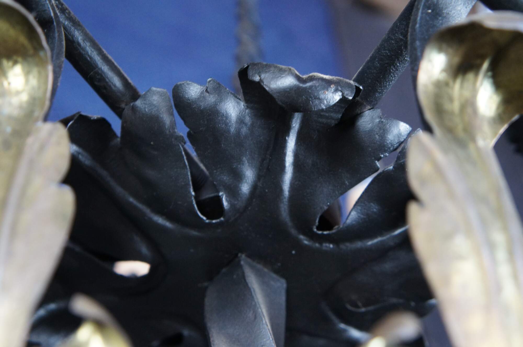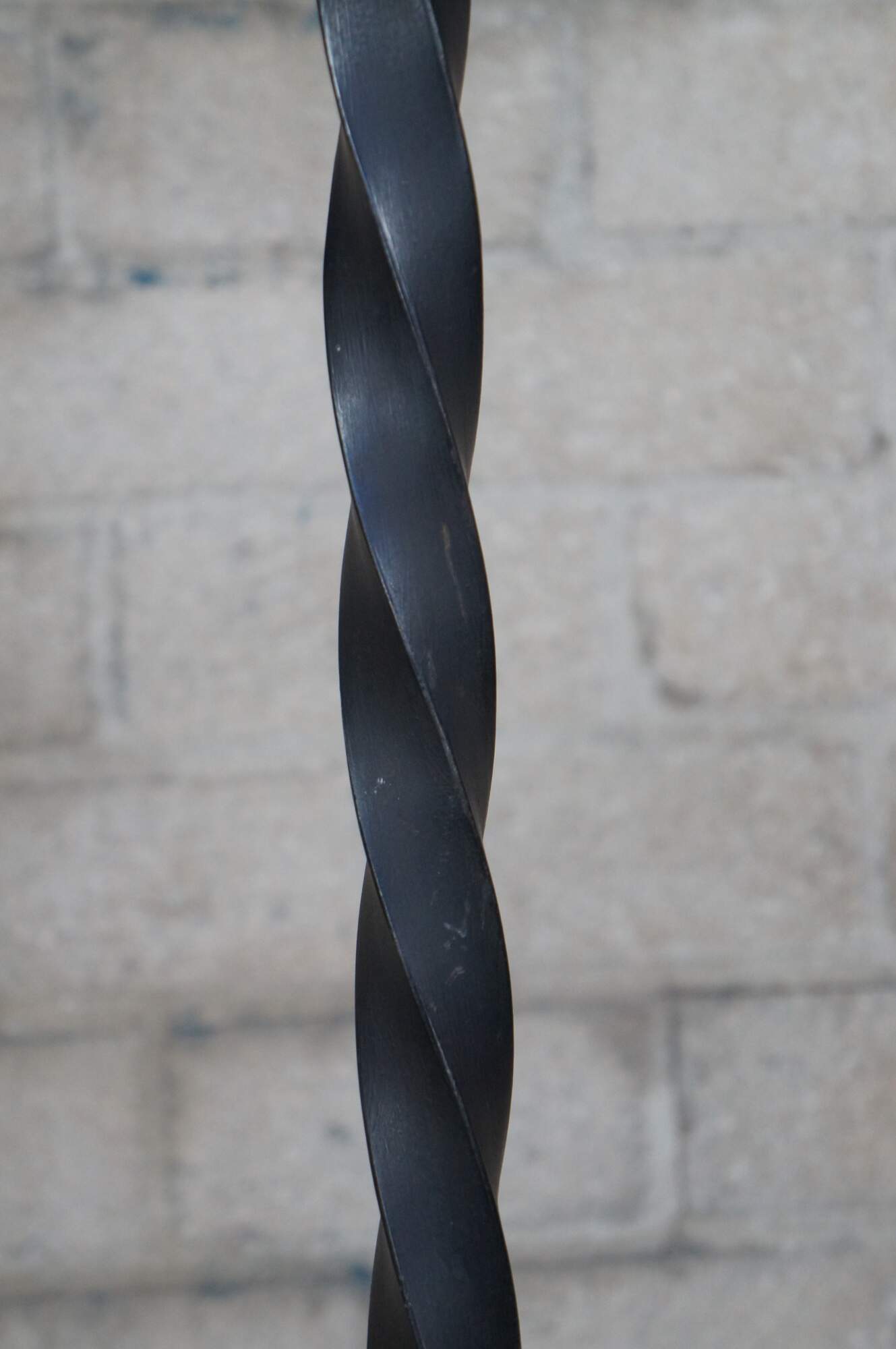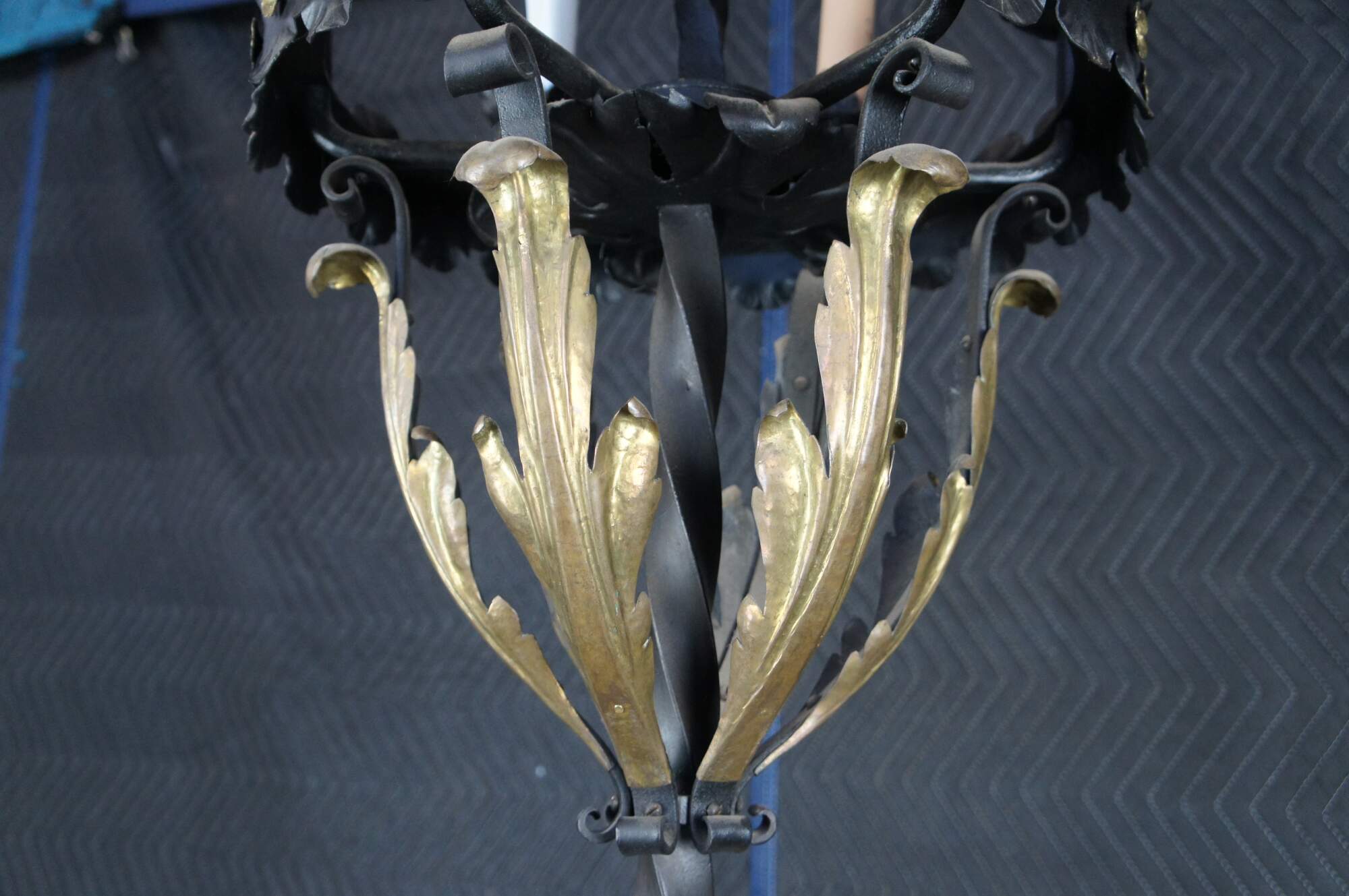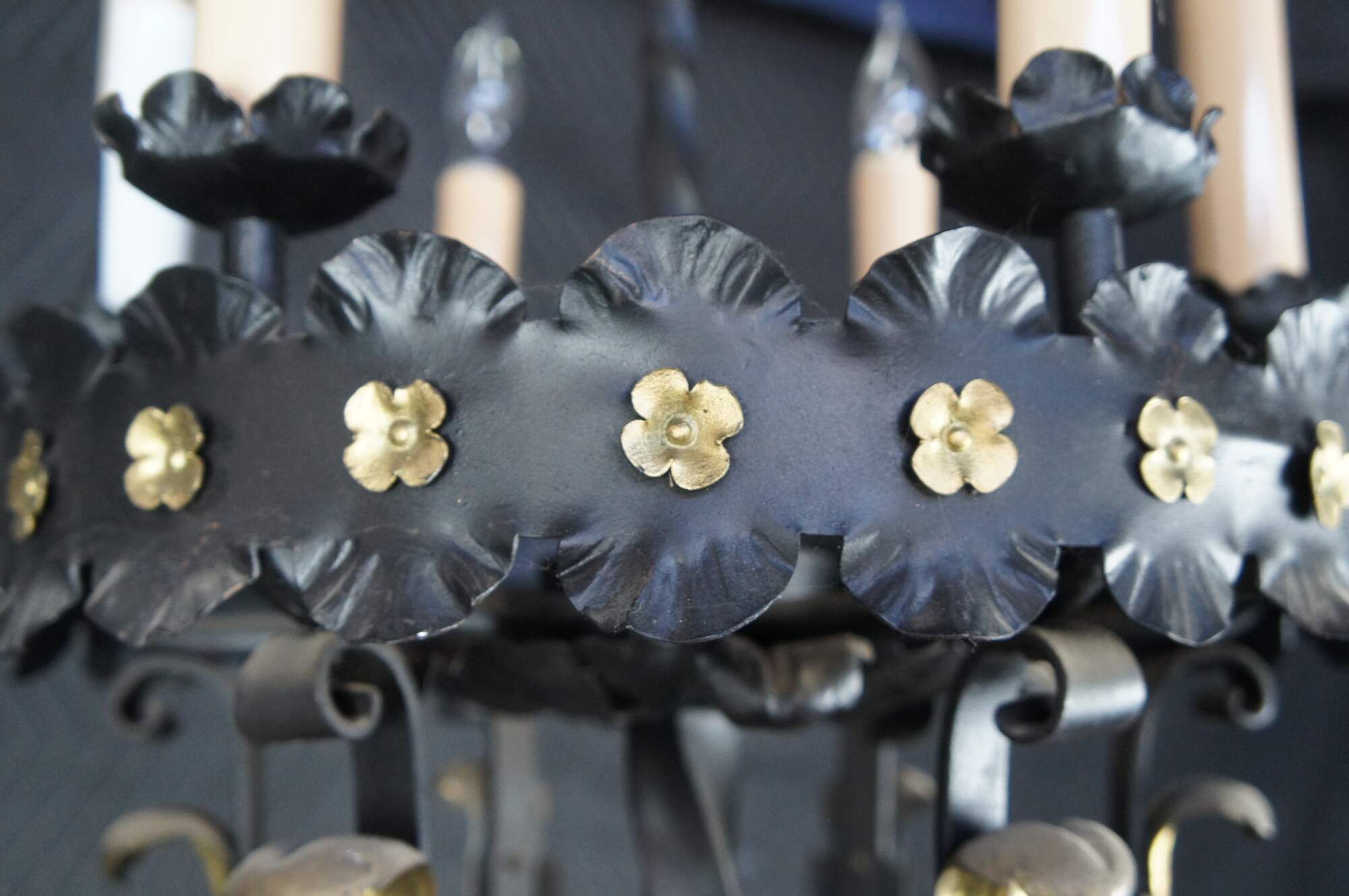 Early 20th Century pair of Spanish Revival palace sized torchiere candelabra floor lamps. Made from black twisted iron with gold acanthus trim and floret accents. Each lamp has six candlestick posts centered around a twisted iron spire. The lights are supported by scrolled tripod bases and turn on via a switch along the cord. Electric cords are very long allow for versatility in use. An exception set that will make a grande addition to any space.