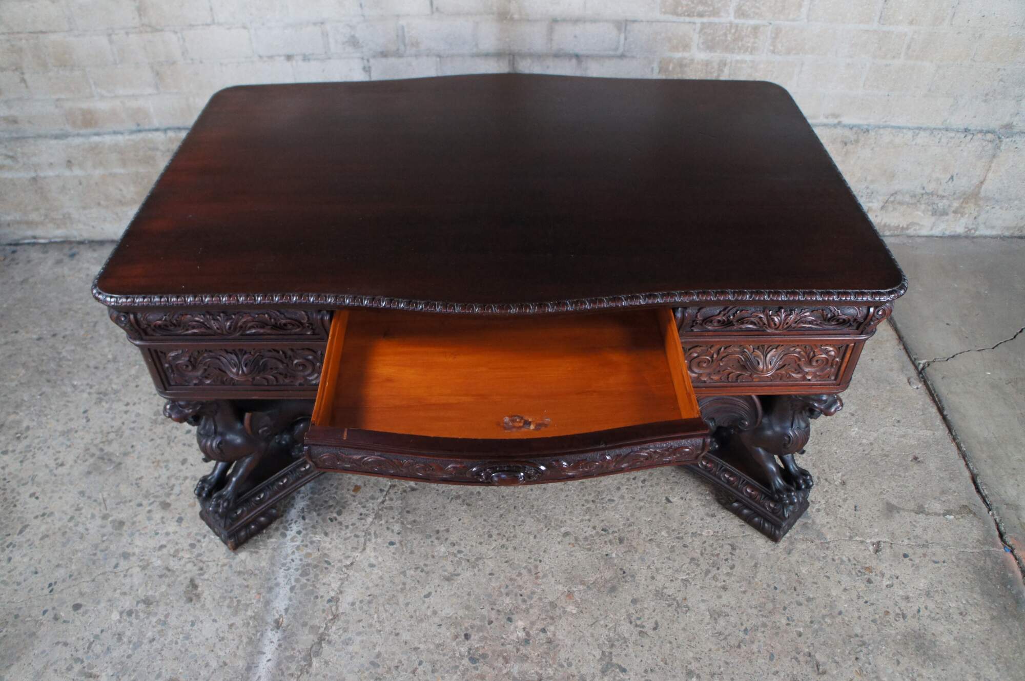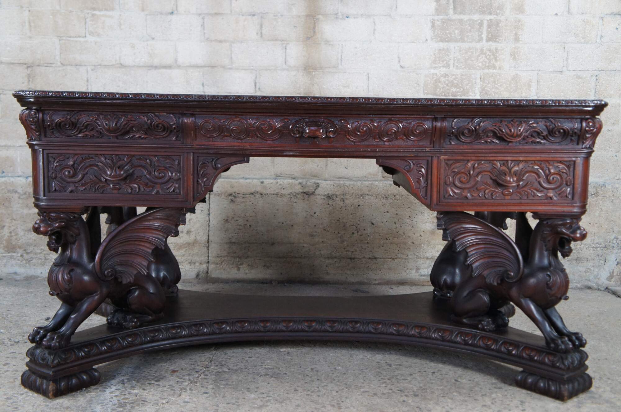 An exceptionally carved mahogany partners desk by R.J. Horner & Co, circa 1890s. Drawing inspiration from Victorian & Italian Baroque Styling. Features a serpentine form with carved table border surmounting a central frieze drawer flanked by two fitted right side drawers on each side that run the full depth of the desk, and faux drawers on each left side. Drawer surfaces, side and aprons are all perfectly carved with raised scrollwork, foliate, scalloped and acanthus detail. The desk is supported by the four corner iconic winged griffins on a shaped medial stretcher with egg and dart carved border over four square carved feet. The perfect statement for any library, study or office.