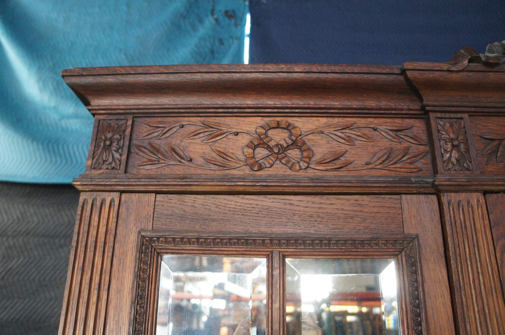 Exquisite antique 19th century French Louis XVI Knockdown Armoire. Made from solid oak / quartersawn oak with meticulous carving throughout. Features a three door mirrored front with large rectangular stepped center flanked by lattice design, all in beveled glass. The elegant front showcases fluted columns, French medallions and a neoclassical scene showcasing ribbons, torchieres, scrolling foliate and swag. Upper apron has ribbons flanked by an intertwined vine motif beneath a flowing serpentine pierced and carved ribbon and bow motif. This elaborate and large scale carving is rarely found in pieces from this period. The base opens to three hand dovetailed drawers for additional storage and the frame is supported by square tapered feet. Interior opens to mirrored doors and shelves along the outside. The large center is perfect for hanging garments. A remarkable cabinet that will make the perfect addition to any space.