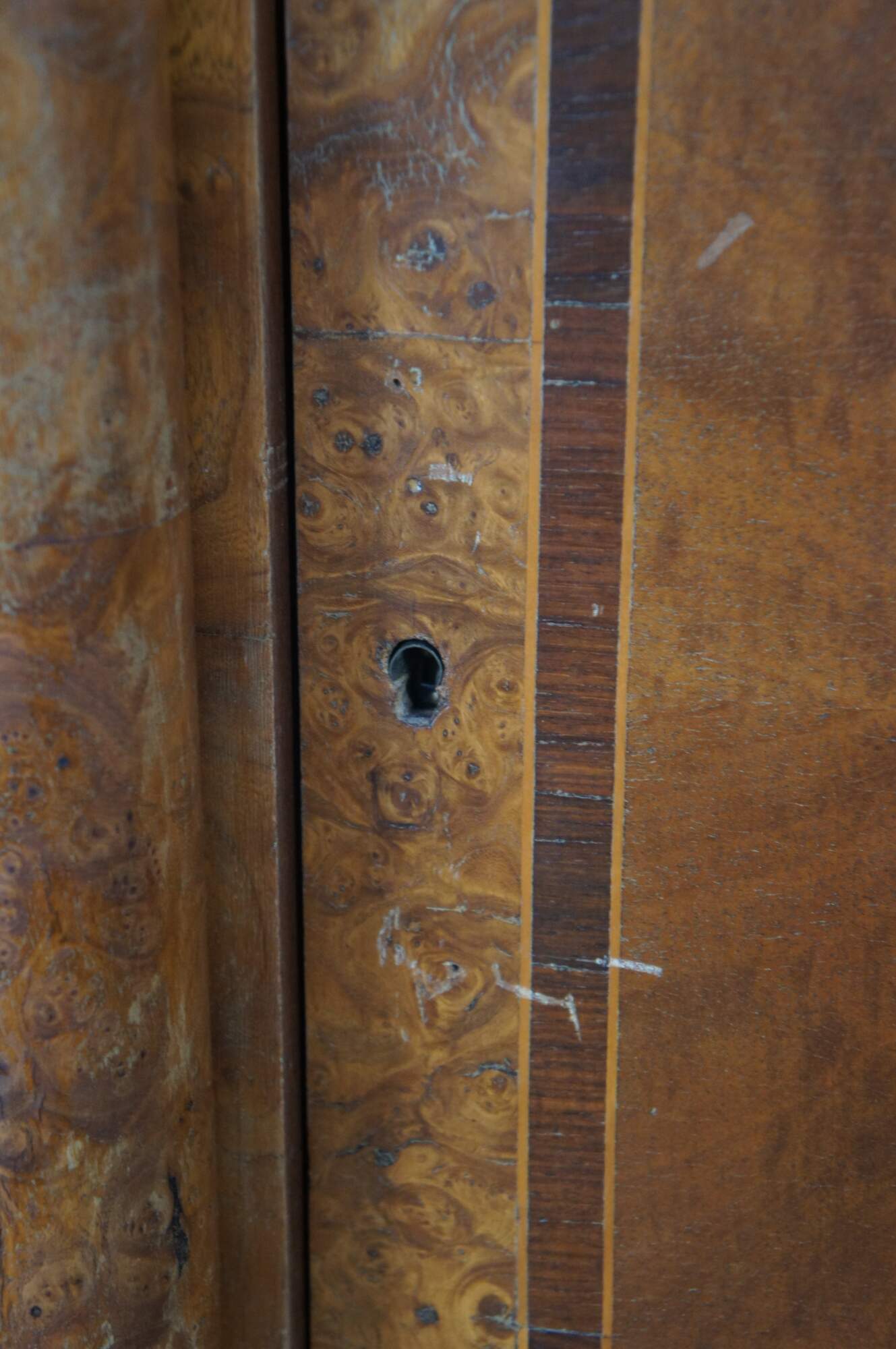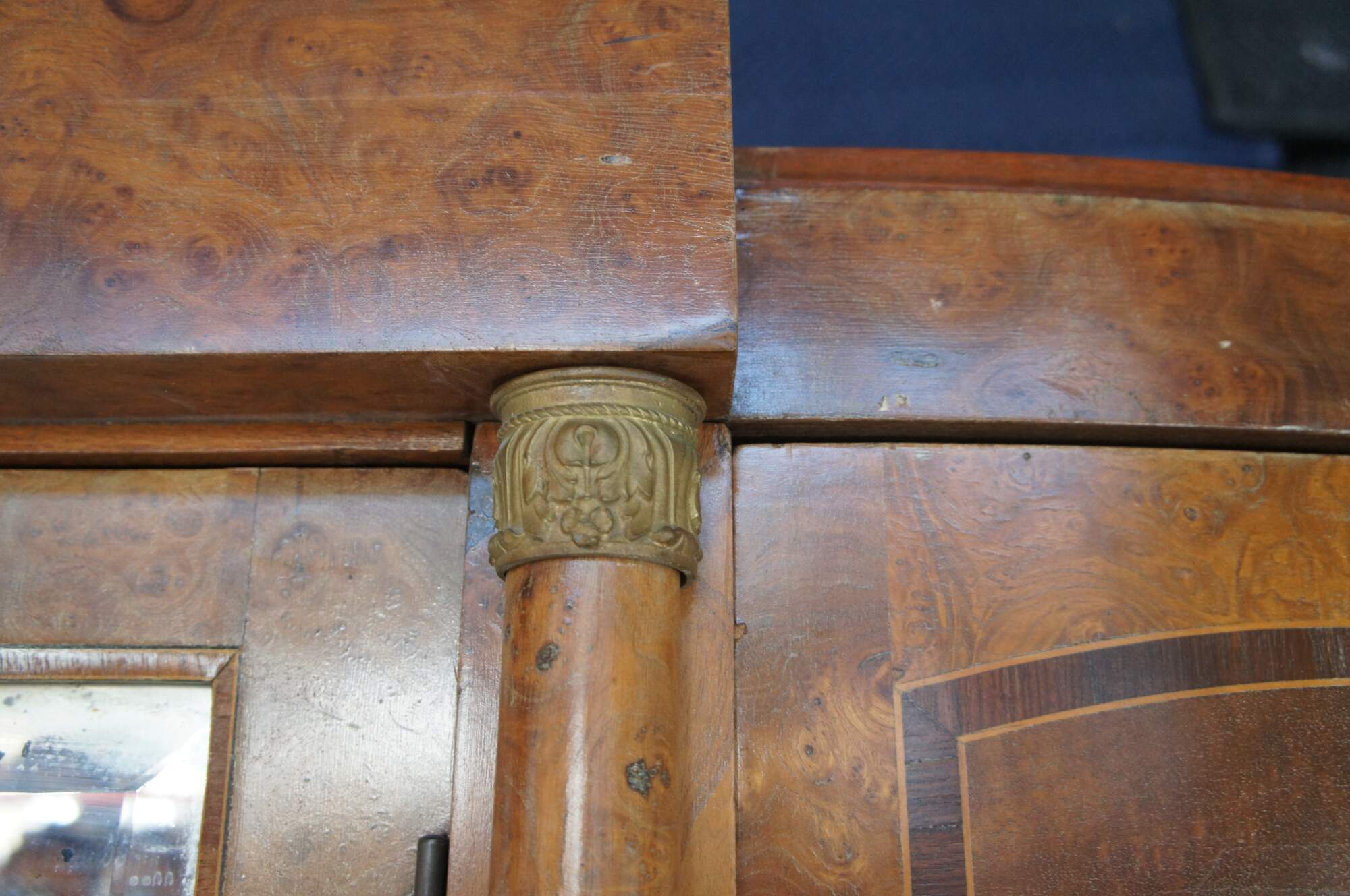 A beautiful Italian Neoclassical knockdown armoire or wardrobe from the last quarter of the 19th century. Rectangular in form with a bowfront accompanied by graceful ormolu capped columns along the front. Made from walnut and olive ash burl with banding and cameo inlay showcasing trophy urns with floral sprays. The cabinet opens to to sawtooth supports allowing for the use of shelving. The base is supported by bun feet. A charming addition to any bedroom or living space.