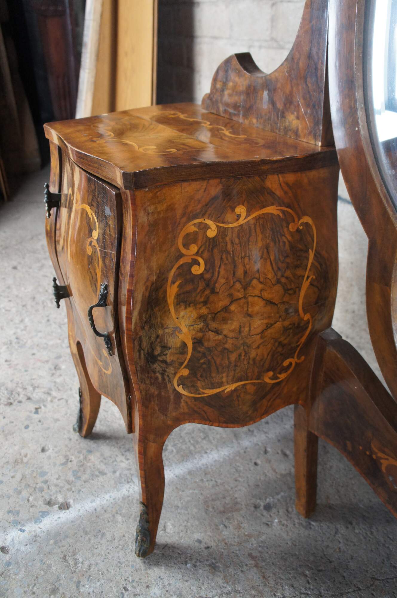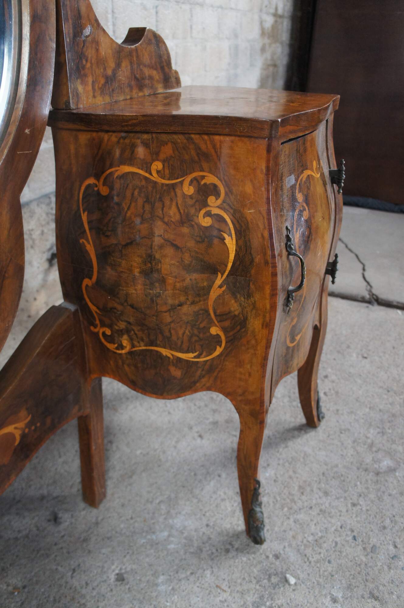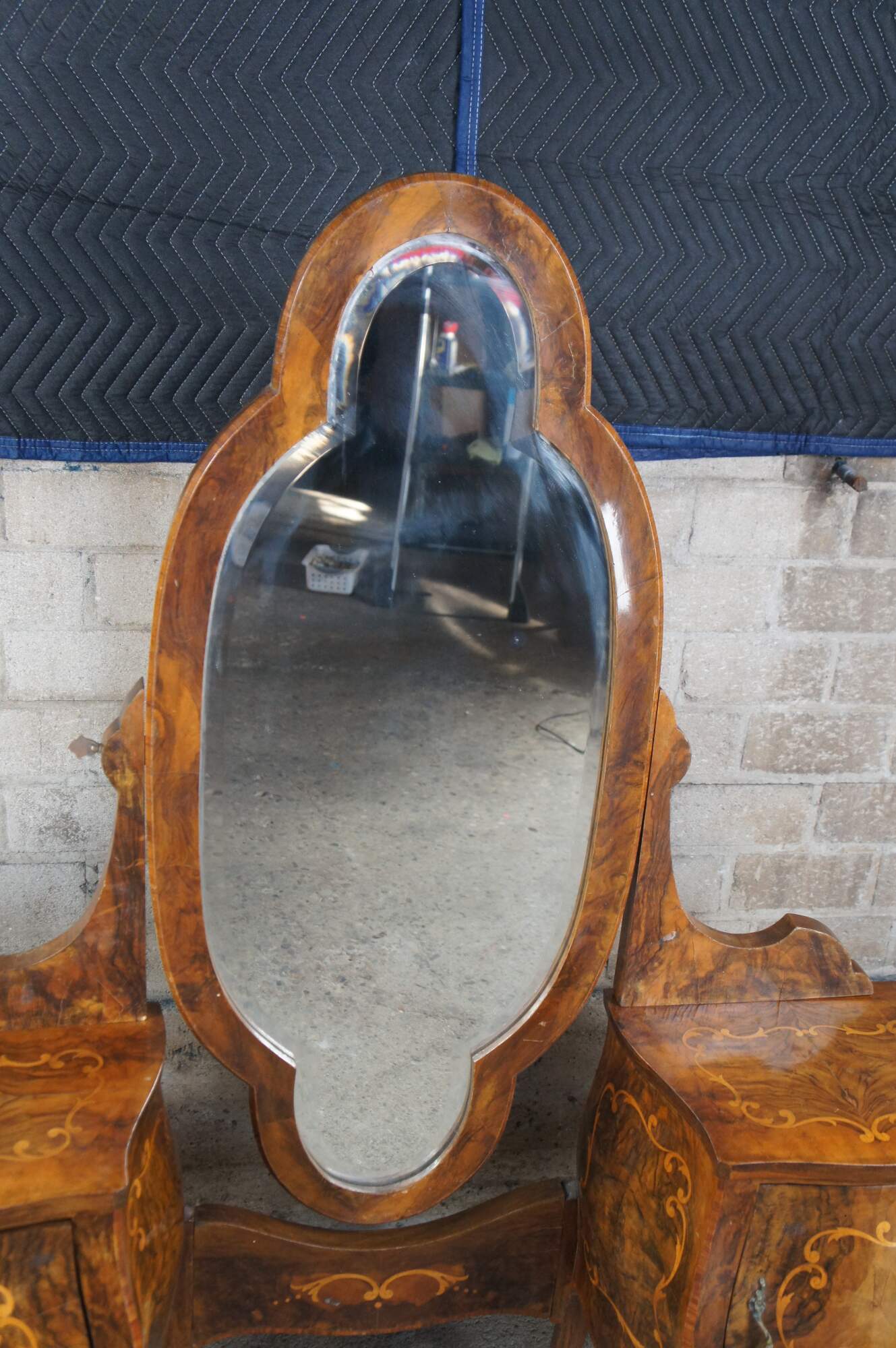 Rare and impressive Antique 19th century Italian Rococo bombe vanity or dressing table. Made of matchbook burled circassian walnut featuring serpentine form with a large central beveled mirror flanked by outer cabinet with marquetry inlay ornate ormolu and cabriole legs