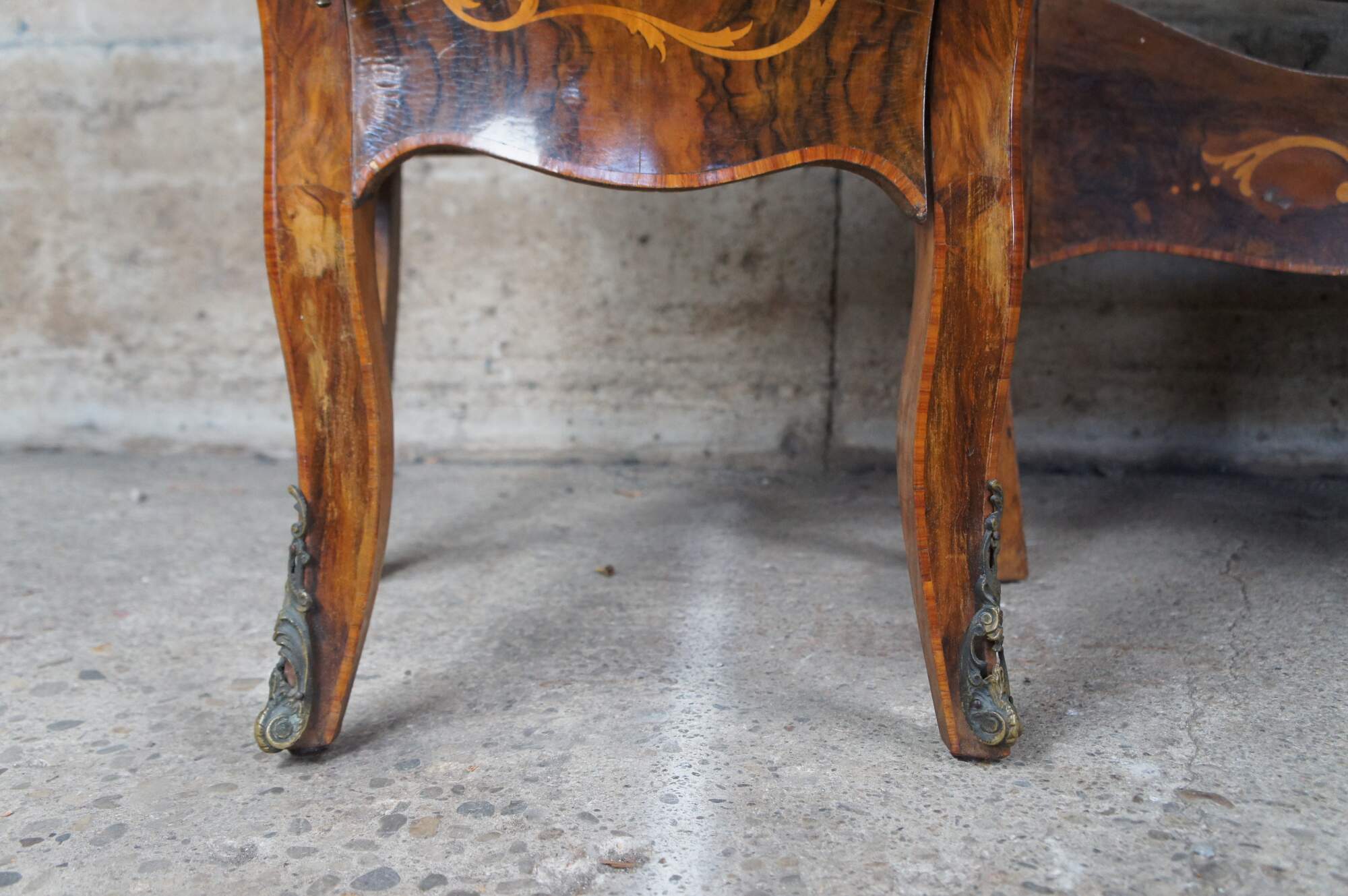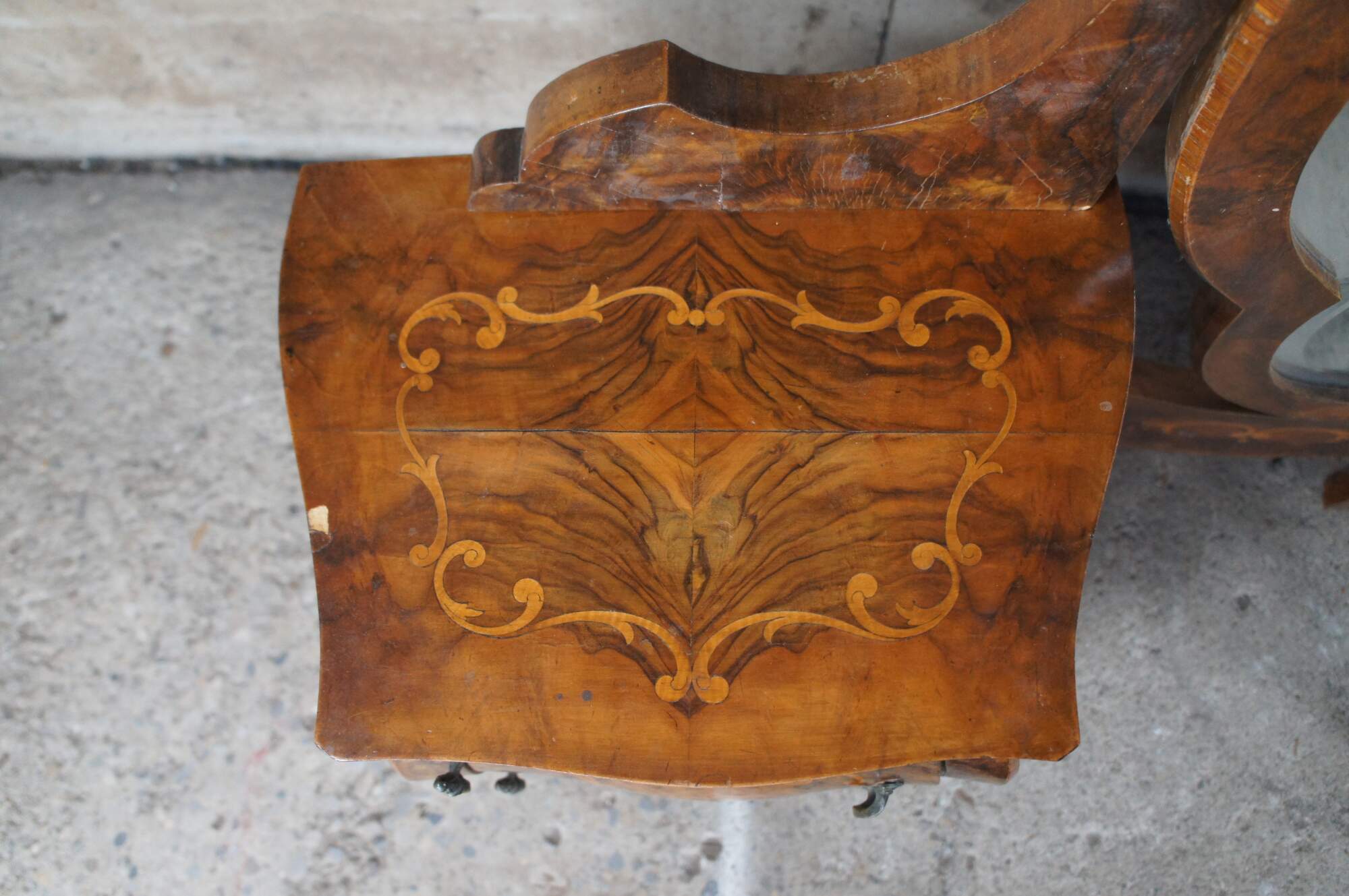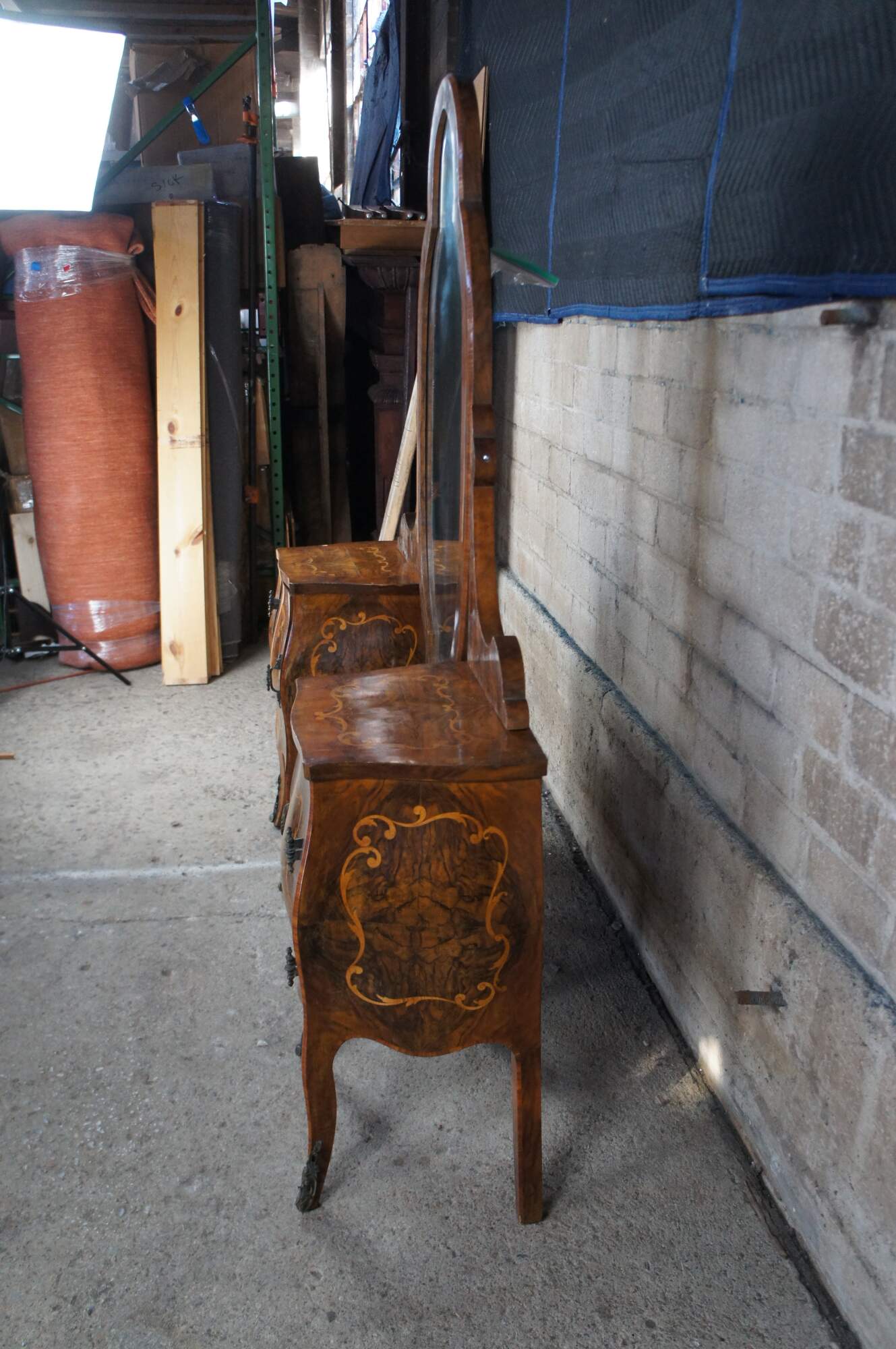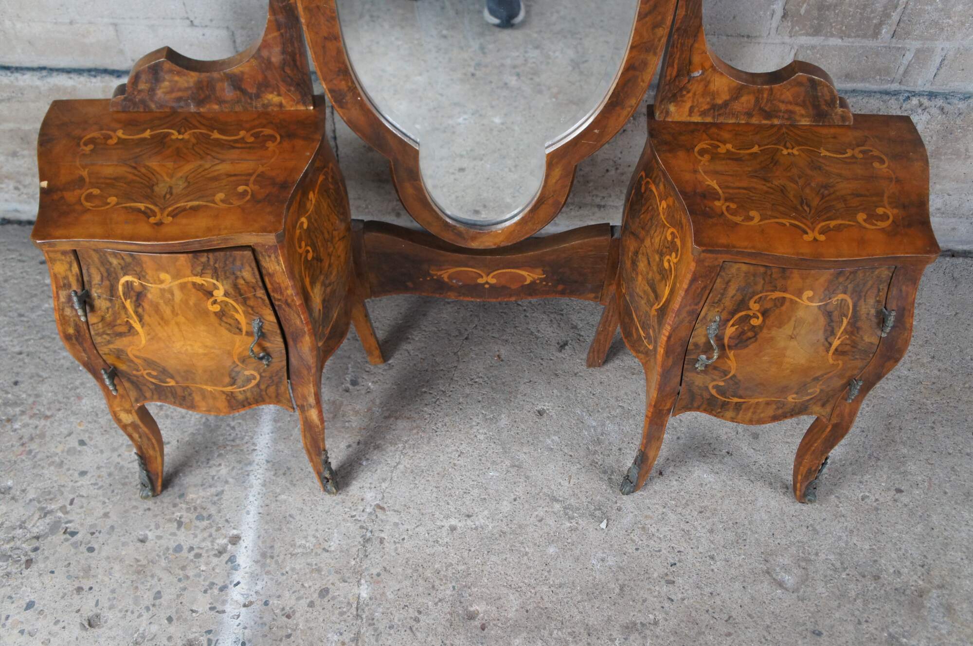 Rare and impressive Antique 19th century Italian Rococo bombe vanity or dressing table. Made of matchbook burled circassian walnut featuring serpentine form with a large central beveled mirror flanked by outer cabinet with marquetry inlay ornate ormolu and cabriole legs