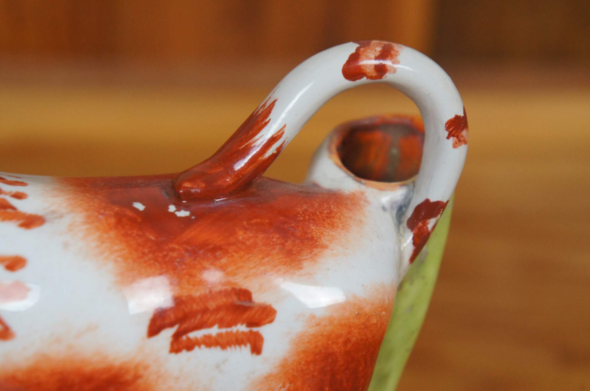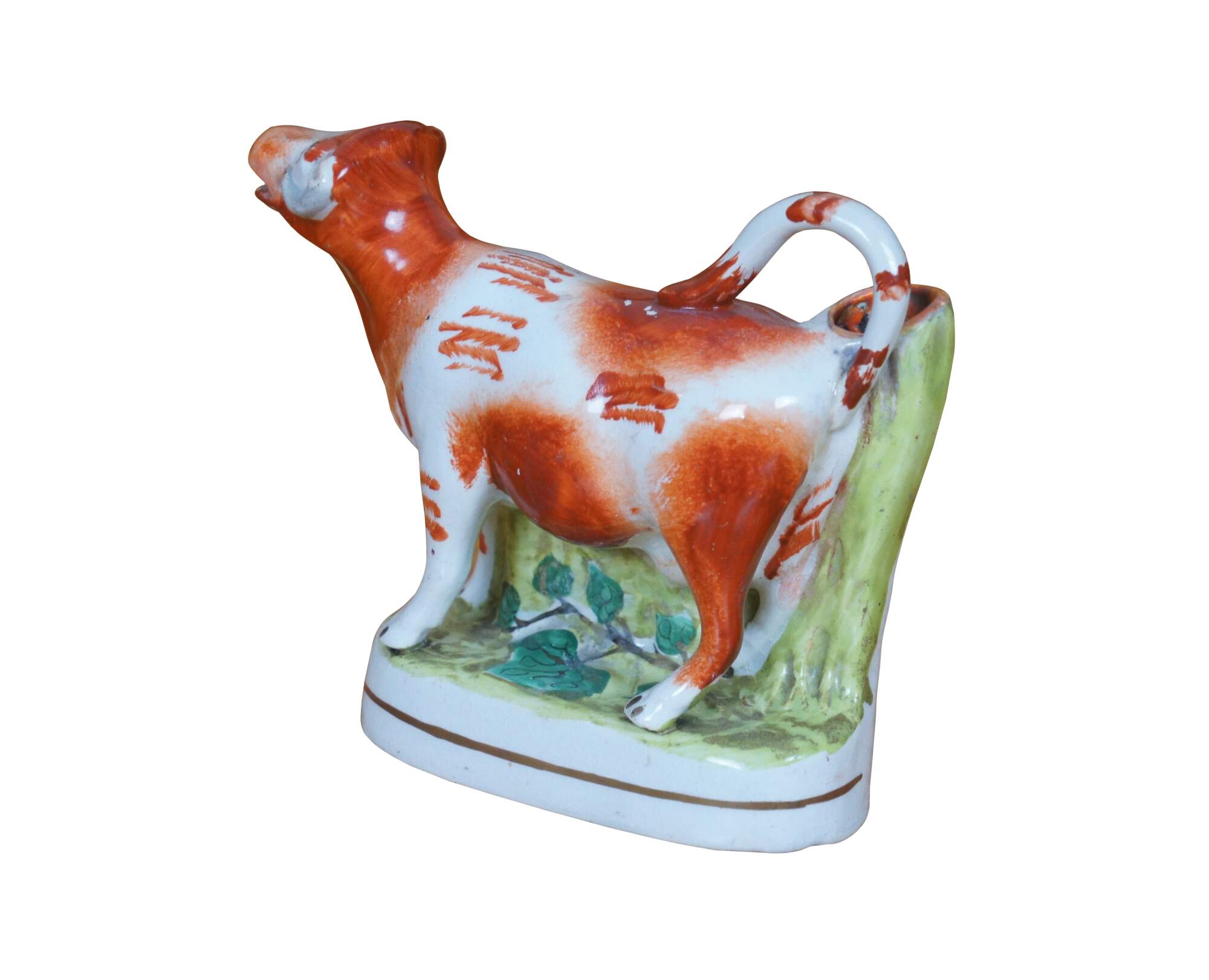 Antique 19th century Staffordshire porcelain flatback figural cream pitcher / bud vase in the shape of a red and white cow next to a tree stump, on a grassy oval base. Base painted with grass and English ivy. Tail curls to form handle.