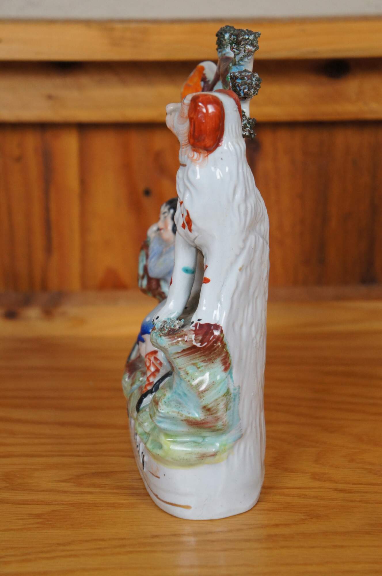 Antique 19th century Staffordshire porcelain flatback figurine titled "Dog Tray," depicting a young girl sleeping at the foot of a tree with her hoop and stick, guarded by an attentive red and white King Charles spaniel. Tray refers to the name of a faithful dog featured in the poem "The Harper," written in 1836 by Thomas Campbell.