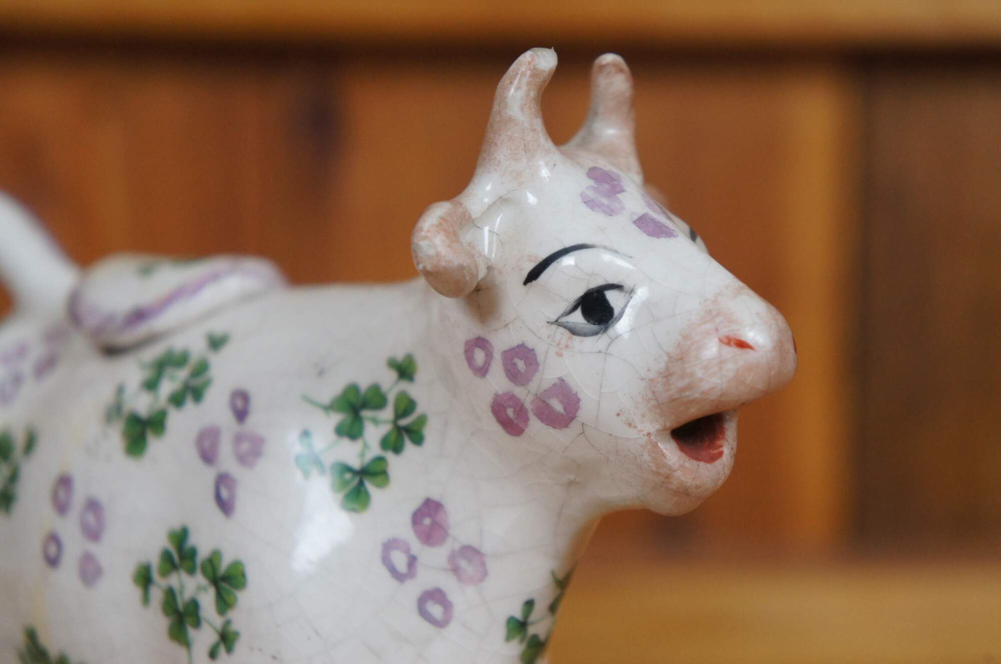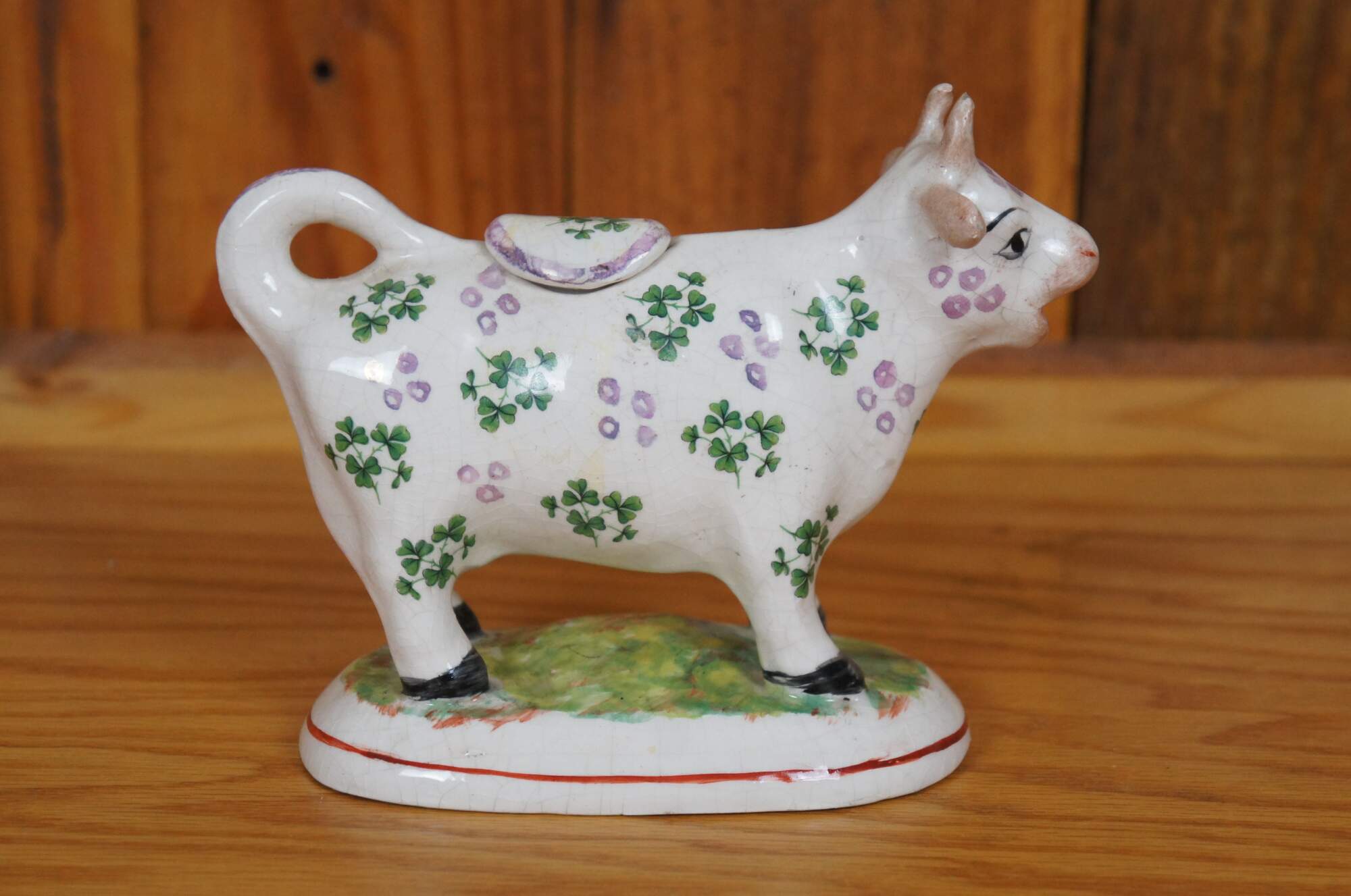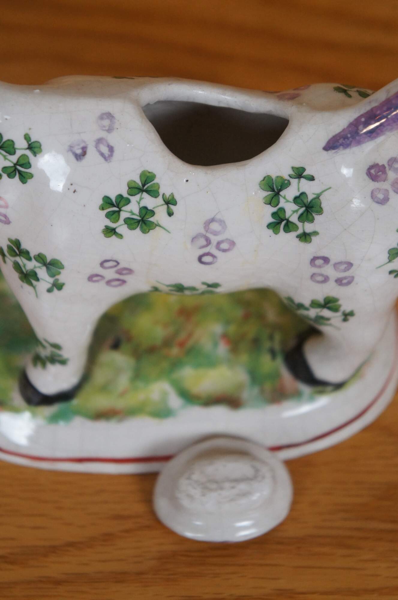 Rare antique 19th century Staffordshire porcelain cream pitcher in the shape of a white cow with iridescent lavender / light purple spots, painted with clusters of shamrocks / three leaf clovers, standing on a grassy oval base. Tail curls to form handle. Includes stopper.