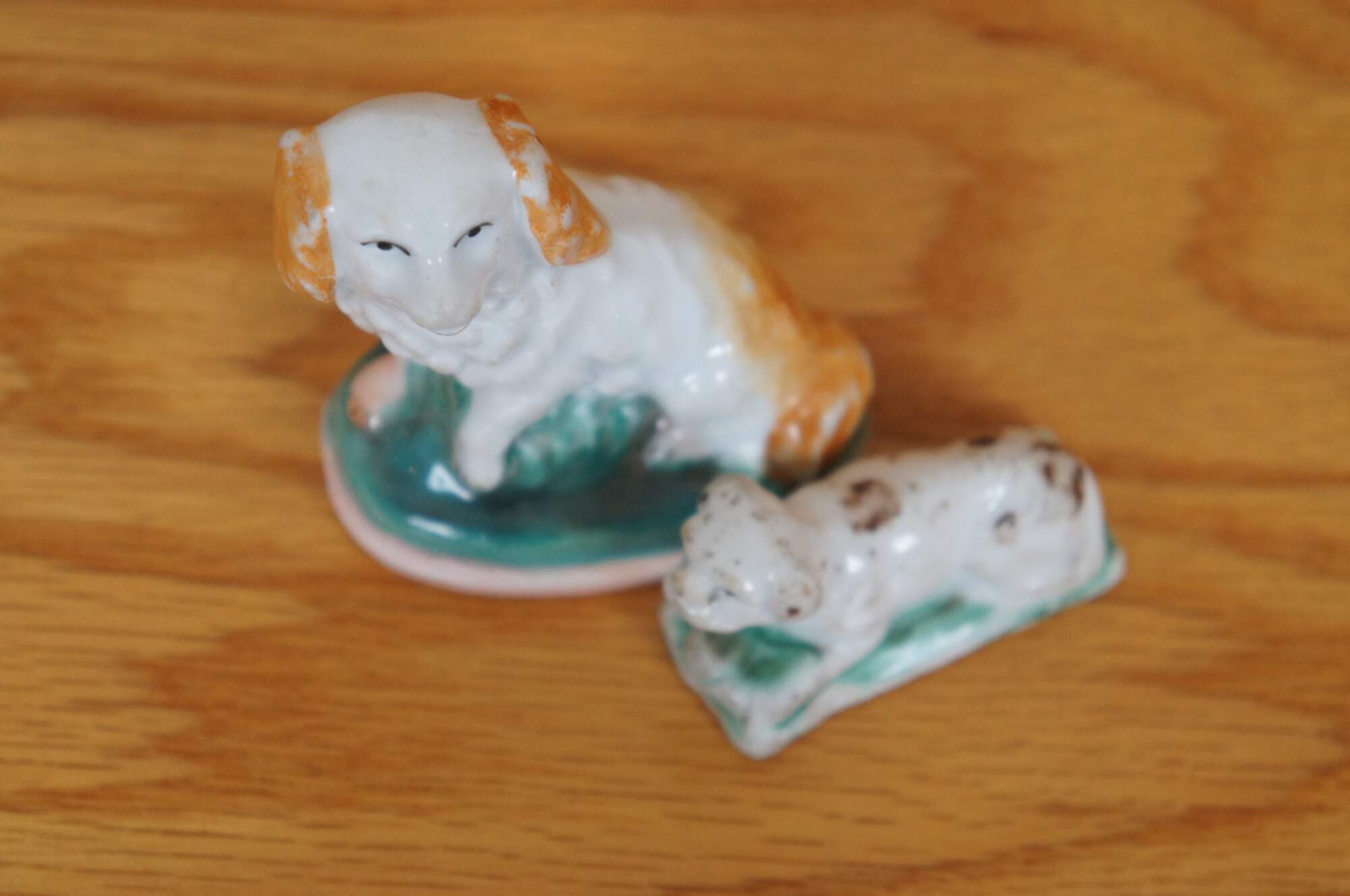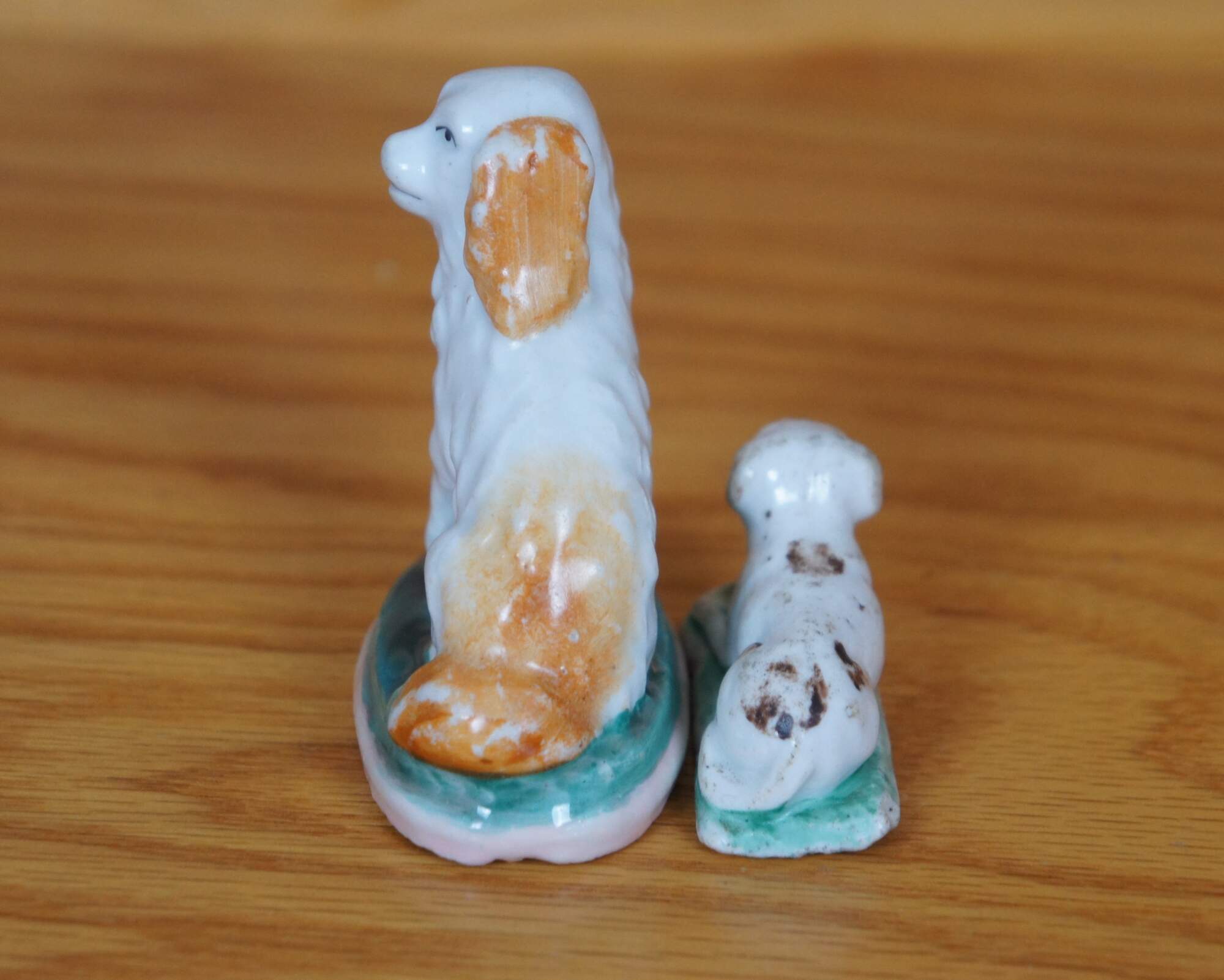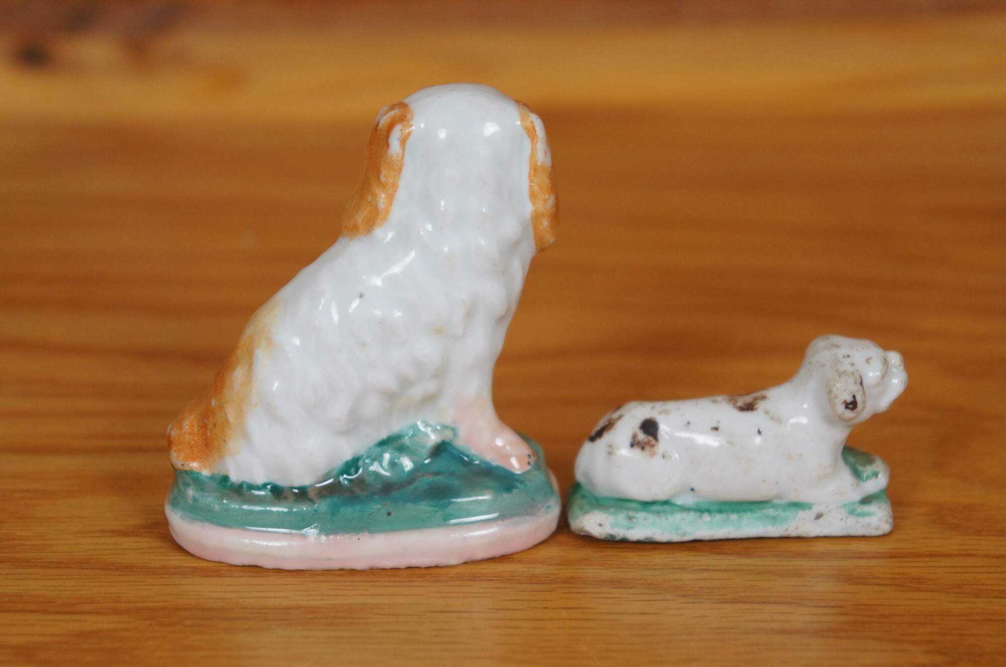 Pair of antique Staffordshire porcelain minature figurines in the shape of dogs - a seated red and white King Charles spaniel on a grassy base, and a reclining bulldog with brown spots.