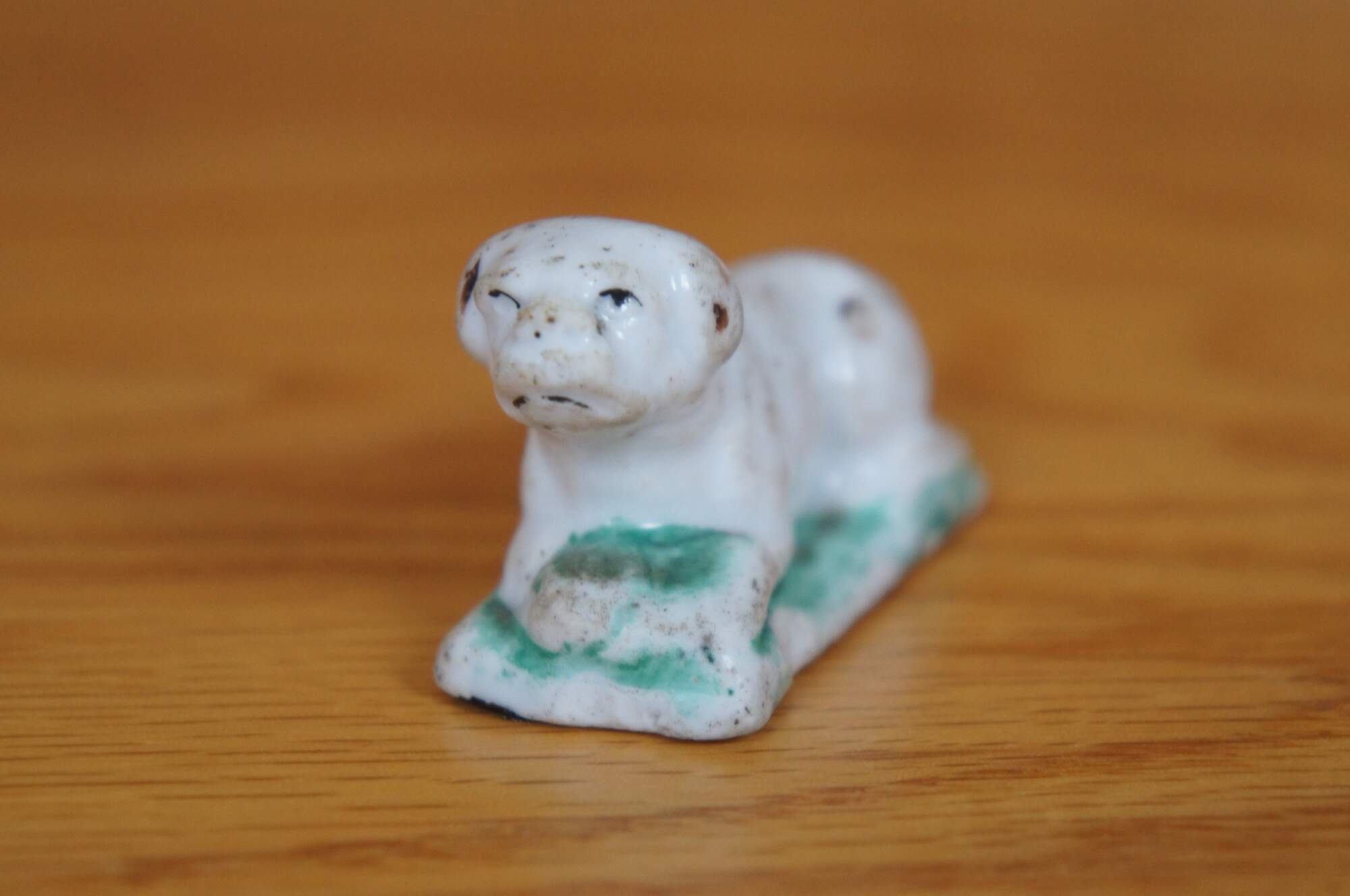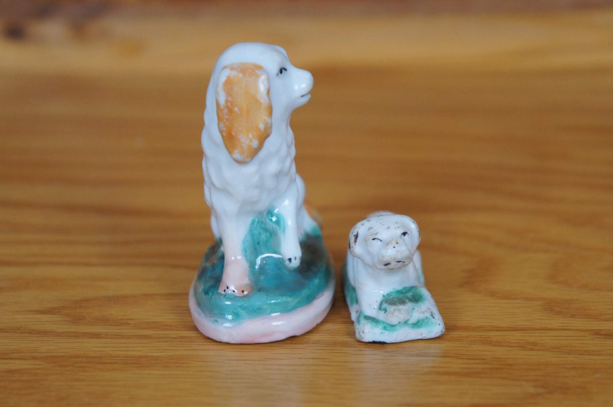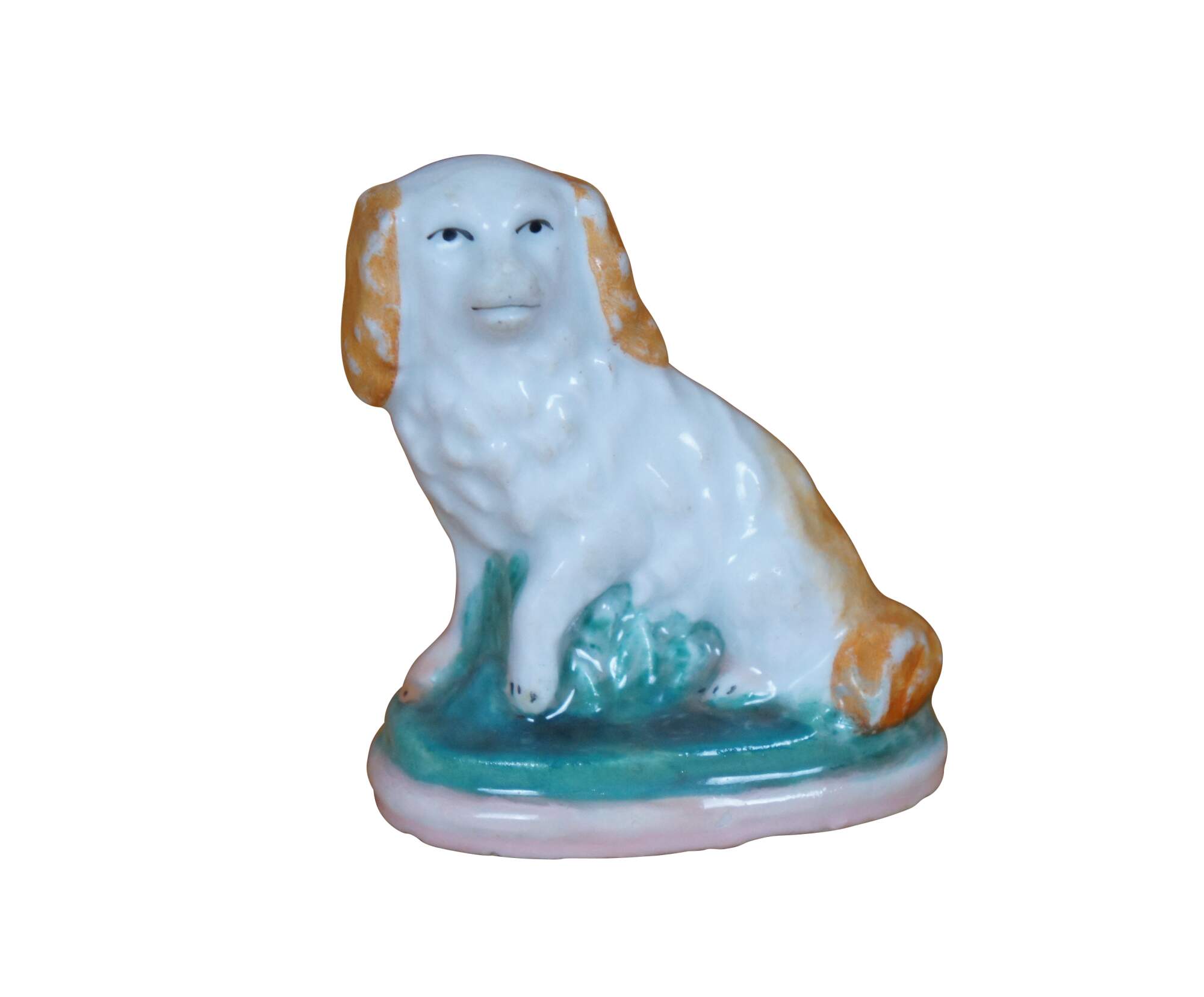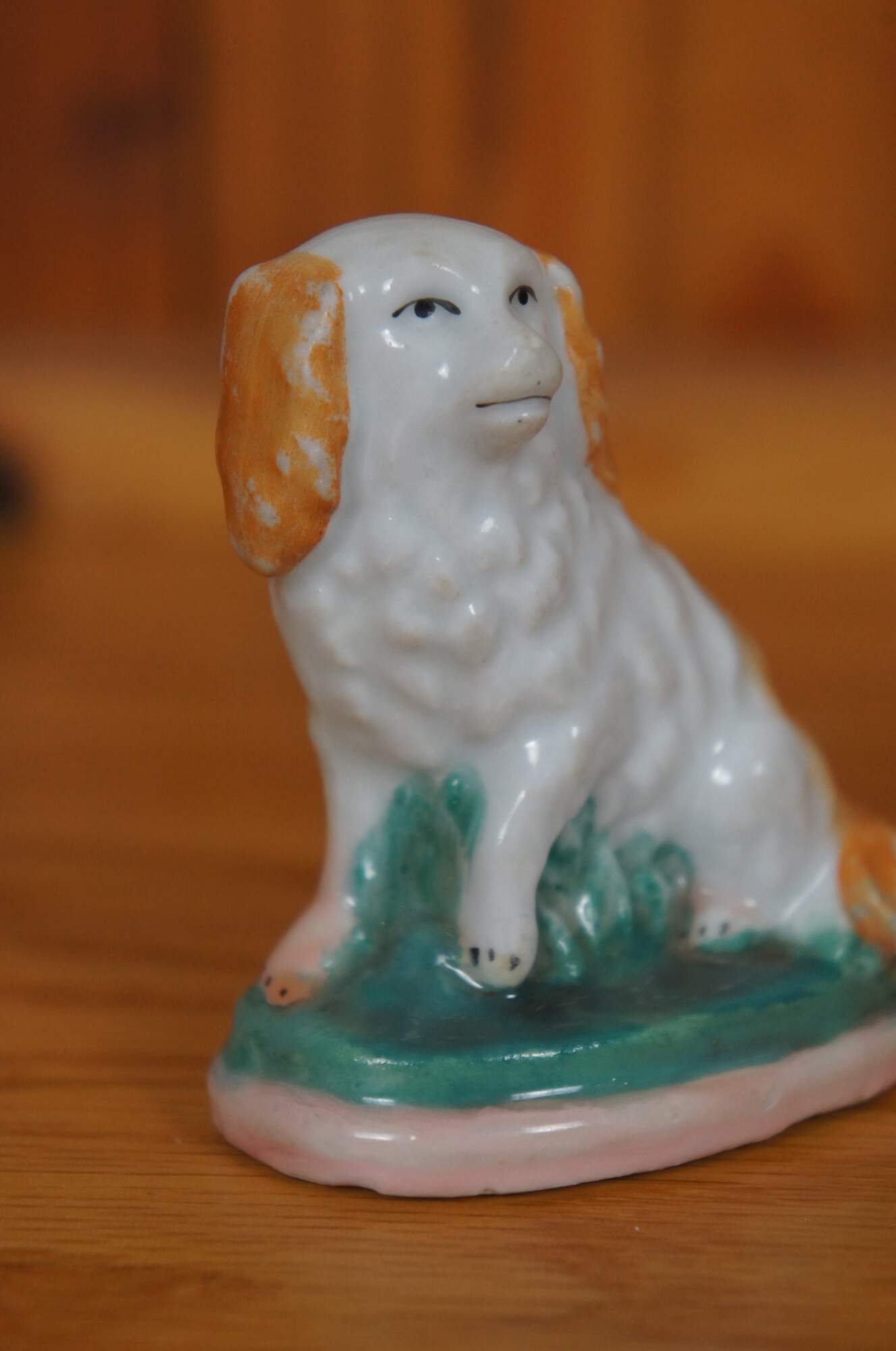Pair of antique Staffordshire porcelain minature figurines in the shape of dogs - a seated red and white King Charles spaniel on a grassy base, and a reclining bulldog with brown spots.