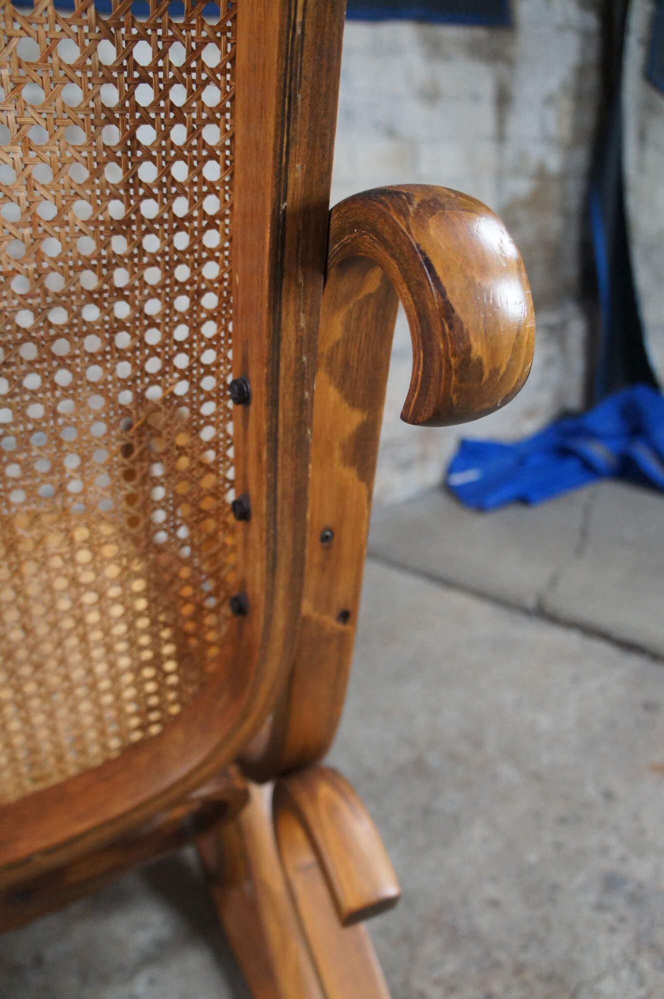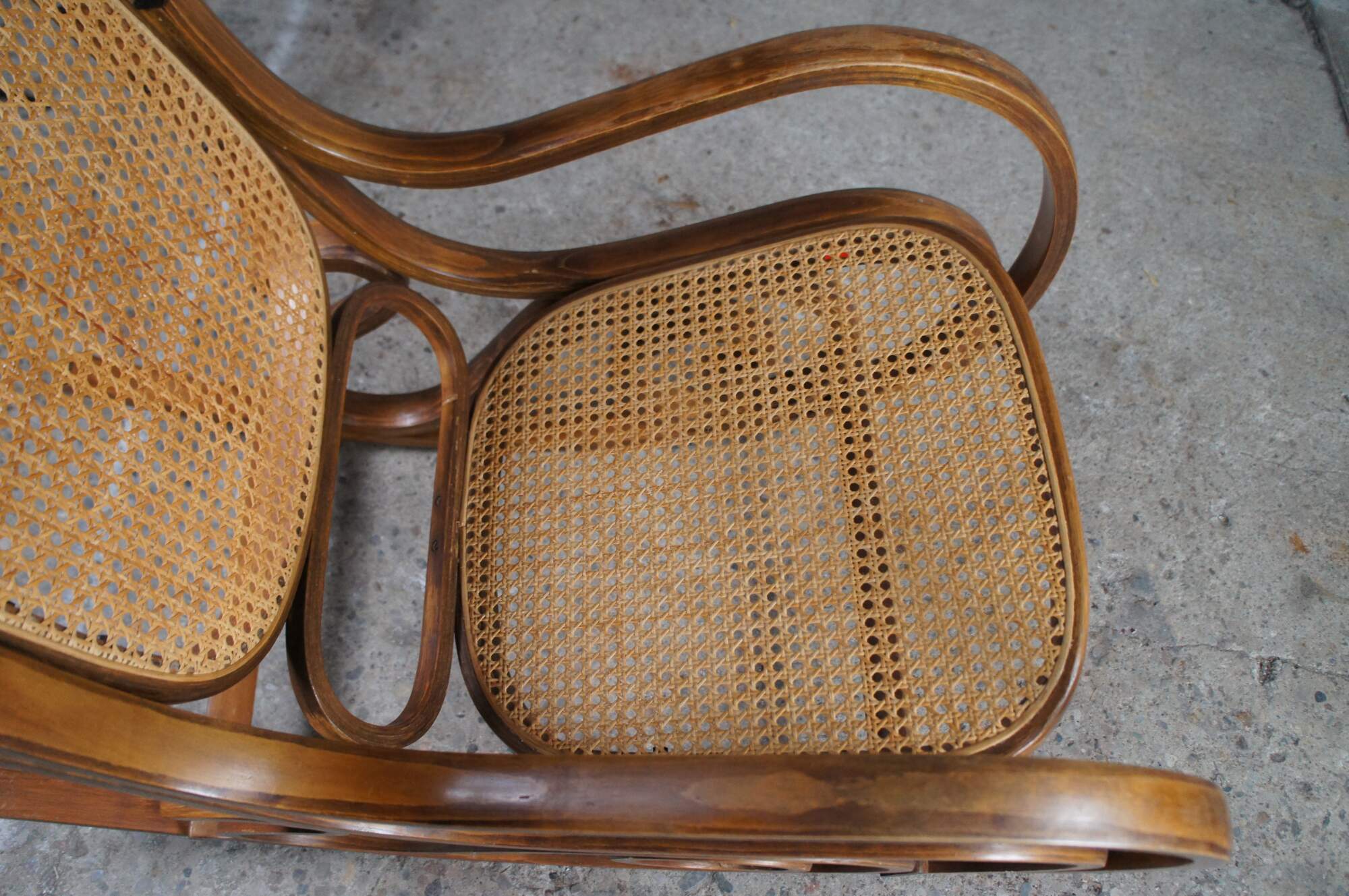 Thonet style Bauhaus rocking chair, circa mid 20th century. Made from walnut in classic bentwood styling with rattan back and seat.