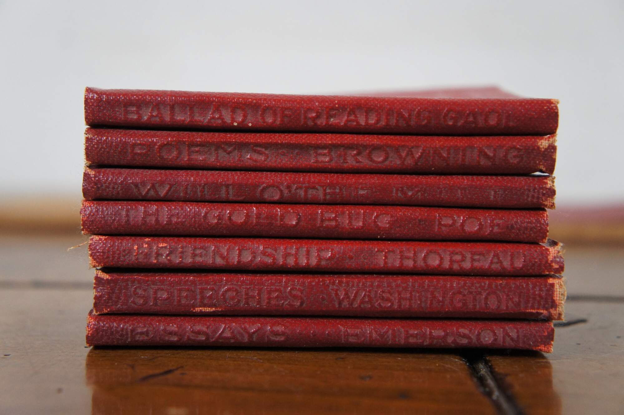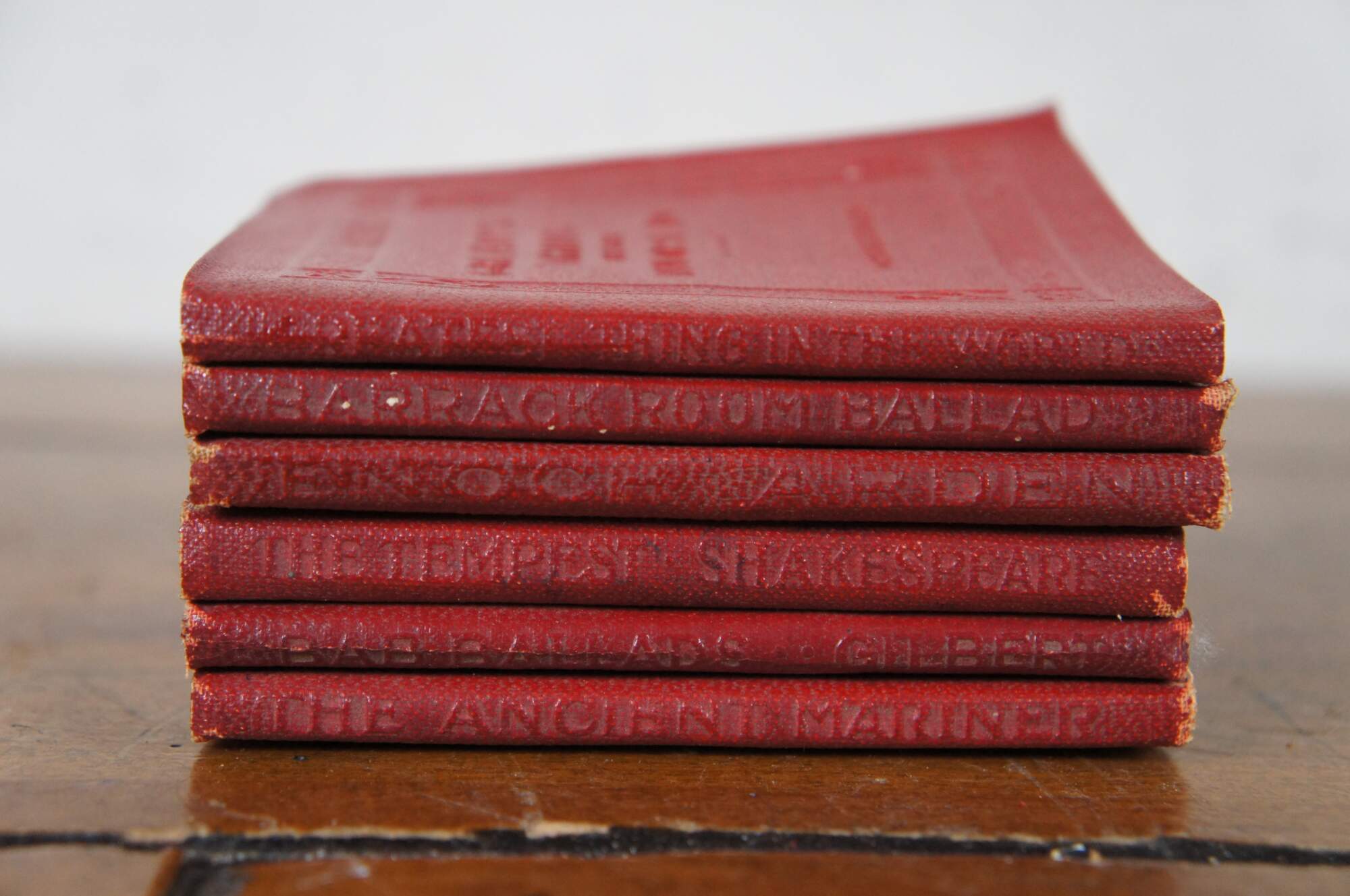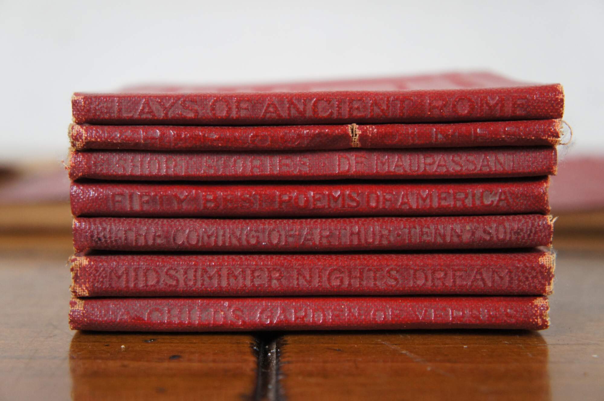 Lays of Ancient Rome, Short Stories Maupassant, Fifty Best Poems of American, The Coming of Arthus Tennison, Midsummer Nights Dream Shakespeare, Childes Garden of Verses, Poems, Courtsh8ip of Smiles Standish, Dr Jekyll and Mr Hyde, Man Without a Country, Salome, The Rubyaiyat of Markhayyam, The Happy Prince, Ballad of Reading, Poems Browning, Will o'th, The Gold Bug Poe, Frindship Thoread, Speeches Washington, Essays Emerson, Greatest thing in the World, Barrack Room Ballad, The Tempest Shakespeare, Bad Ballads Glebert, The Ancient Mariner, Speeches and Addresses of Abraham Lincoln (a few titles were hard to read).