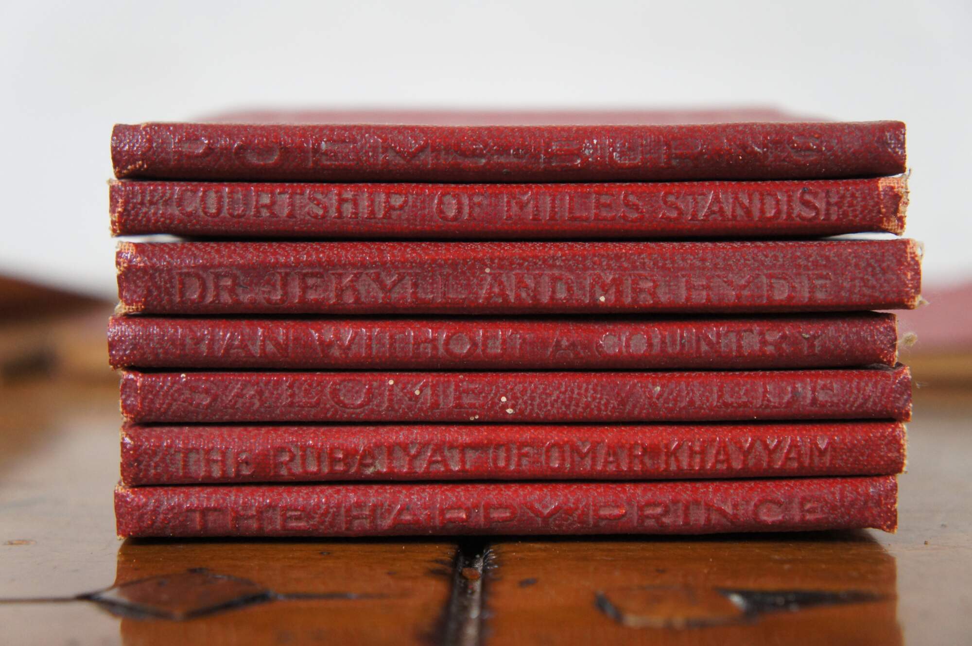 28 Antique Victorian Little Library Books. Feature embossed read leather covers from various famous works / authors.