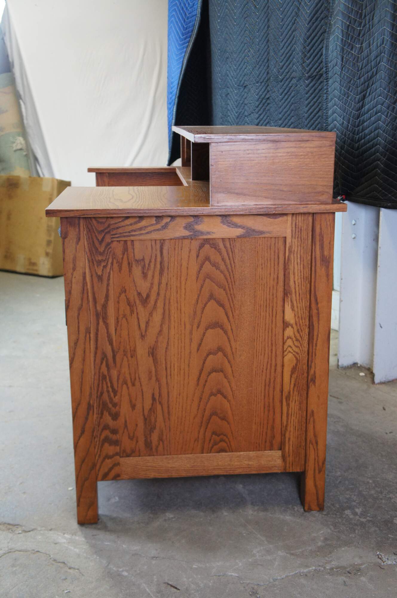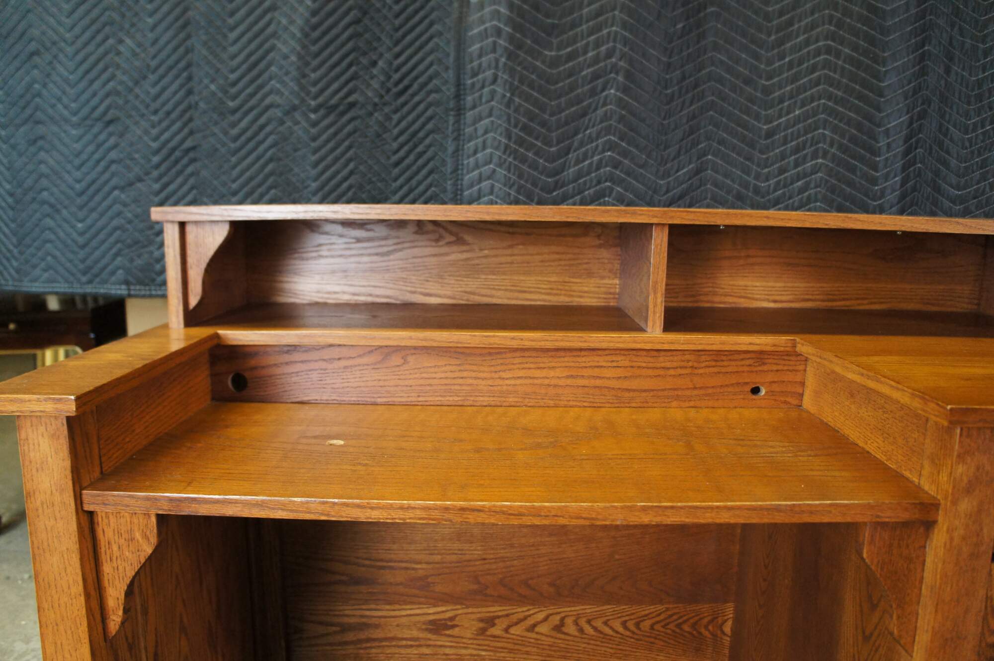 Handmade American craftsman writing desk. Features Mission styling in oak with a central keyboard or laptop area infront of cubbies next to a dovetailed drawer and lower cabinet for desktop tower, books or other collectibles. Working area has holes cut for mouse and keyboard. Lower cabinet backing cutout for desktop tower. A perfect compact option for an office, library or bedroom. Circa 1990s