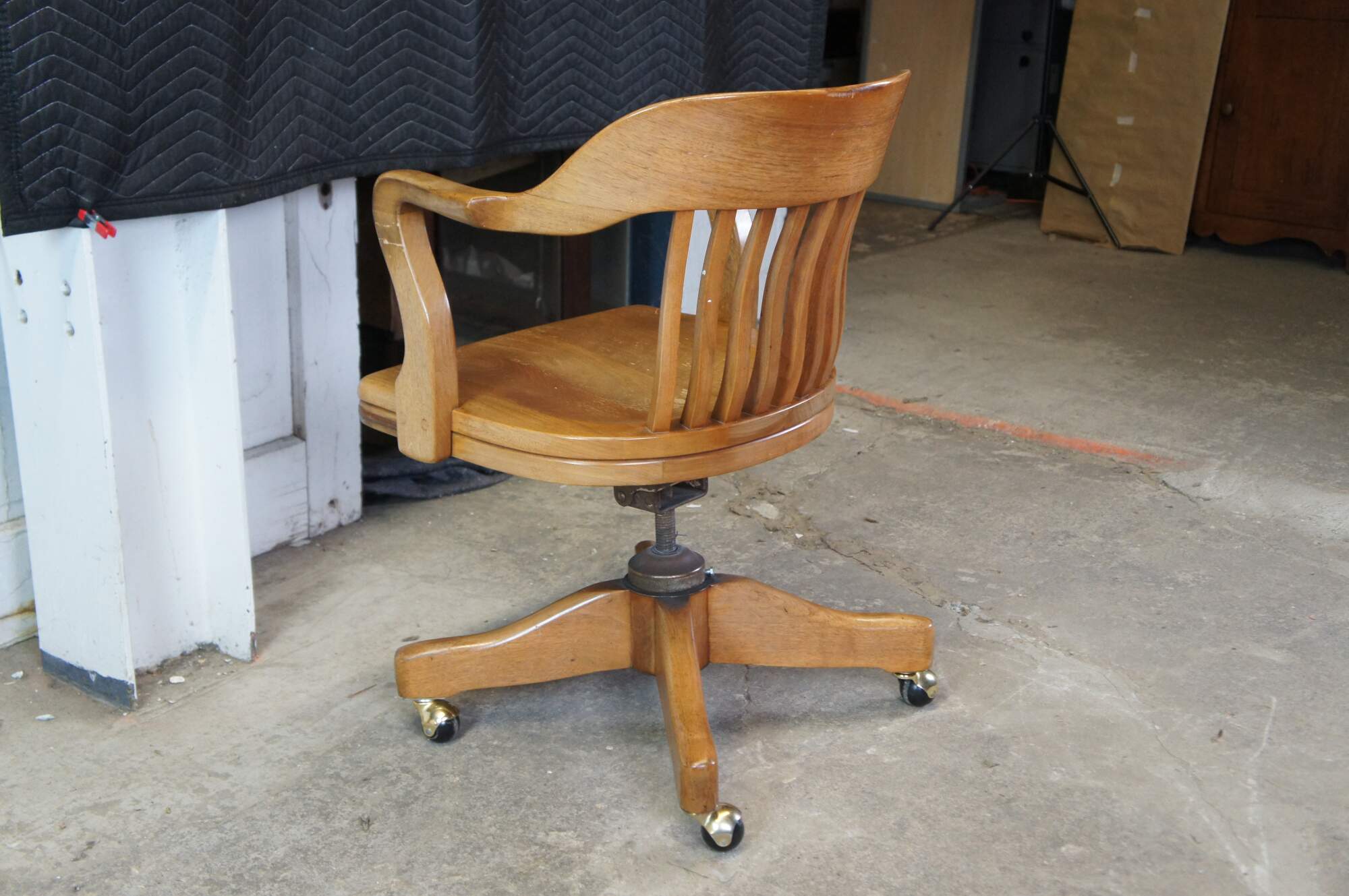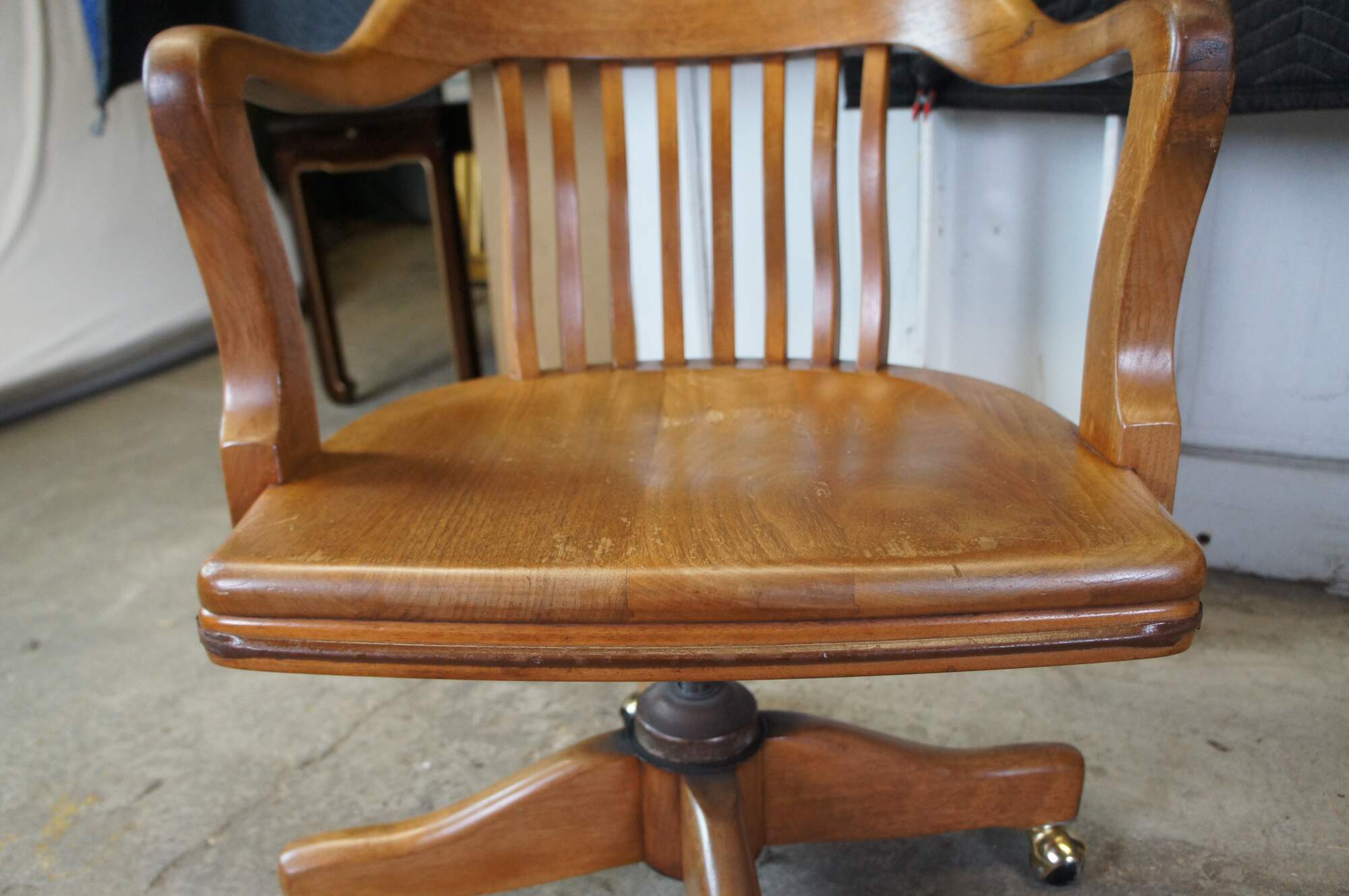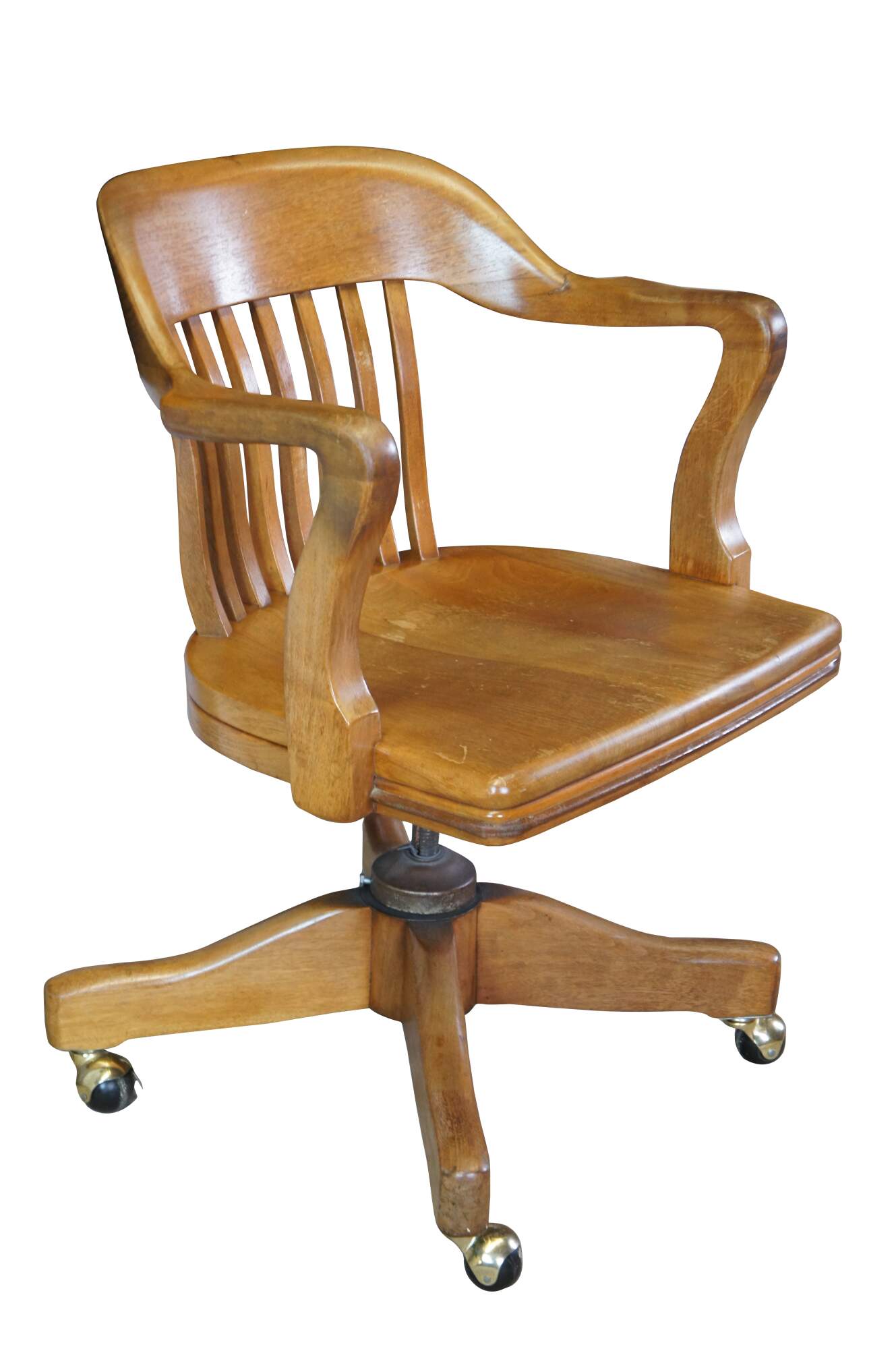 Early 20th Century Antique American Walnut Library Lawyers Desk Chair, circa 1930s. Features a curved back, contoured seat, swivel / leaning mechanism and wheels for ease of moving. The chair is meant to have an adjustable height but currently has a wire in place to keep it from moving.