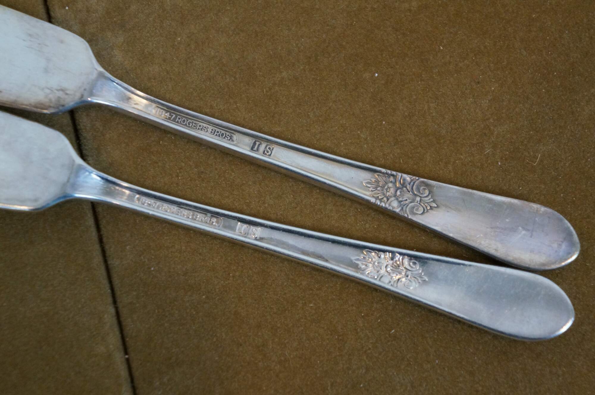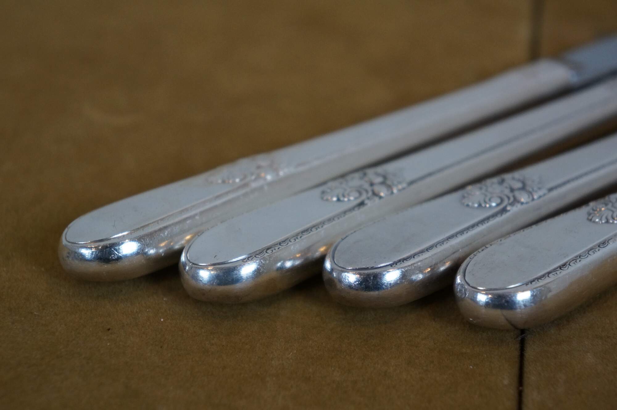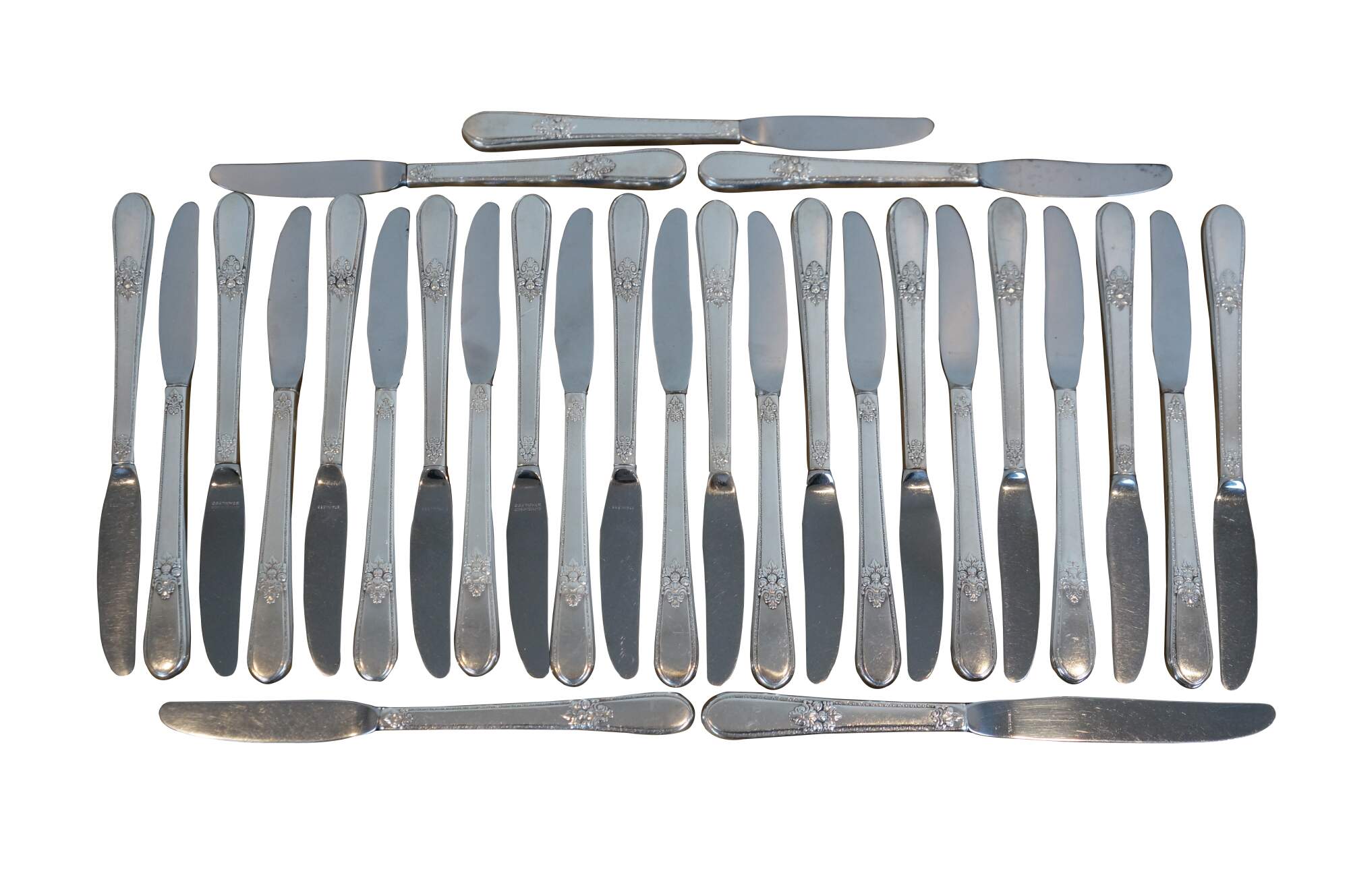 Vintage set of 30 table knives by 1847 Roger Bros in the Adoration pattern (first introduced in 1930). Set includes 28 Table knives and 2 Butter knives / spreaders.