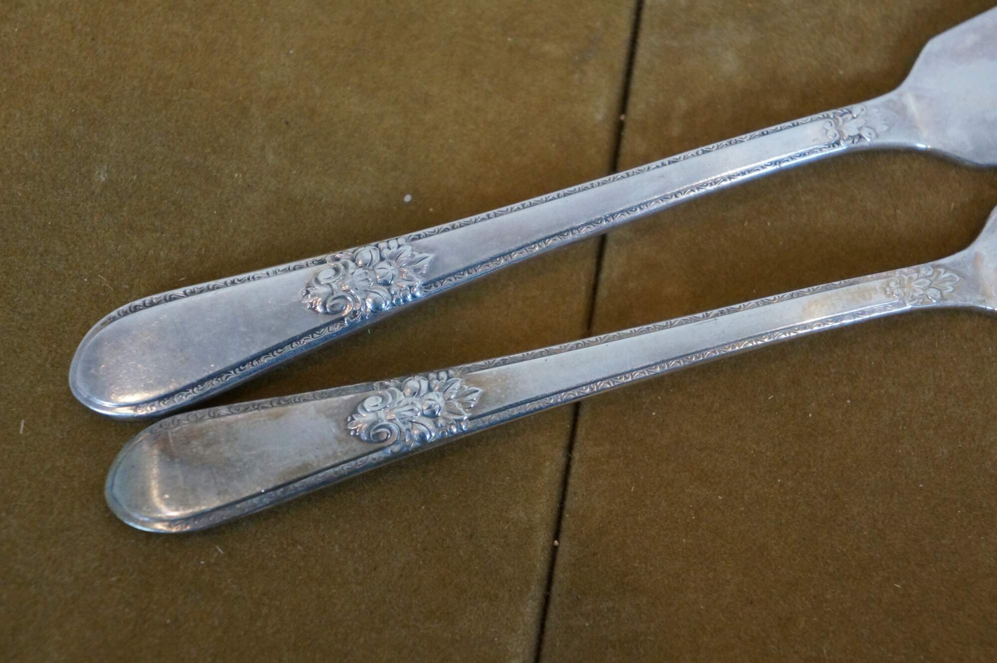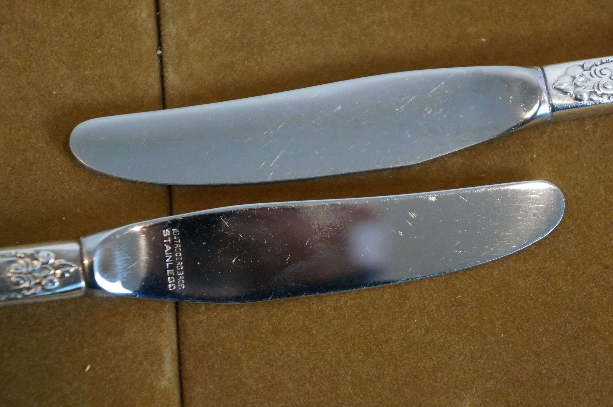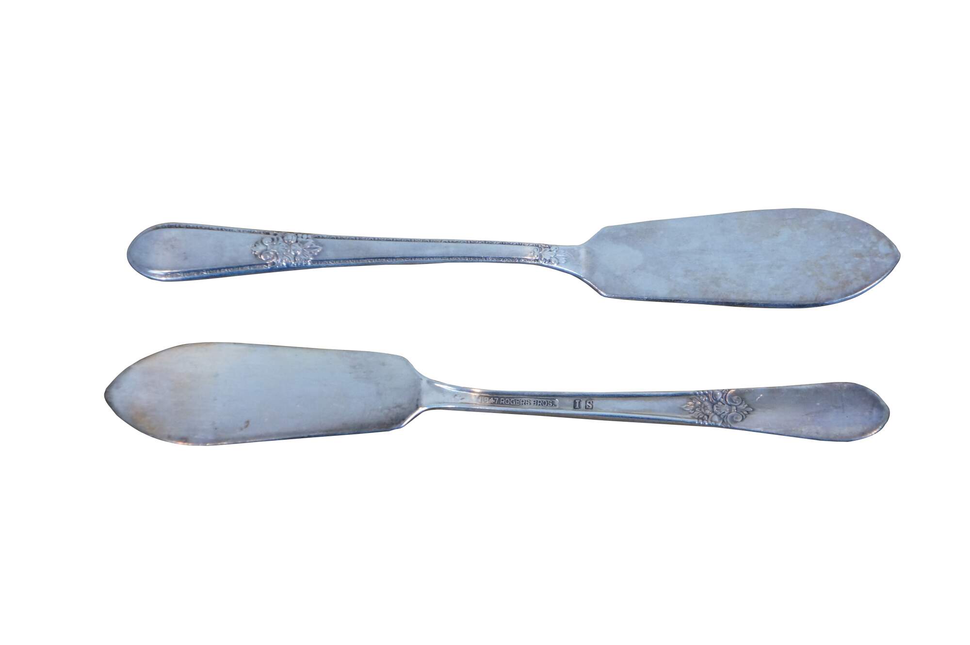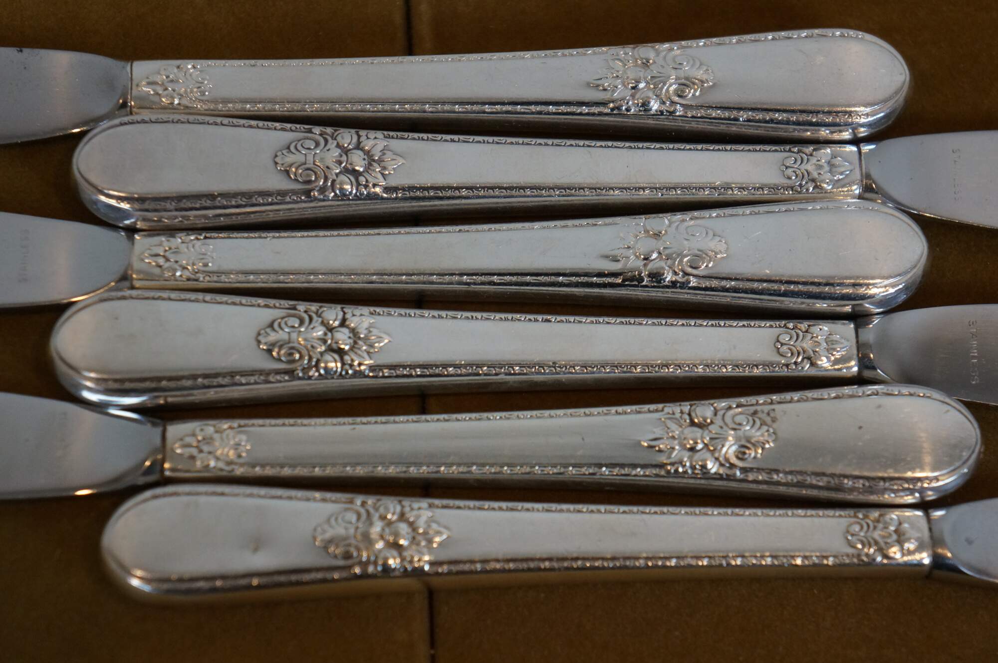 Vintage set of 30 table knives by 1847 Roger Bros in the Adoration pattern (first introduced in 1930). Set includes 28 Table knives and 2 Butter knives / spreaders.