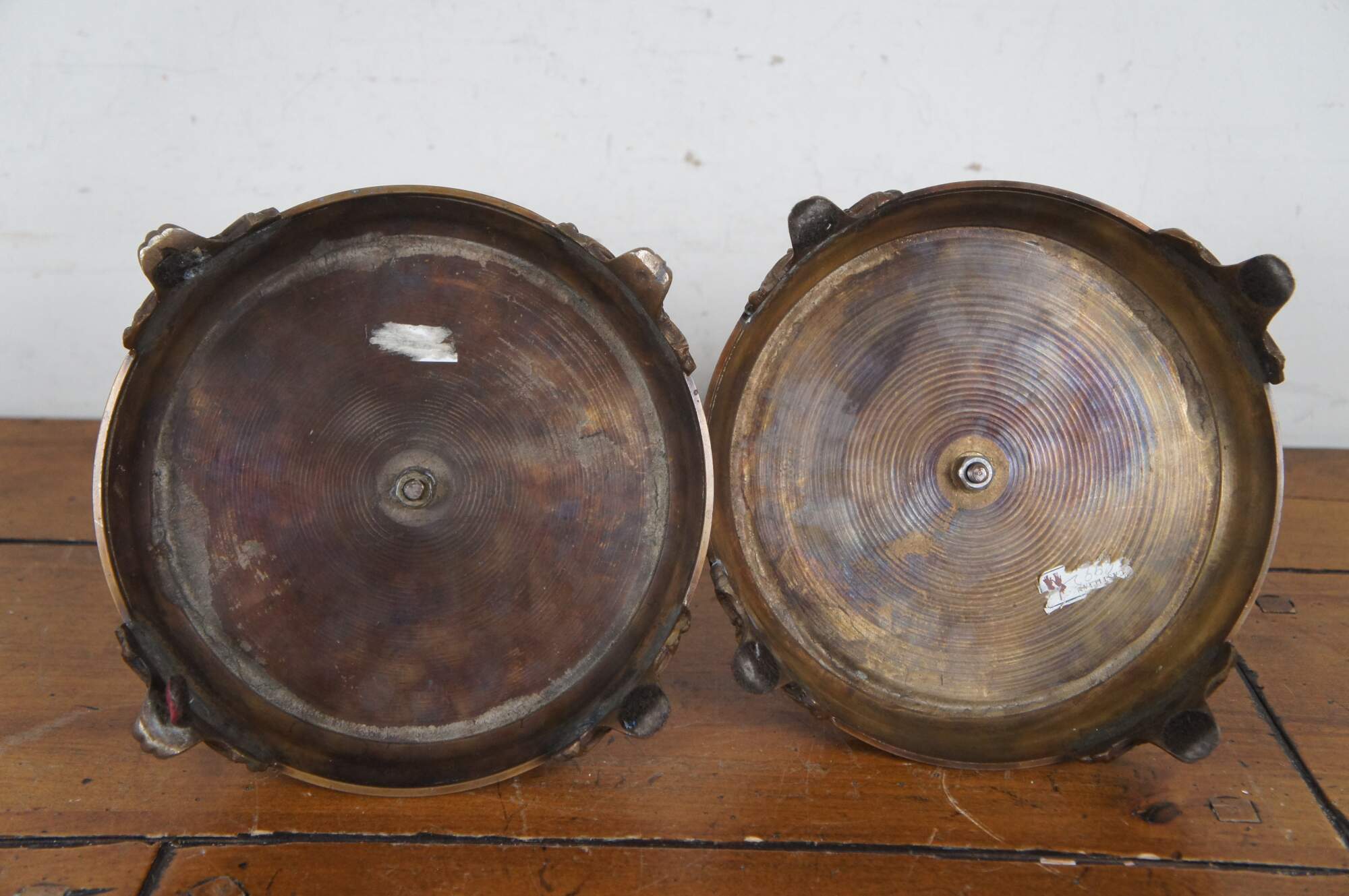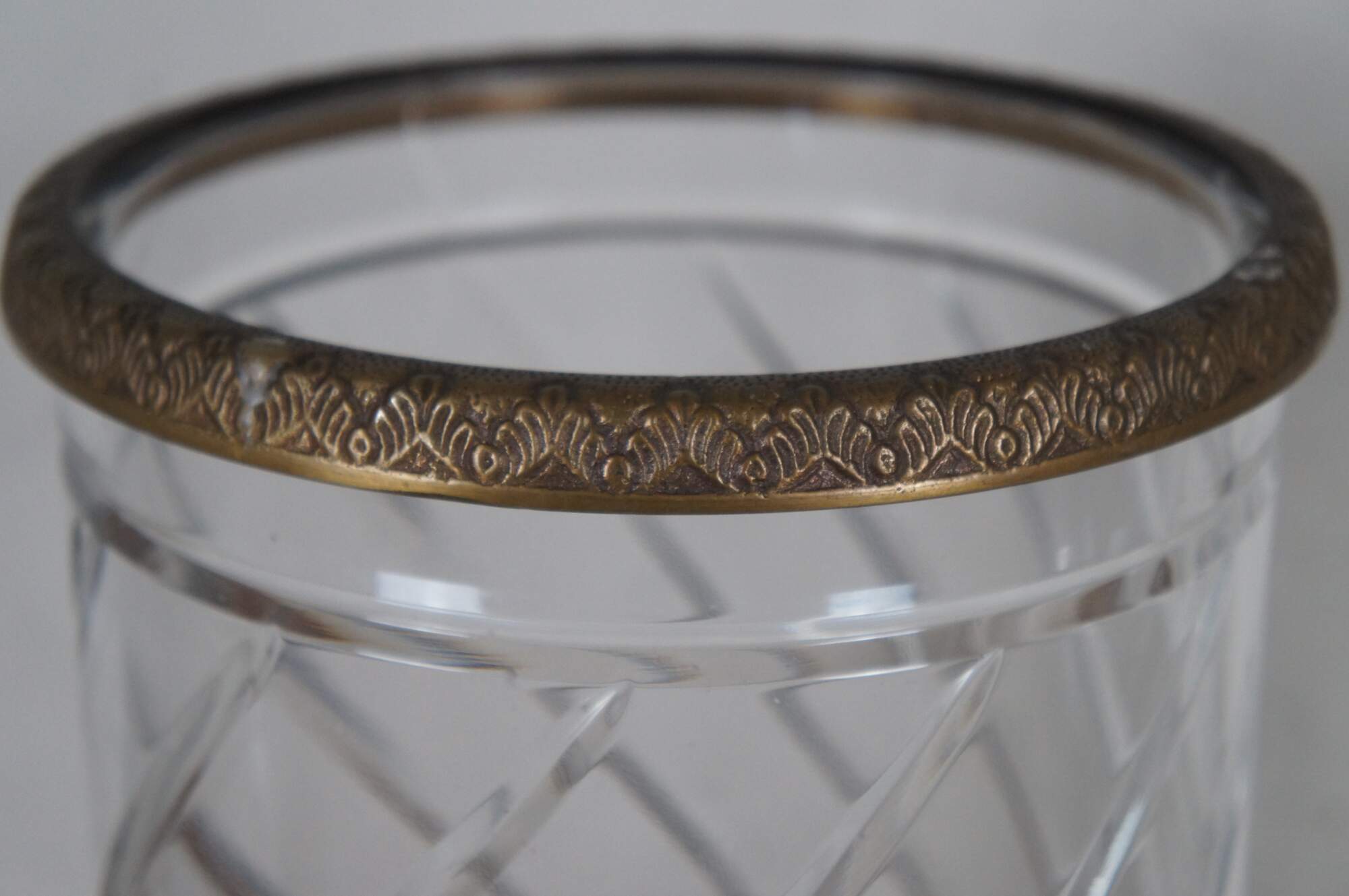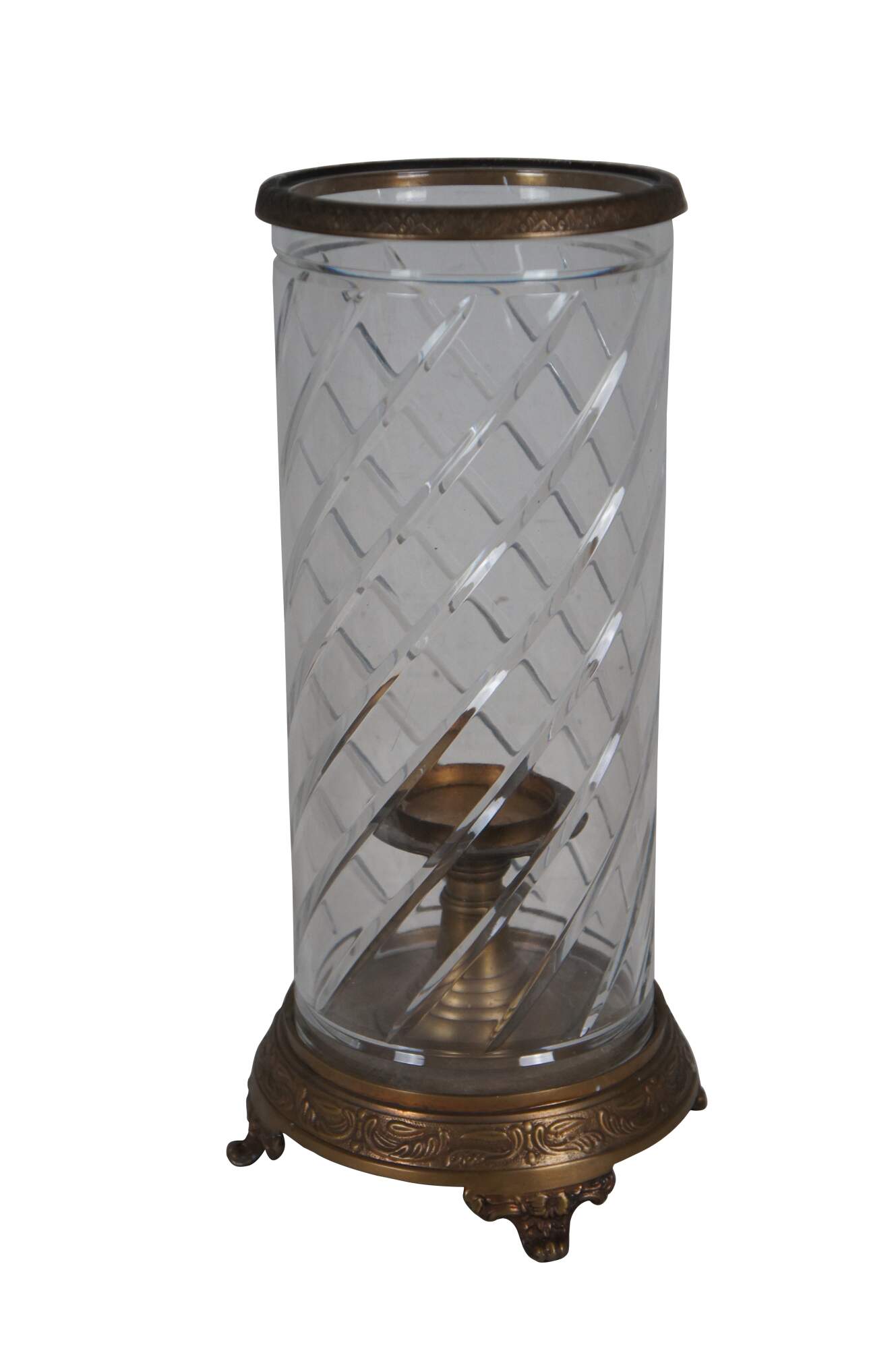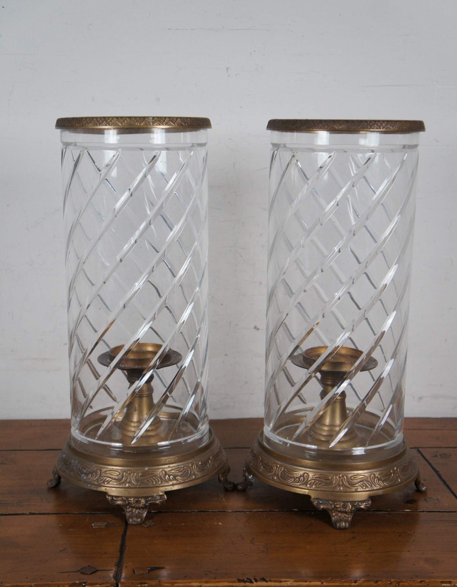 Pair of Castilian Imports brass pillar candle holders - round bases with foliate details and four feet, and spiral cut crystal hurricanes topped with foliate brass rims.