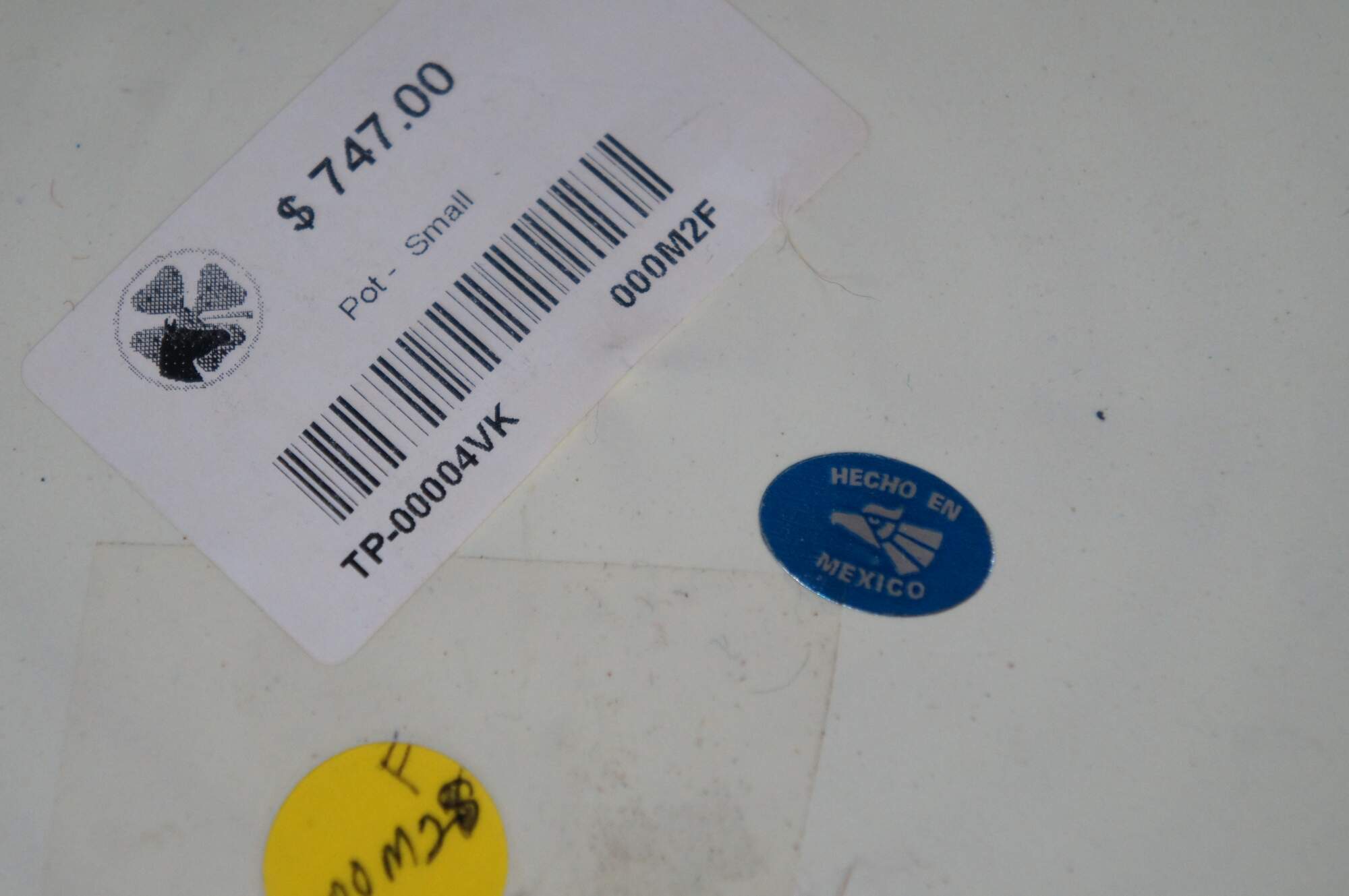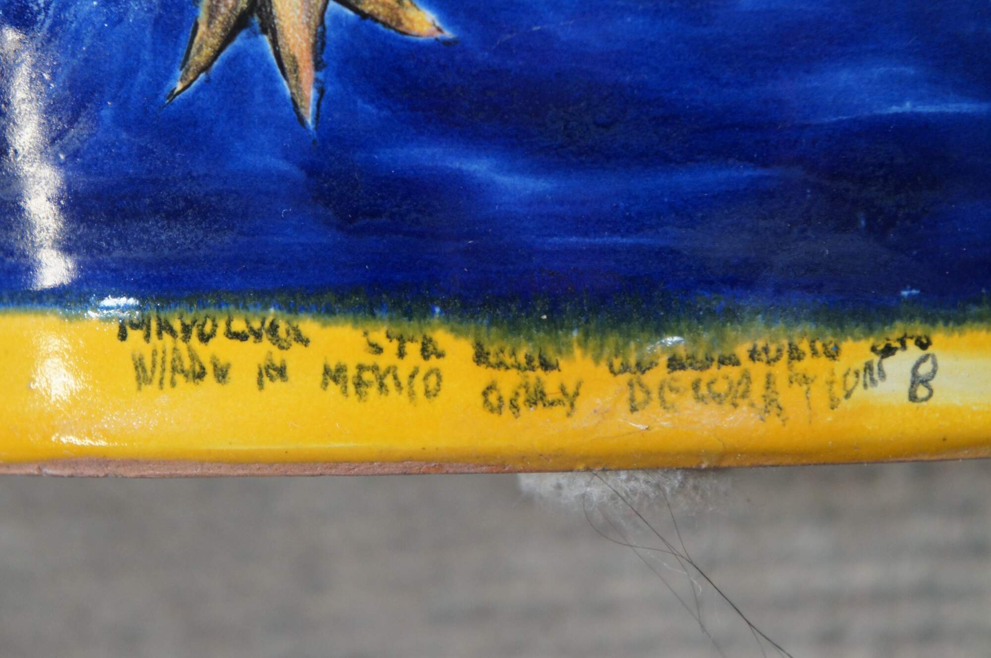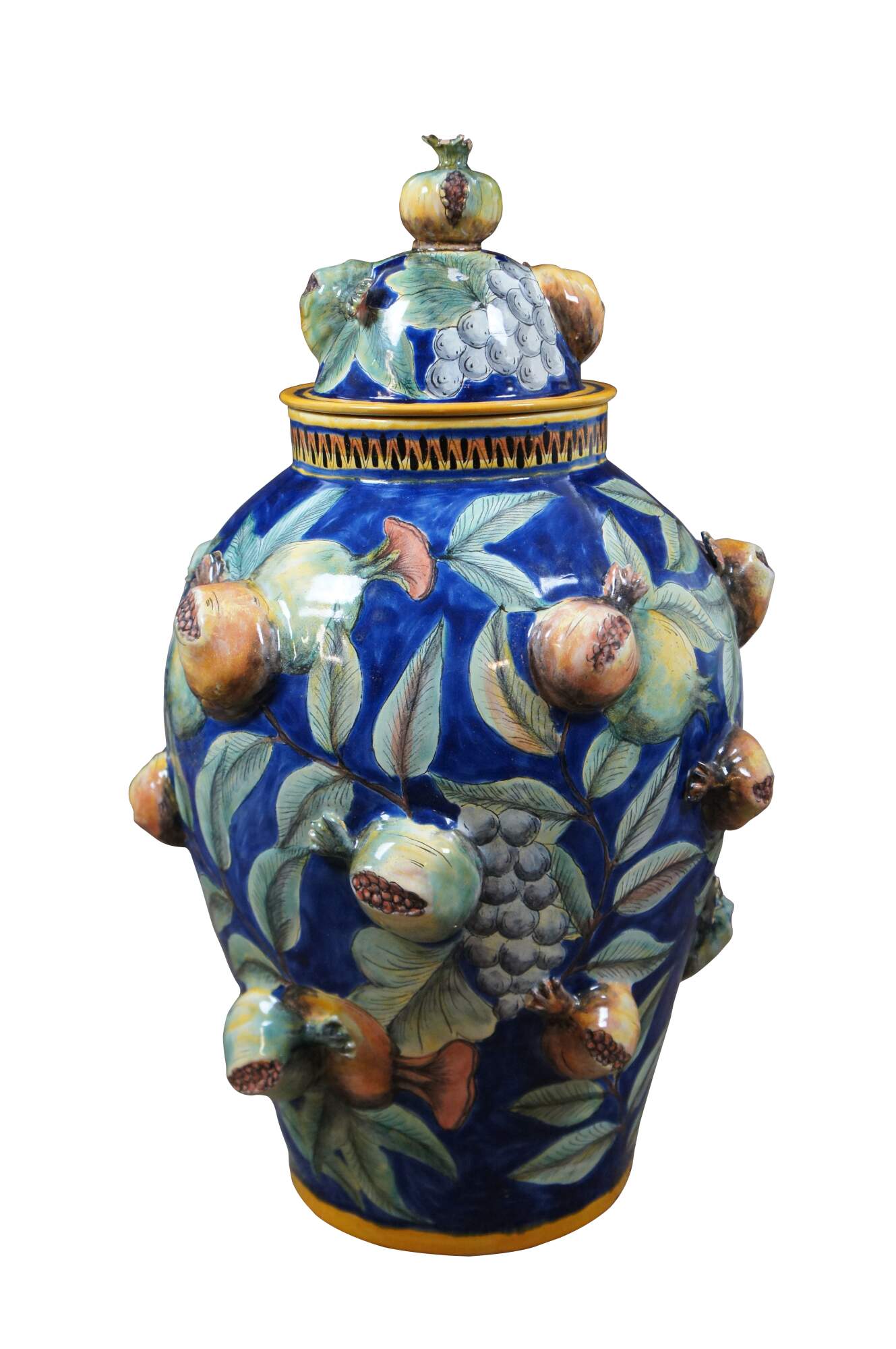 Vintage 20th century Mayolica Santa Rosa lidded pottery urn / floor vase featuring a design of three dimensional hand painted pomegranates over green and brown leaves and grapes on a blue background with yellow trim. Made in Mexico.